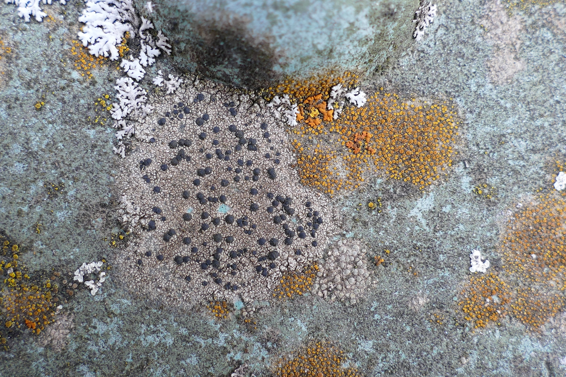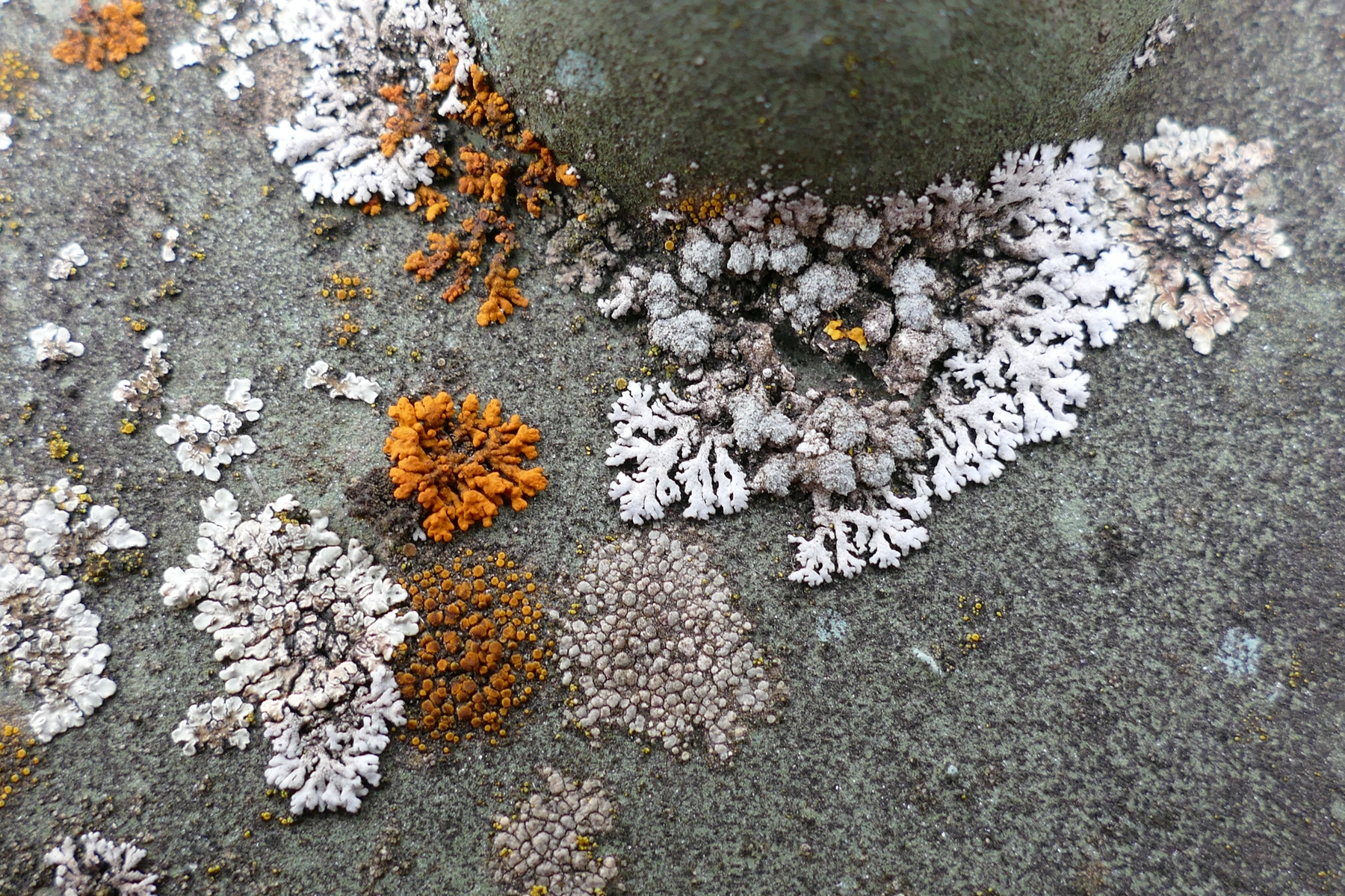 Bild 9: Hübsches Mosaik aus diversen Arten, die typischerweise auf Beton, Kalkstein oder aber staubimprägniertem Silikatgestein vorkommen. Xanthoria elegans, Physcia caesia und Lecanora muralis sind klar. Die zitronengelben kleinen Knubbel (tlw. auch mit Apothecien) am linken Bildrand sollten zu Candelariella aurella gehören. Die Caloplaca im unteren Bildbereich unterhalb der Xanthoria elegans dürfte C. crenulatella sein. Das graue Lager rechts von der Caloplaca scheint mir Aspicilia contorta zu sein.