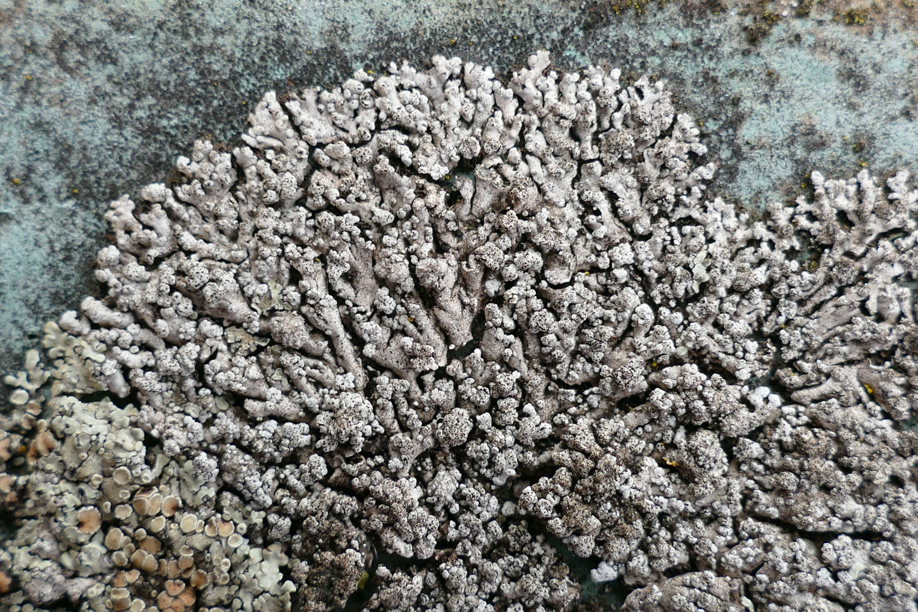 Bild 13: Das sollte Physcia caesia sein, stark verunstaltet durch einen lichenicolen Pilz (vermutlich Polycoccum pulvinatum). Letzterer bildet auf Physcia caesia und Ph. dubia gallenartige Strukturen (Knubbel), die zahlreiche eingesenkte schwarze Perithecien tragen, die nur mit der Spitze (dem Scheitel) rausragen. Lässt sich mikroskopisch gut ansprechen. Wenn Du das Bild stark vergrößerst siehst Du überall auf dem Thallus zahlreiche schwarze Punkte (die mutmaßlichen Scheitel der eingesenkten Perithecien des mutmaßlichen Pilzes...) .