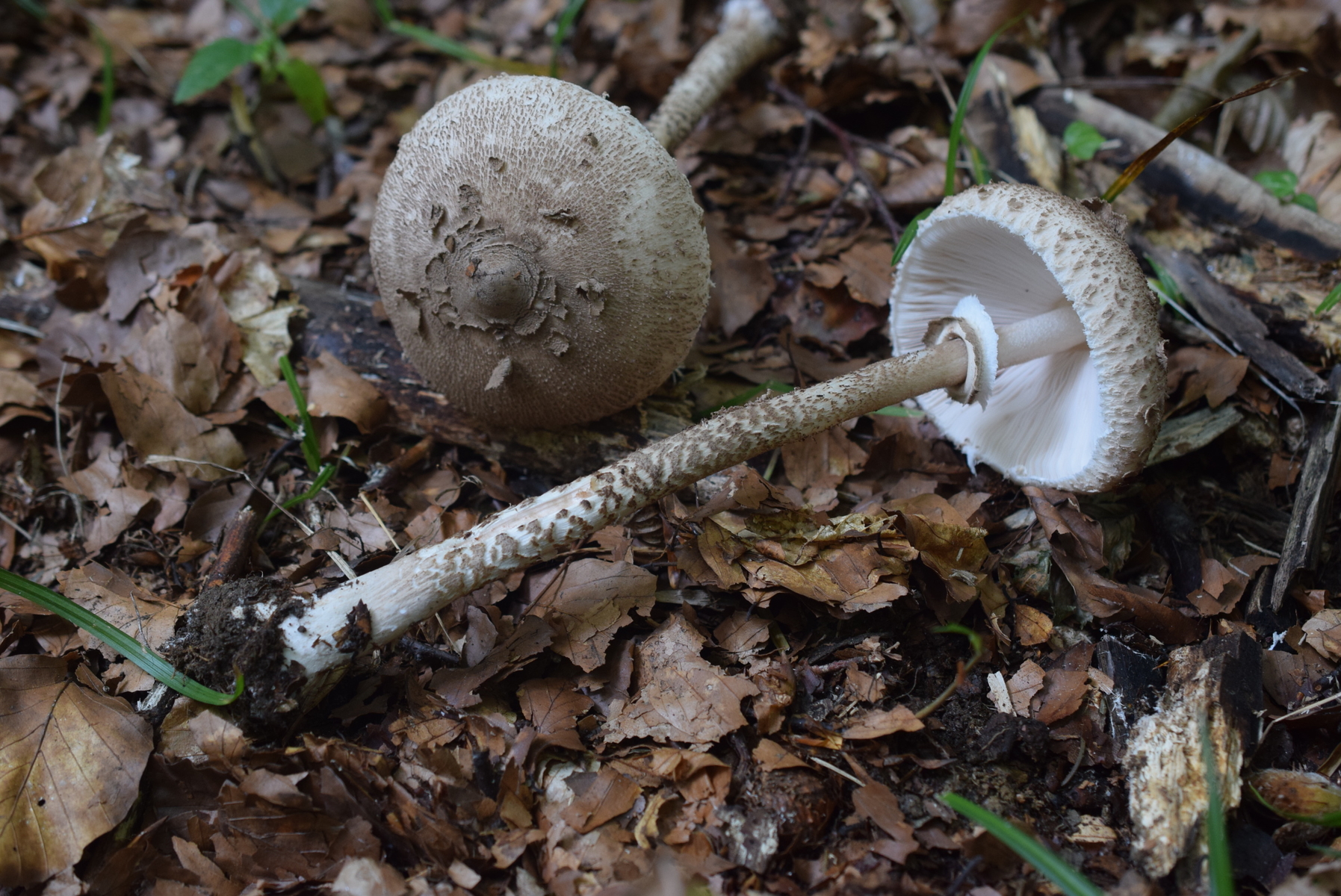 Macrolepiota ist klar. Schaut mit den leicht ablösenden Hutschuppen und der nur angedeuteten Stielnatterung nach M. rhodosperma aus.