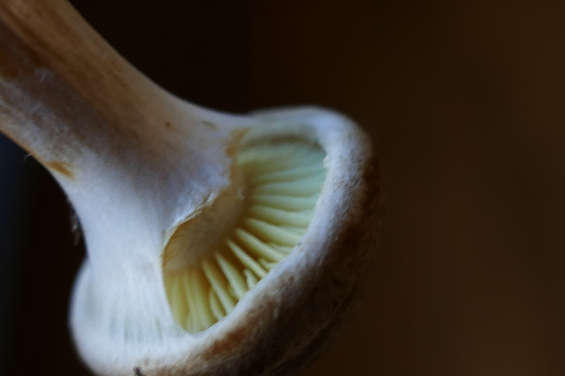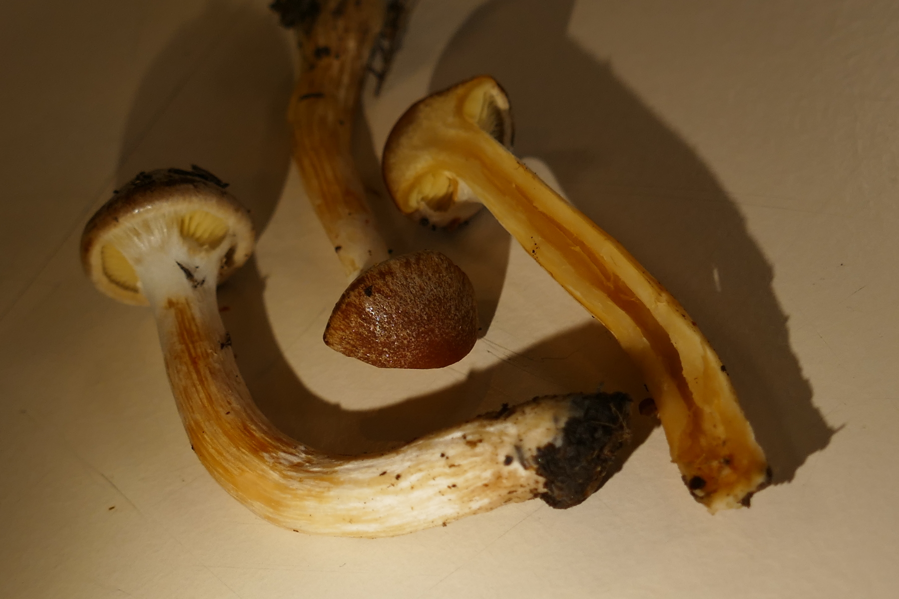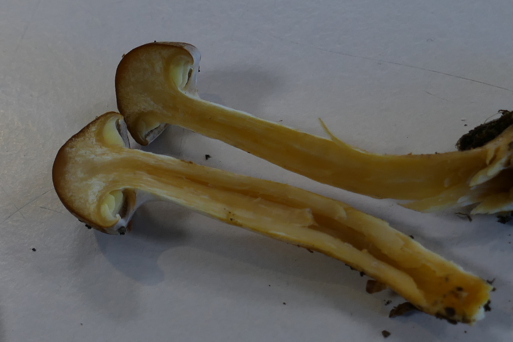 Auffällig sind die gelben Lamellen, welche durch eine weisse Cortina bedeckt sind.
