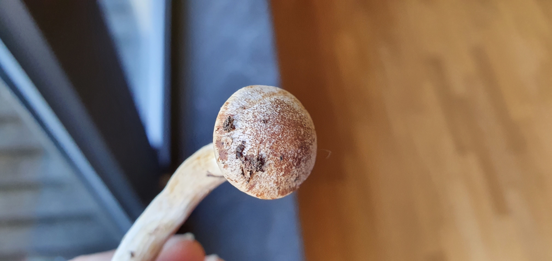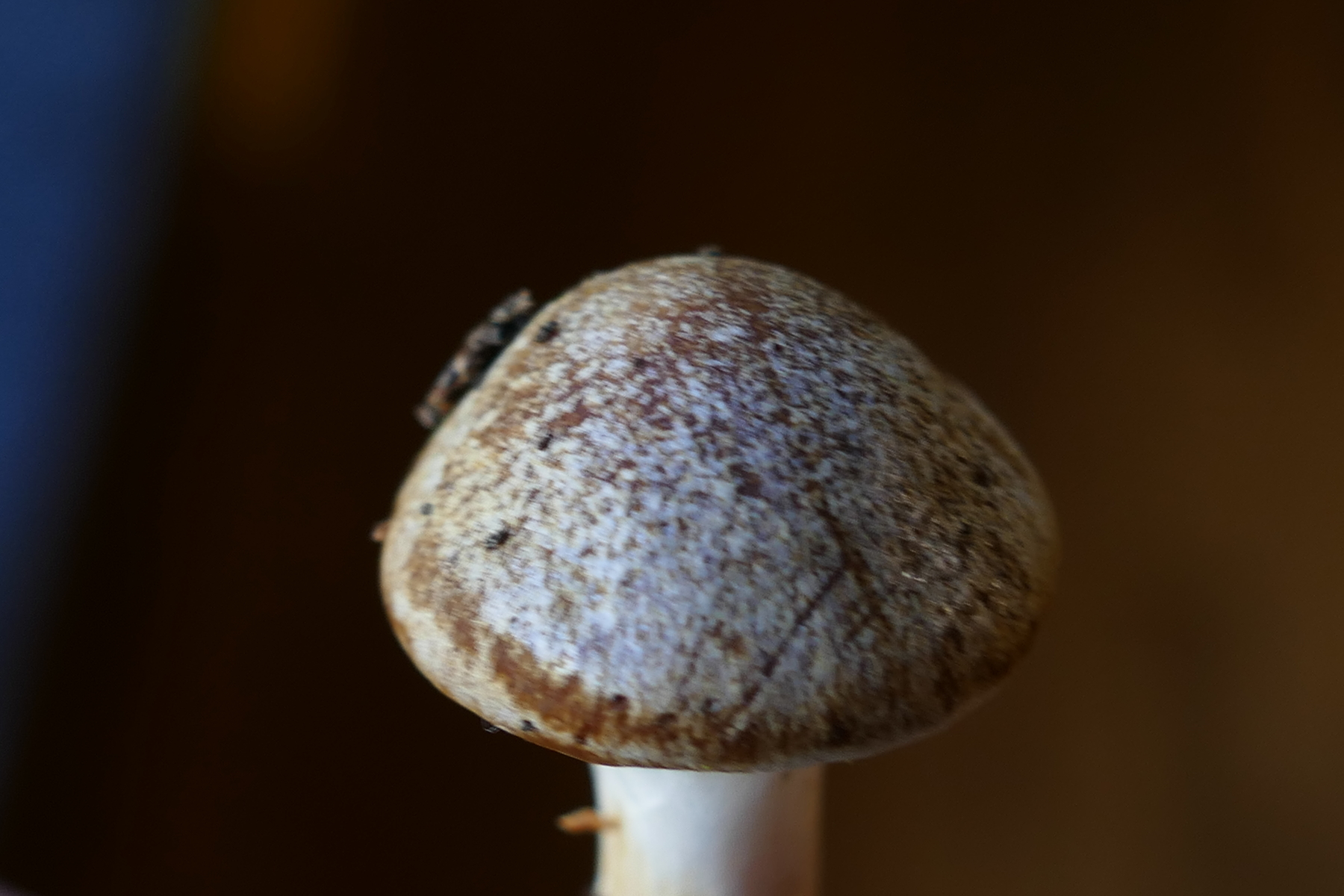 Der Hut hat eher dunkelrotbraune Farben und ist durch das Velum weissbeflockt.