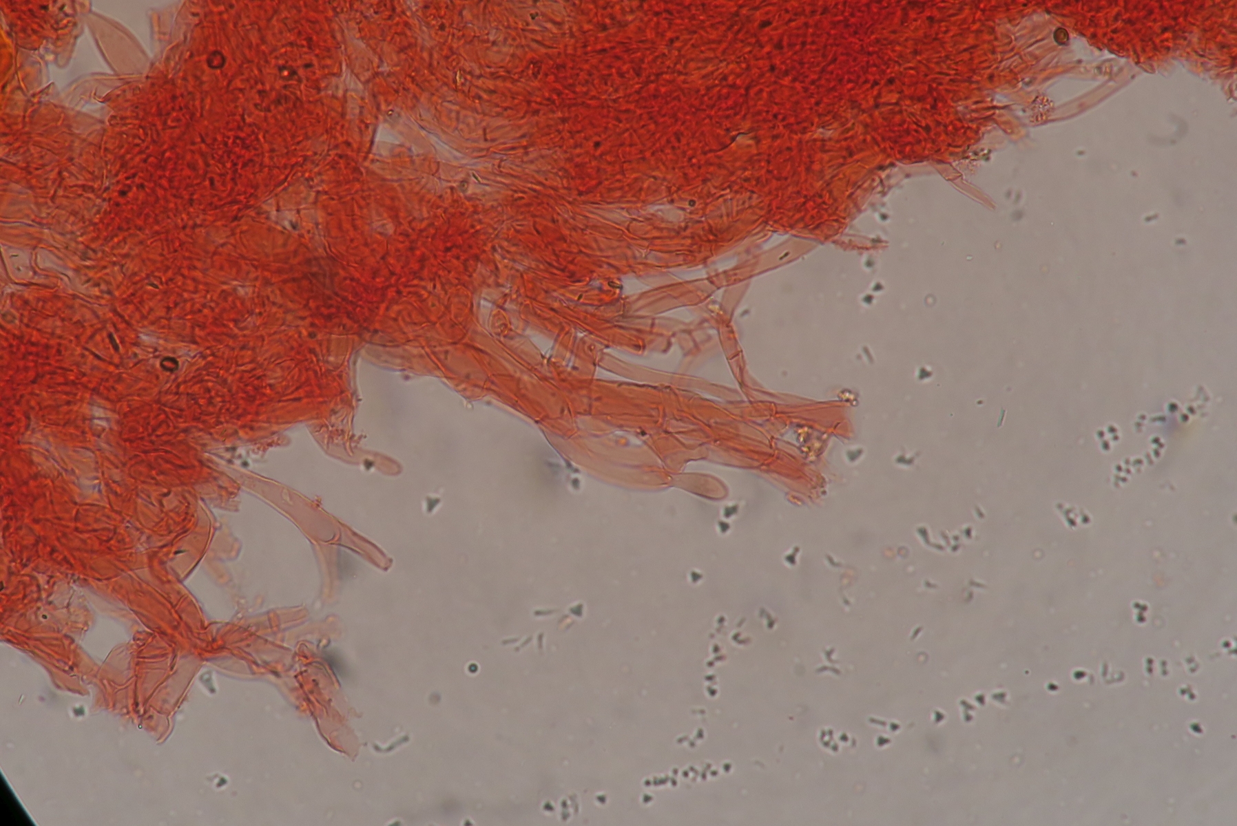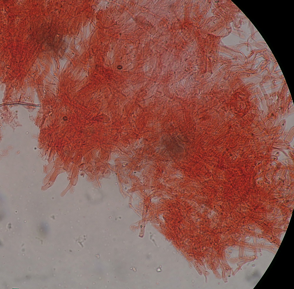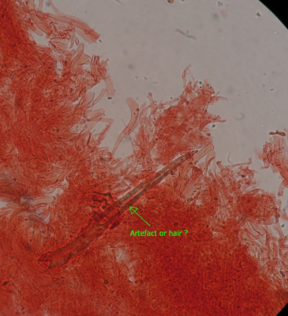 Uwe and others who are interested in this fungus, I had time to carry out the examination of the pileipellis. Many parts did not preserve well, but I could see a trichoderm of wavy or almost straight cylindrical hyphae, hyaline, with terminal cells having a very obtuse or truncate ending, and I could not see any clamp junctions.