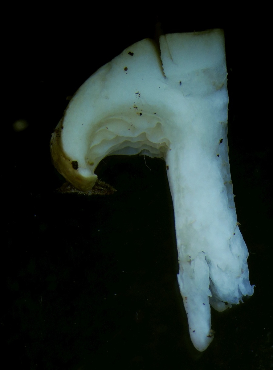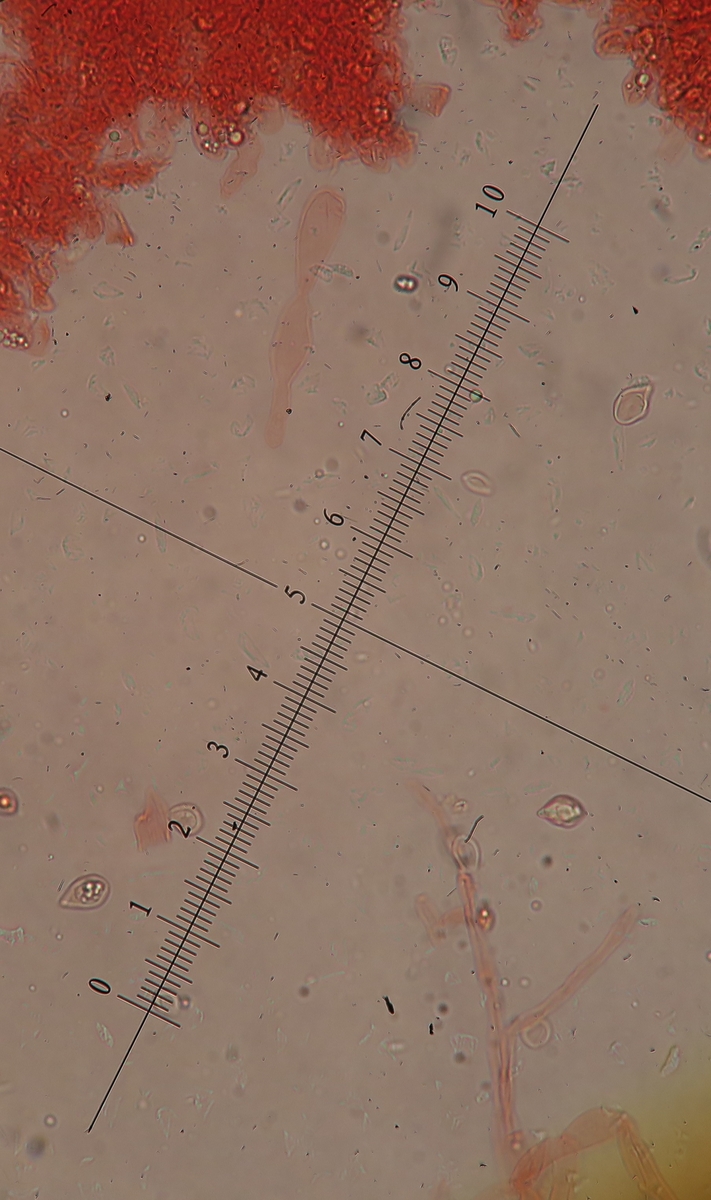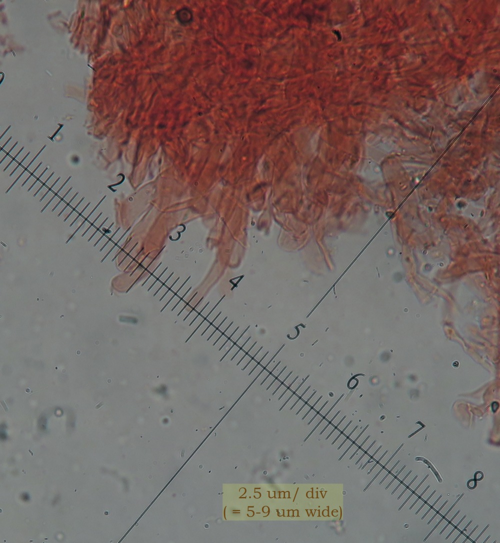 Uwe and others who are interested in this fungus, I had time to carry out the examination of the pileipellis. Many parts did not preserve well, but I could see a trichoderm of wavy or almost straight cylindrical hyphae, hyaline, with terminal cells having a very obtuse or truncate ending, and I could not see any clamp junctions.