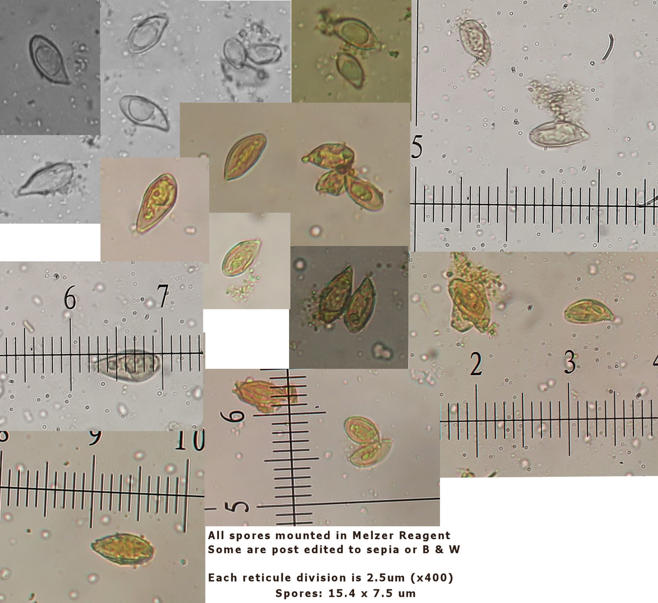 2. The spore size is larger than in the first examination, and they average 15.5 x 7.5um.