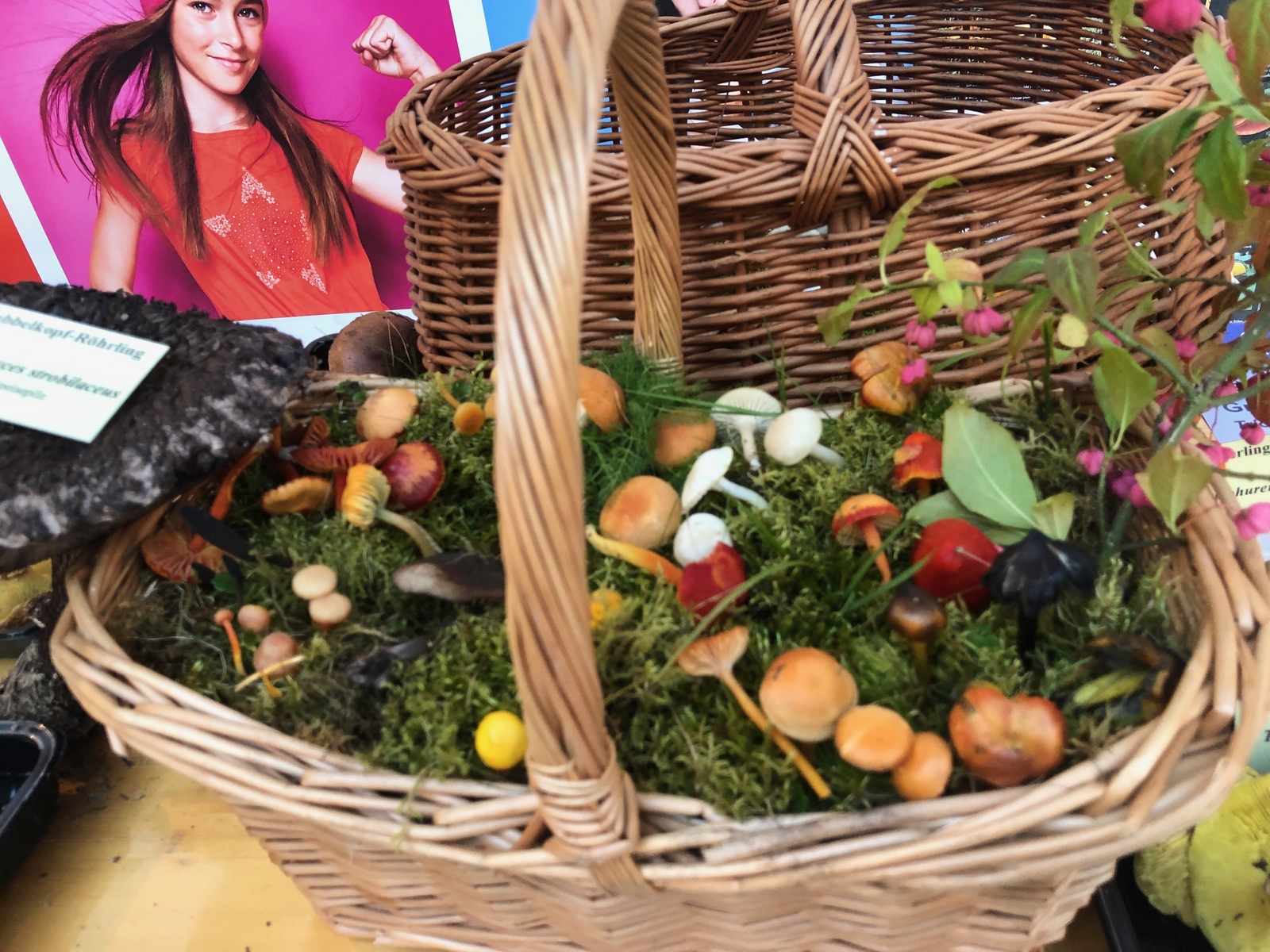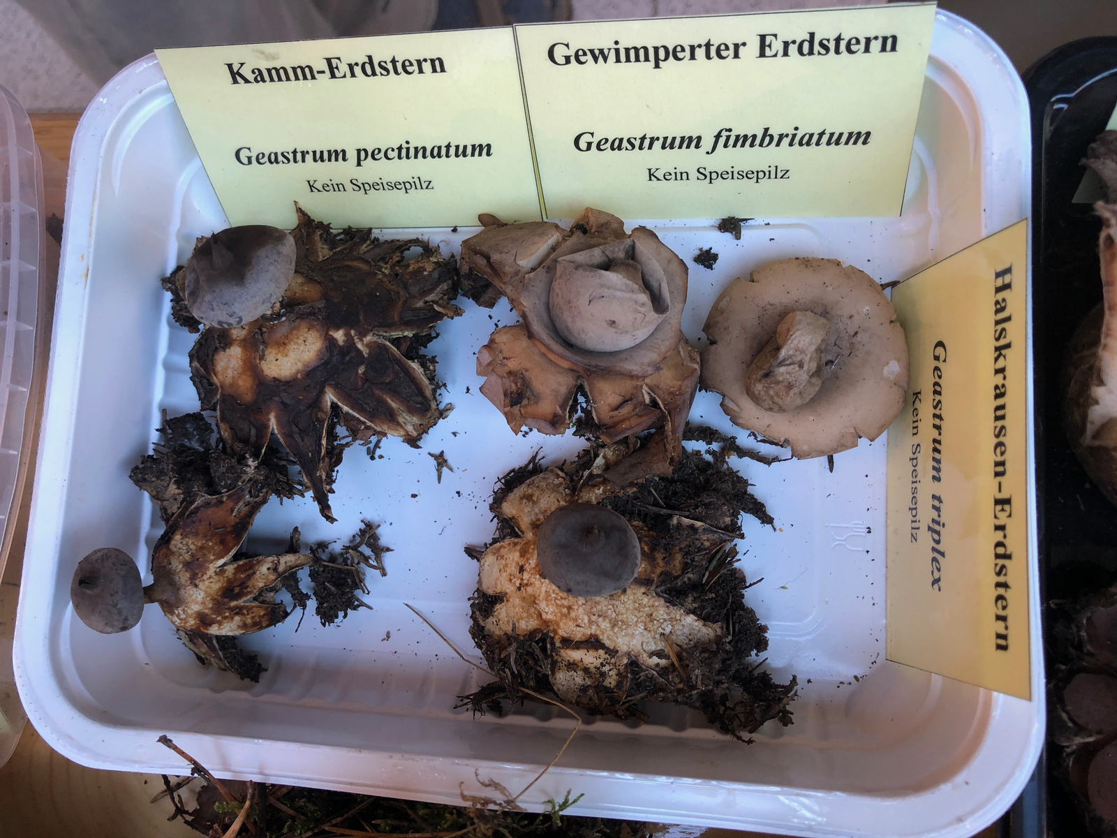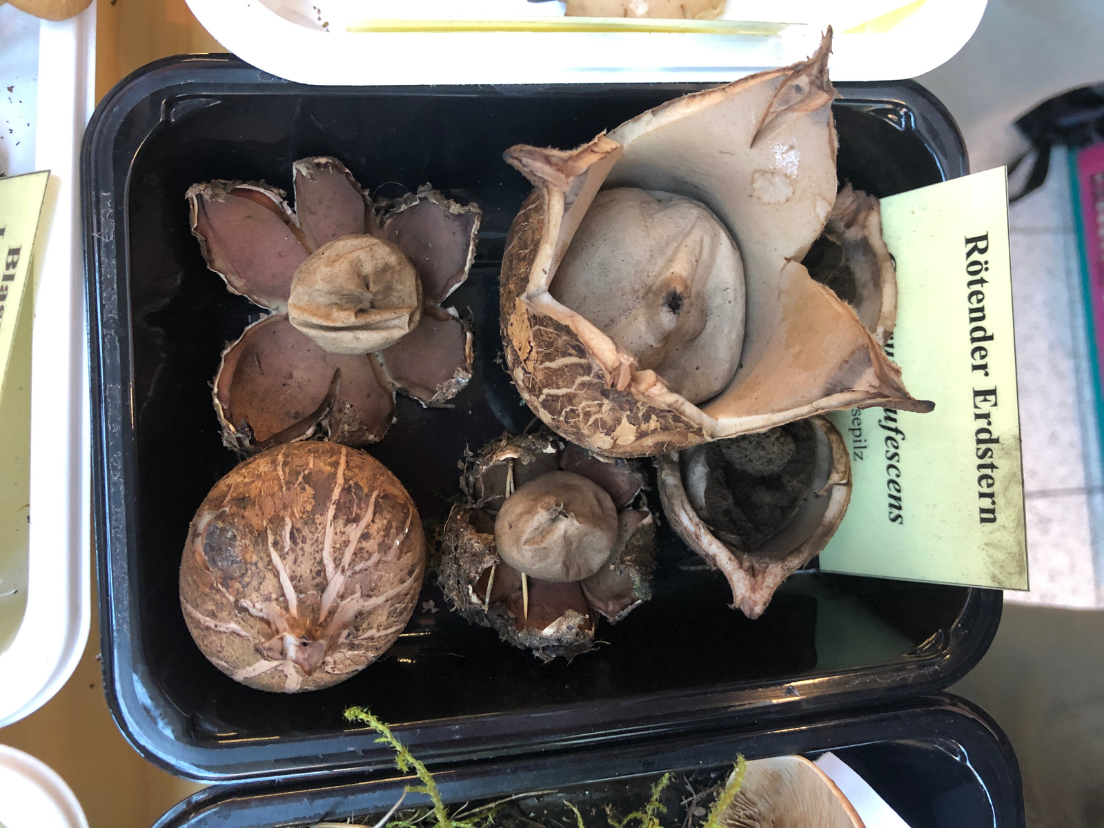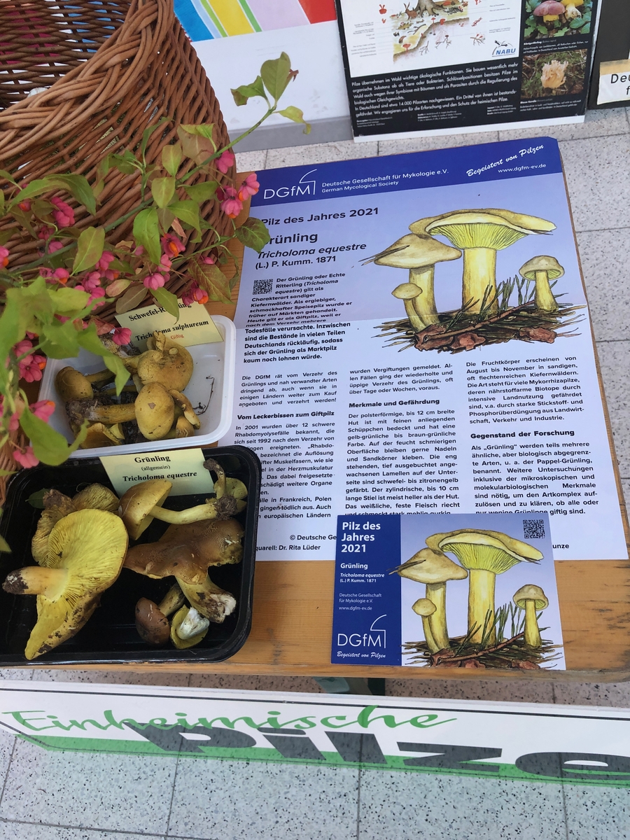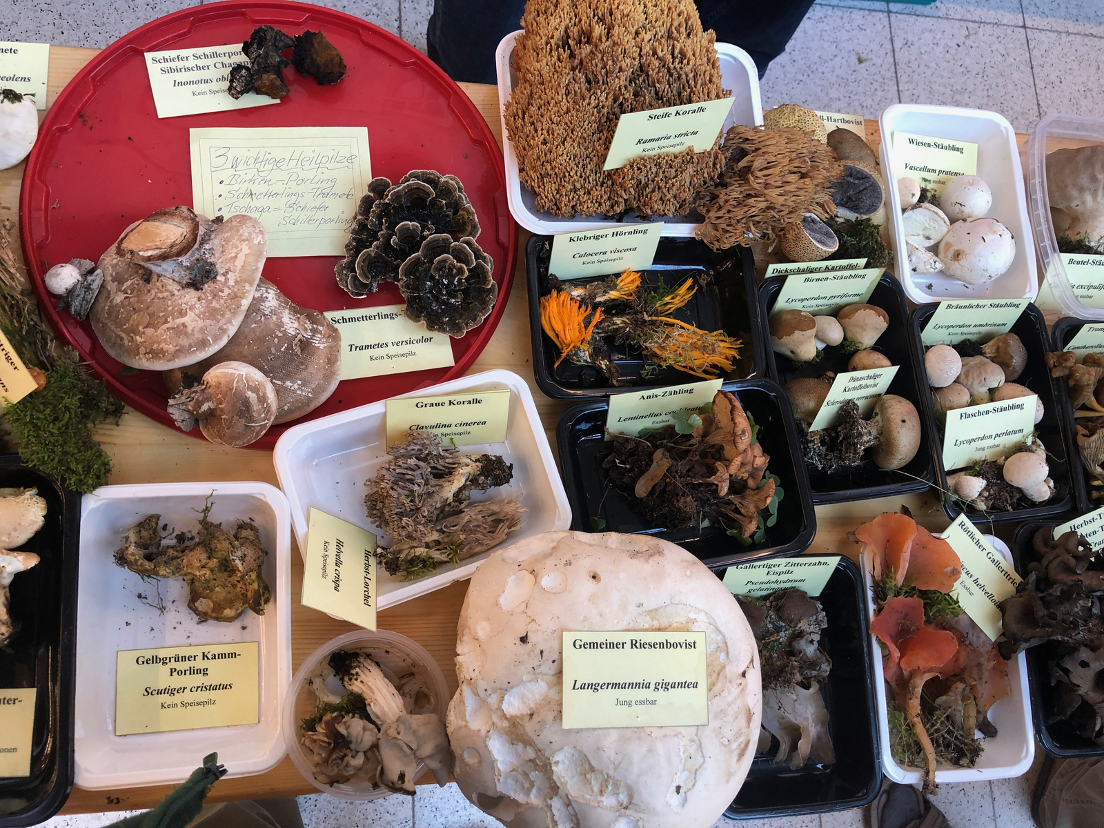 Um einigermaßen ansehnliche Exemplare zu finden, musste ich Donnerstag und Freitag jeweils Such-Halbmarathons absolvieren. Die Anderen hatten erfreulicherweise größeres Glück beim Sammeln und so konnten wir ca. 250 Arten ausstellen. Mit einer größeren Ausstellungsfläche hätten wir es wieder auf 300 gebracht. So mussten viele Baumpilze im Auto und vor allem Schleierlinge backstage bleiben. Zu einem rätselhaften Kandidaten werde ich nachher wohl gesondert eure Meinung einholen müssen.