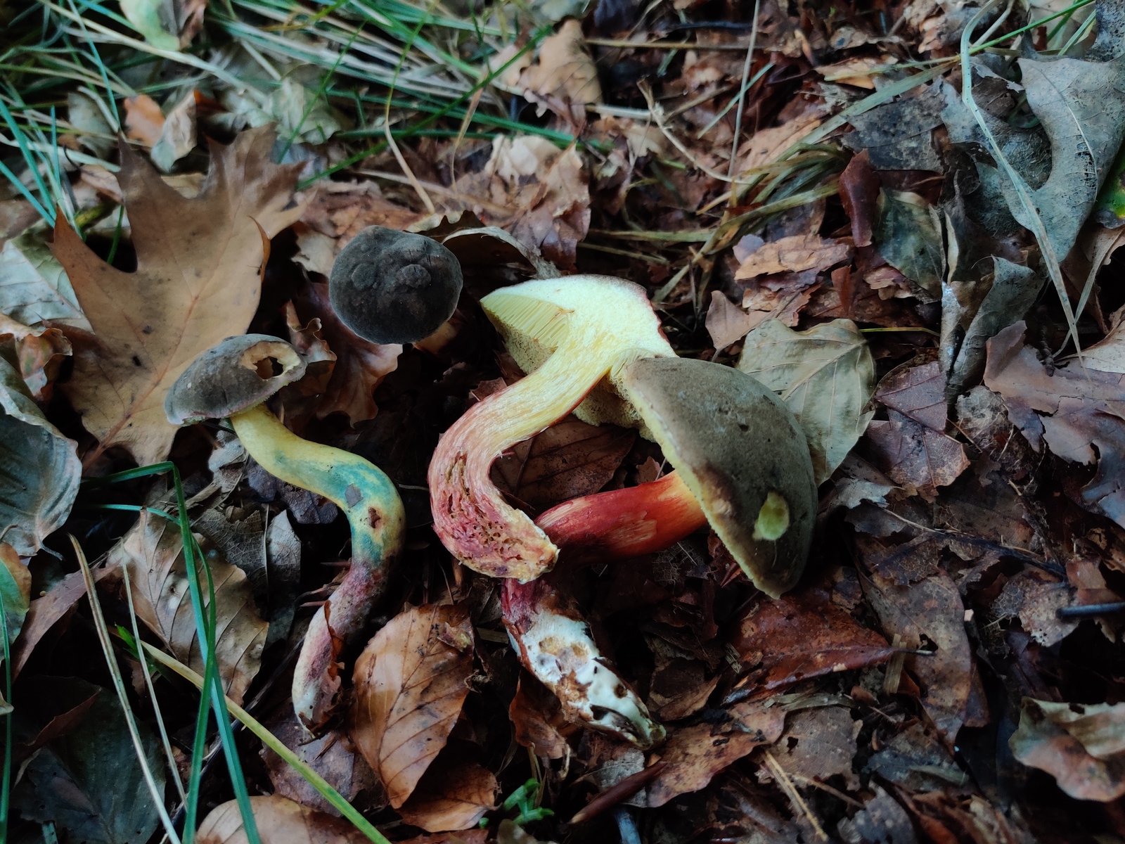 die folgenden Pilze halte ich ziemlich sicher für X. pruinatus. Jedoch verunsichern mich das rote Stielfleisch des größten Exemplars und der stark blauende Stiel des linken Exemplars.