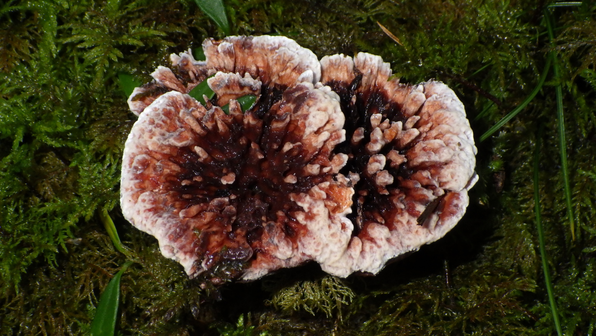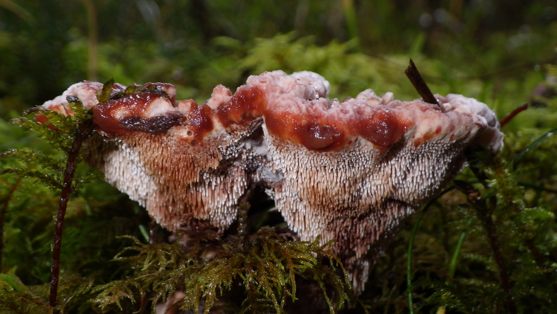 1) Scharfer Korkstacheling, Peck´s Korkstacheling, Blutender Korkstacheling Hydnellum peckii. Den habe ich zuvor noch nie entdeckt! Die "blutigen" Ausschwitzungen Guttationstropfen sahen aus wie Erdbeerkonfitüre!