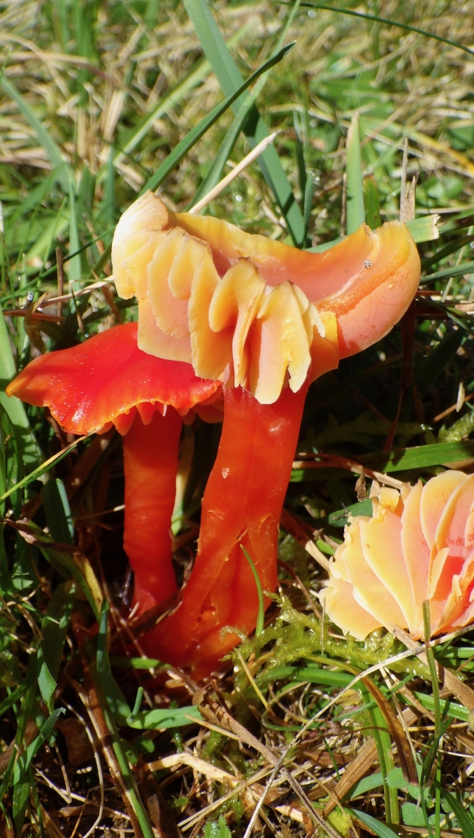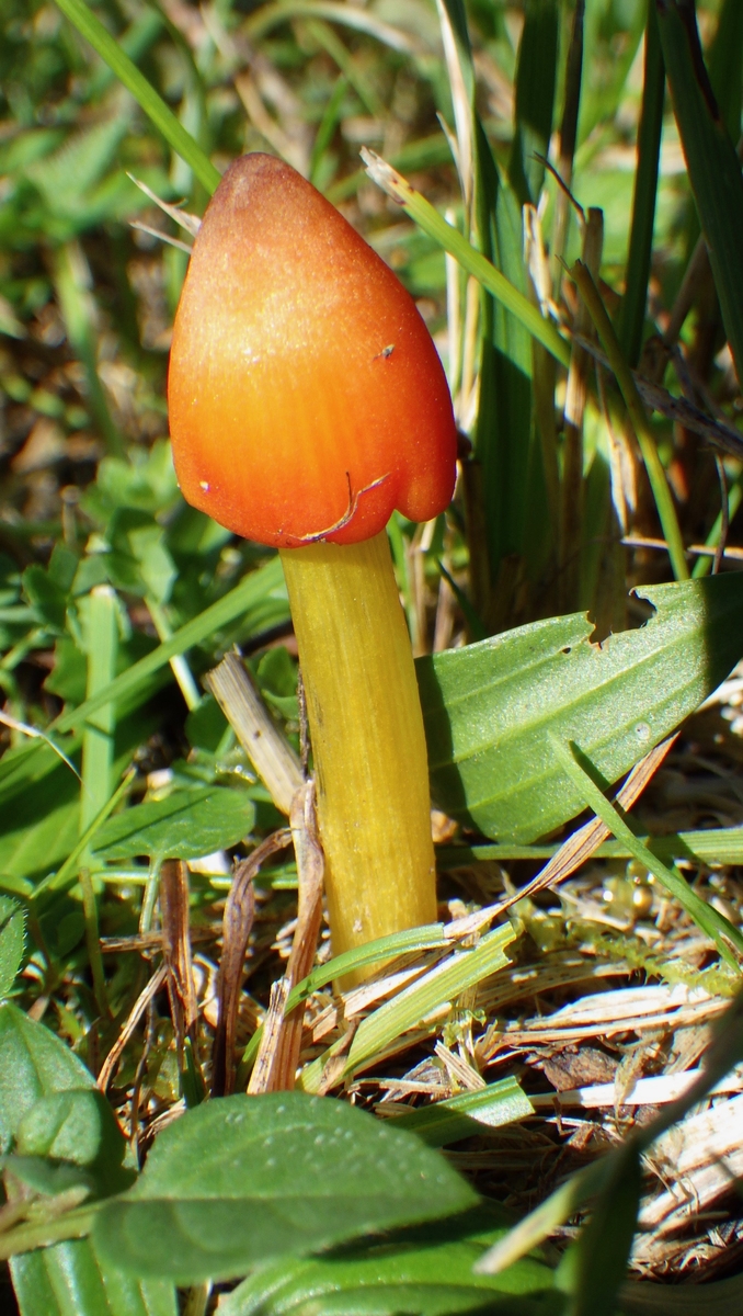 8) Kegeliger Saftling Hygrocybe conica var.pseudoconica, auch auf der gleichen Wiese wachsend, Hut kegelig und Stiel gelblich