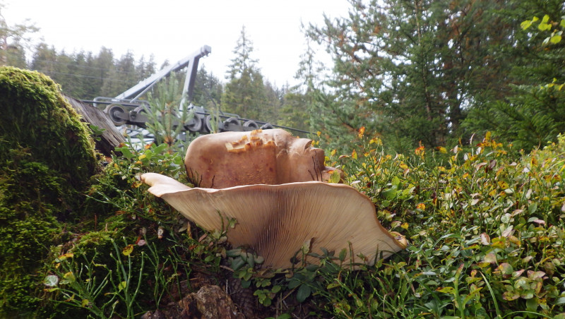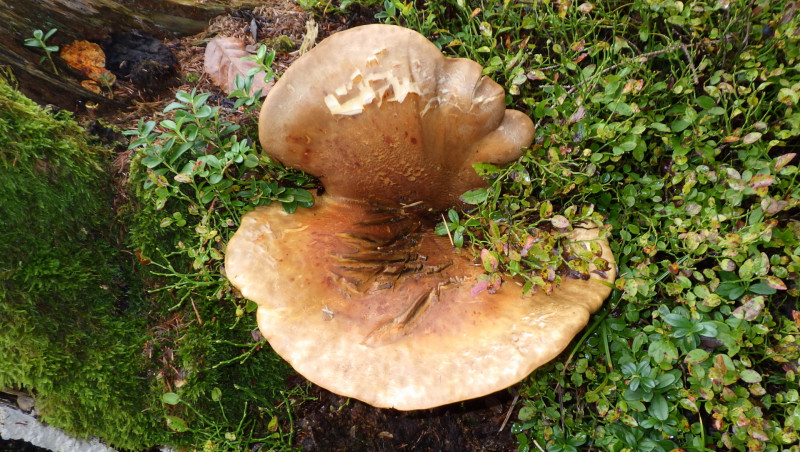 13) Dies war der grösste Lamellenpilz , den ich gefunden habe, er war um 40cm gross wuchs an einem Baumstumpf, um welchen Pilz handelt es sich hier? Der Hut war recht ledrig hart.