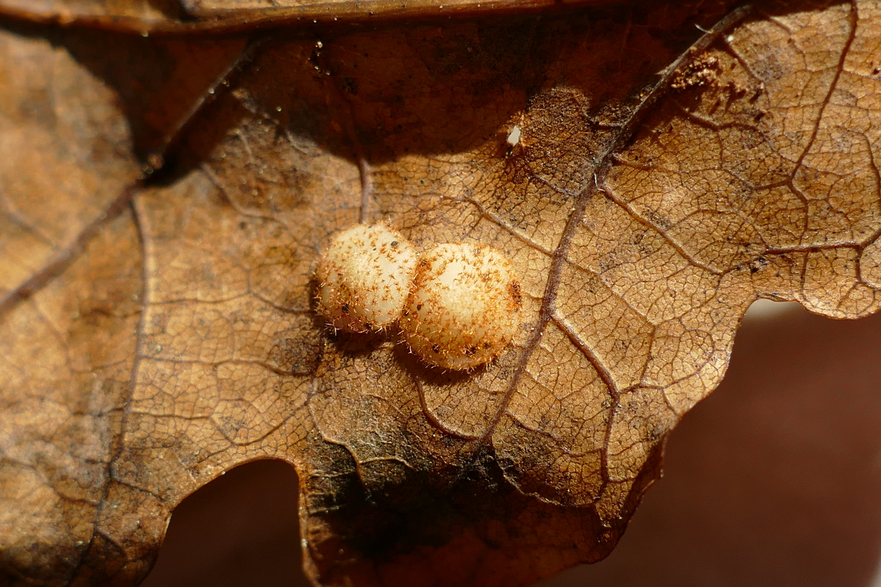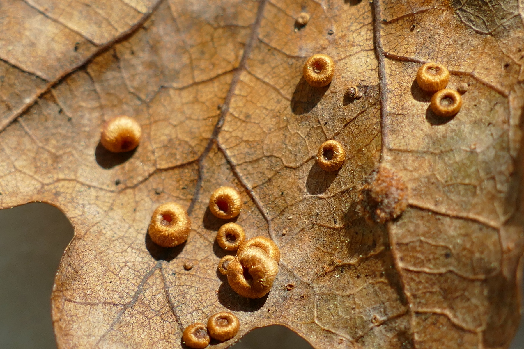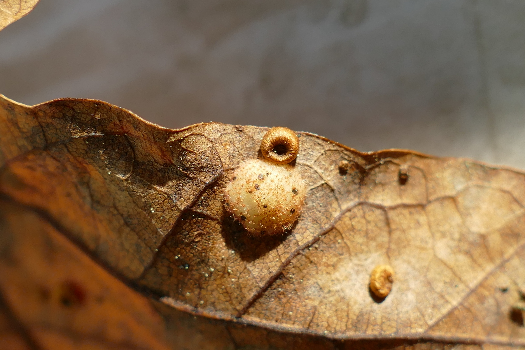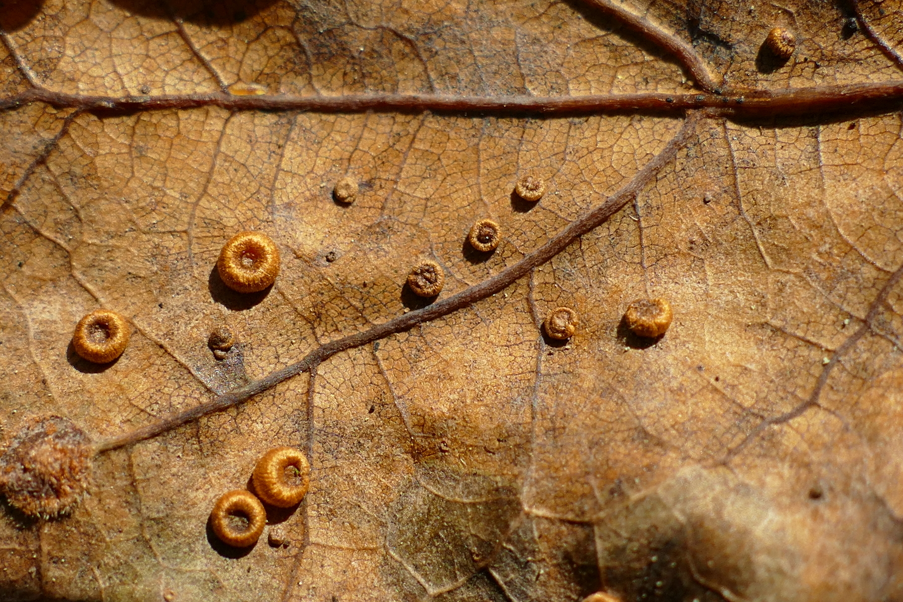 Heute fand ich zwei Eichenblätter, auf denen sich vermutlich pilzliche Bewohner befinden.