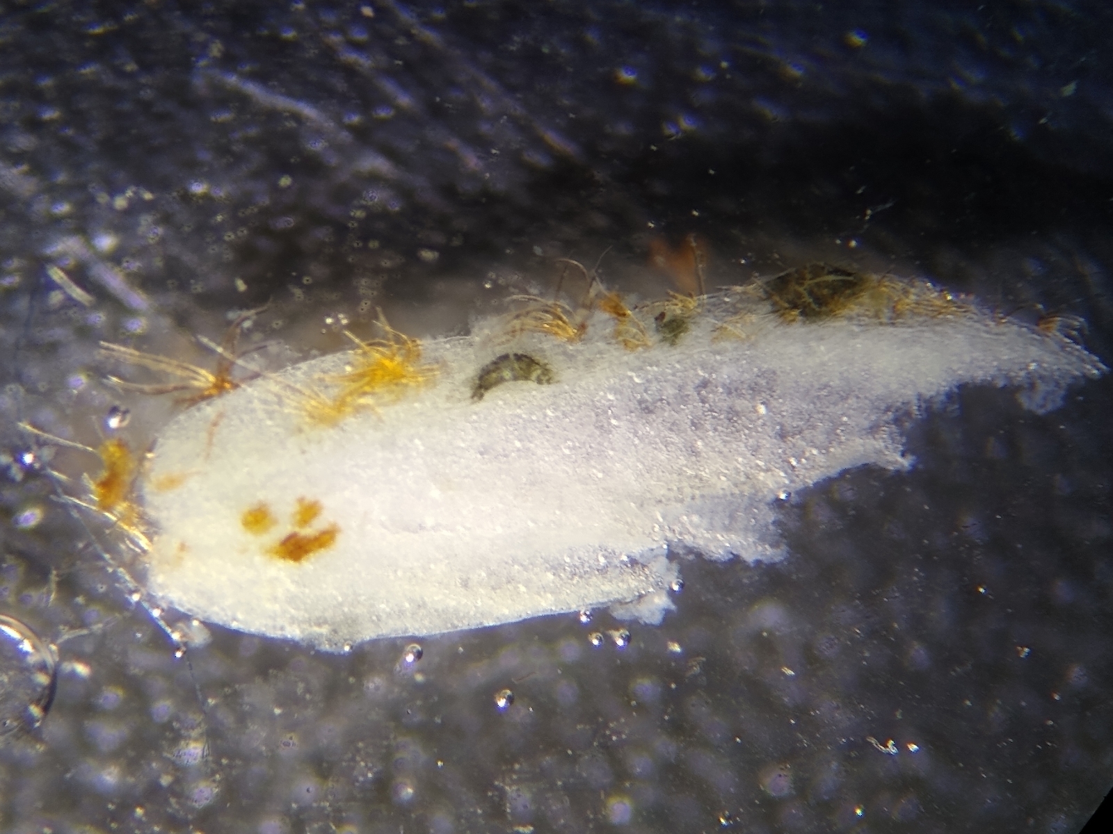 Und dann sind da noch diese flachen, weißen Teile mit bräunlichen Haarbüscheln und schwärzlichen Flecken auf dem gleichen Blatt.