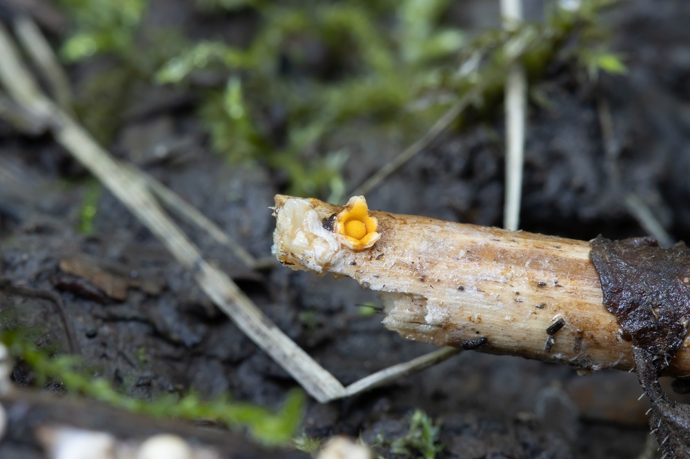 2. wirklich reif sieht es dann so aus. Der Pilz bekommt eine orangene Farbe und hat in der Mitte ein gelbes "Ei" (Gleba), dass besitzt die reifen Sporen.