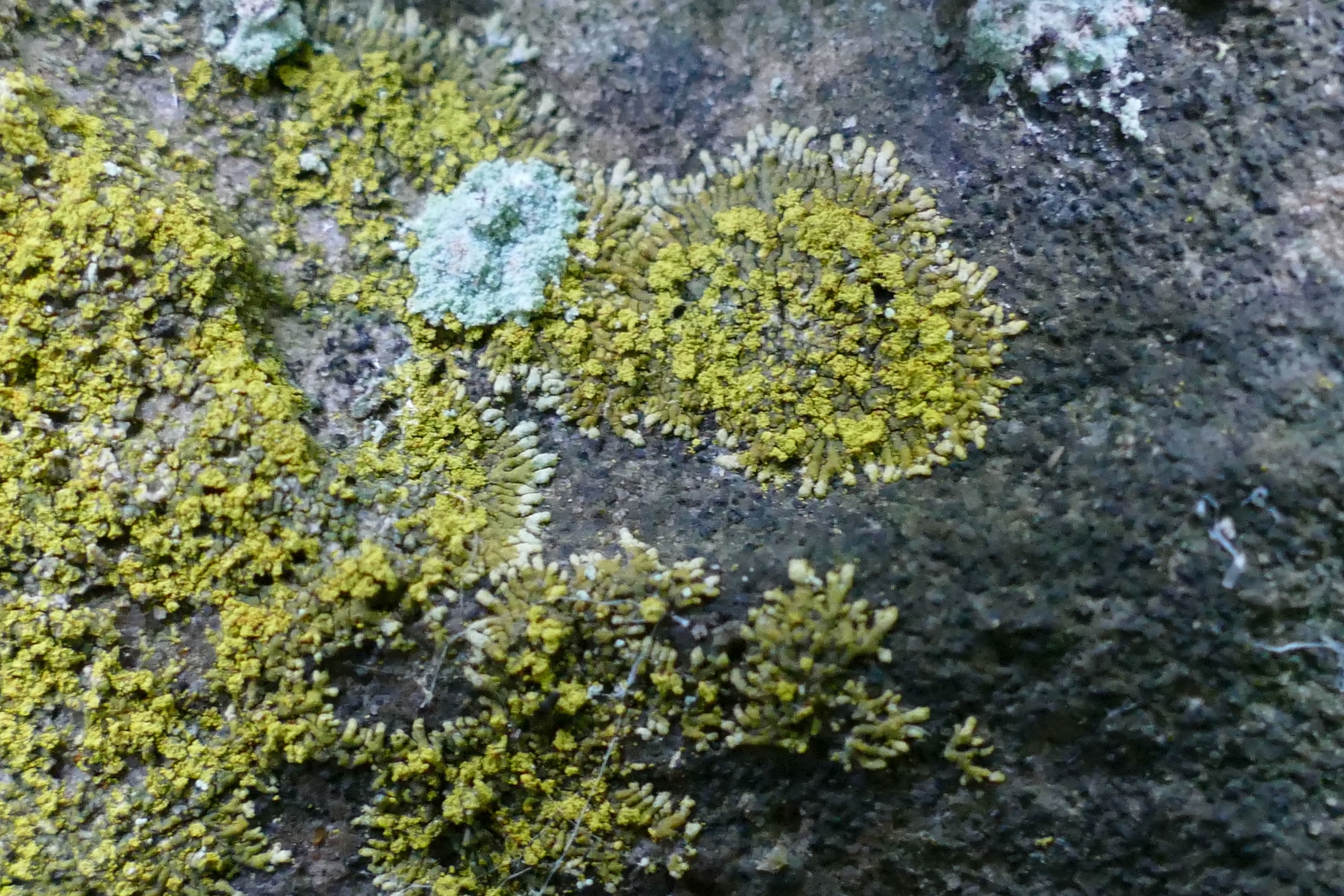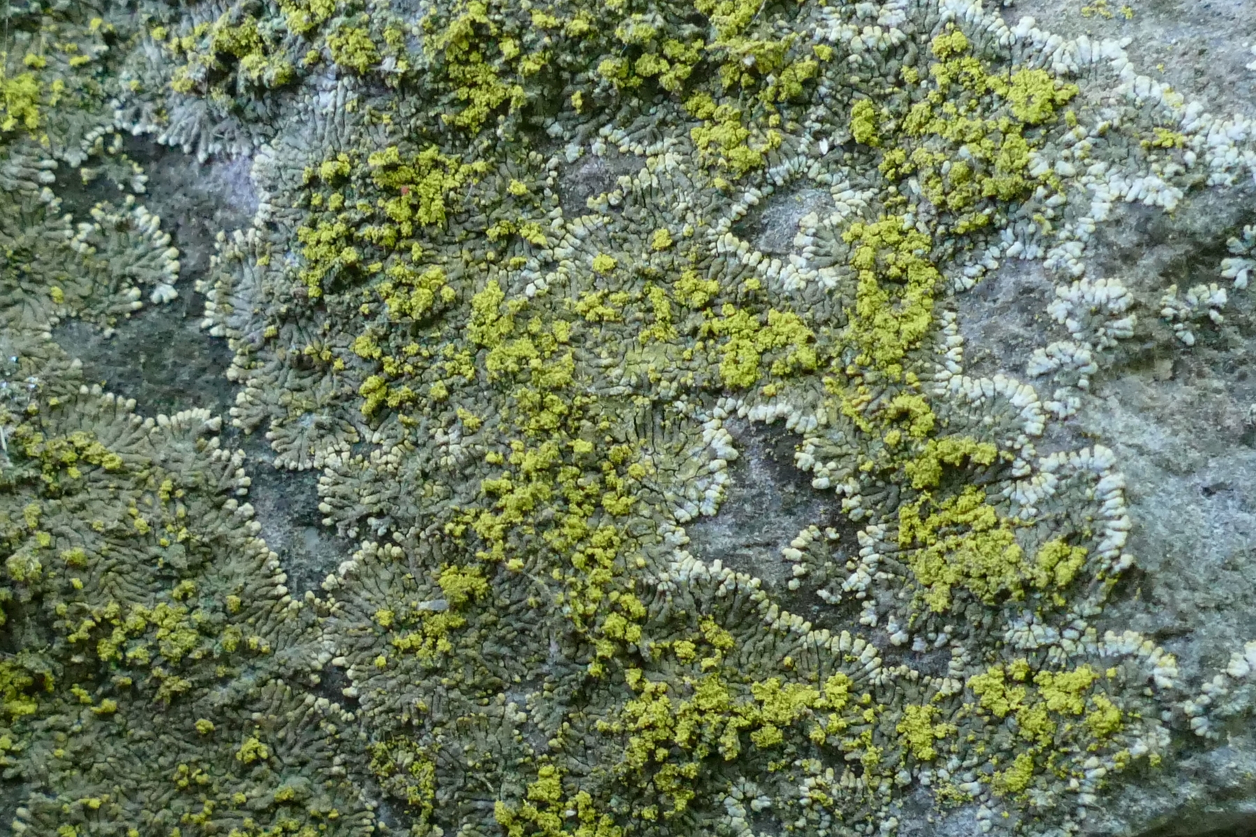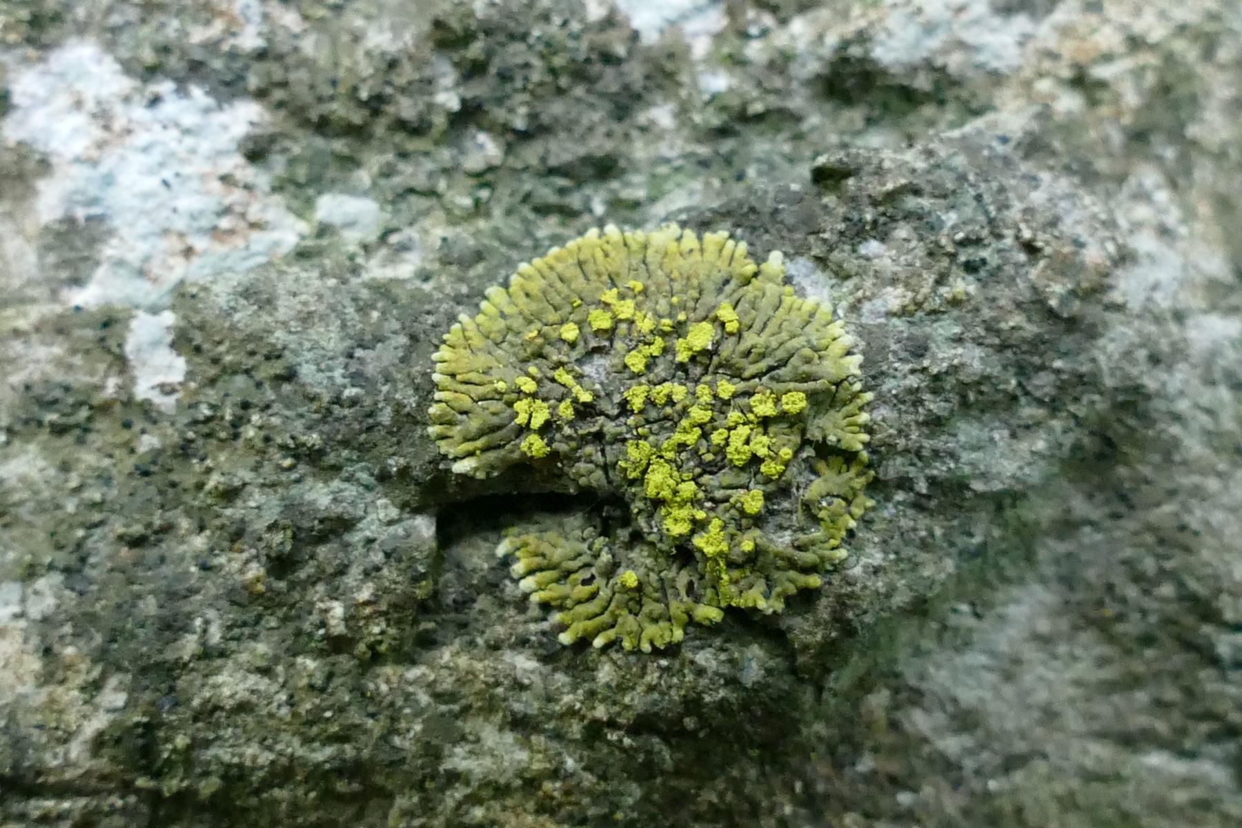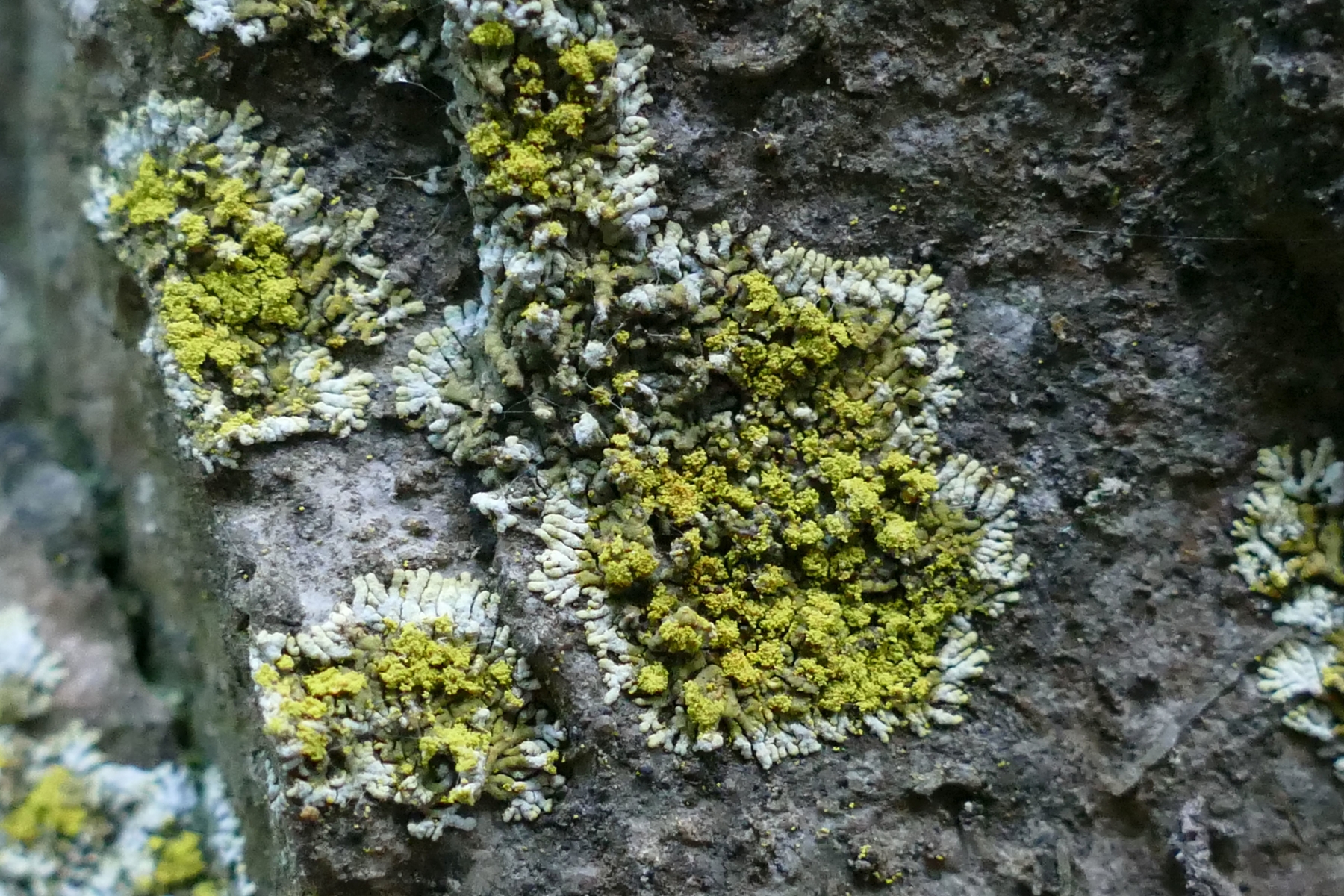 Dennoch bin ich mir recht sicher, hier Leproplaca (ehemals Caloplaca) cirrochroa vor mir zu haben, hier schön erkennbar an den zitronengelben Soralen, die sich um die oft ringförmig absterbende Thallusmitte bilden.