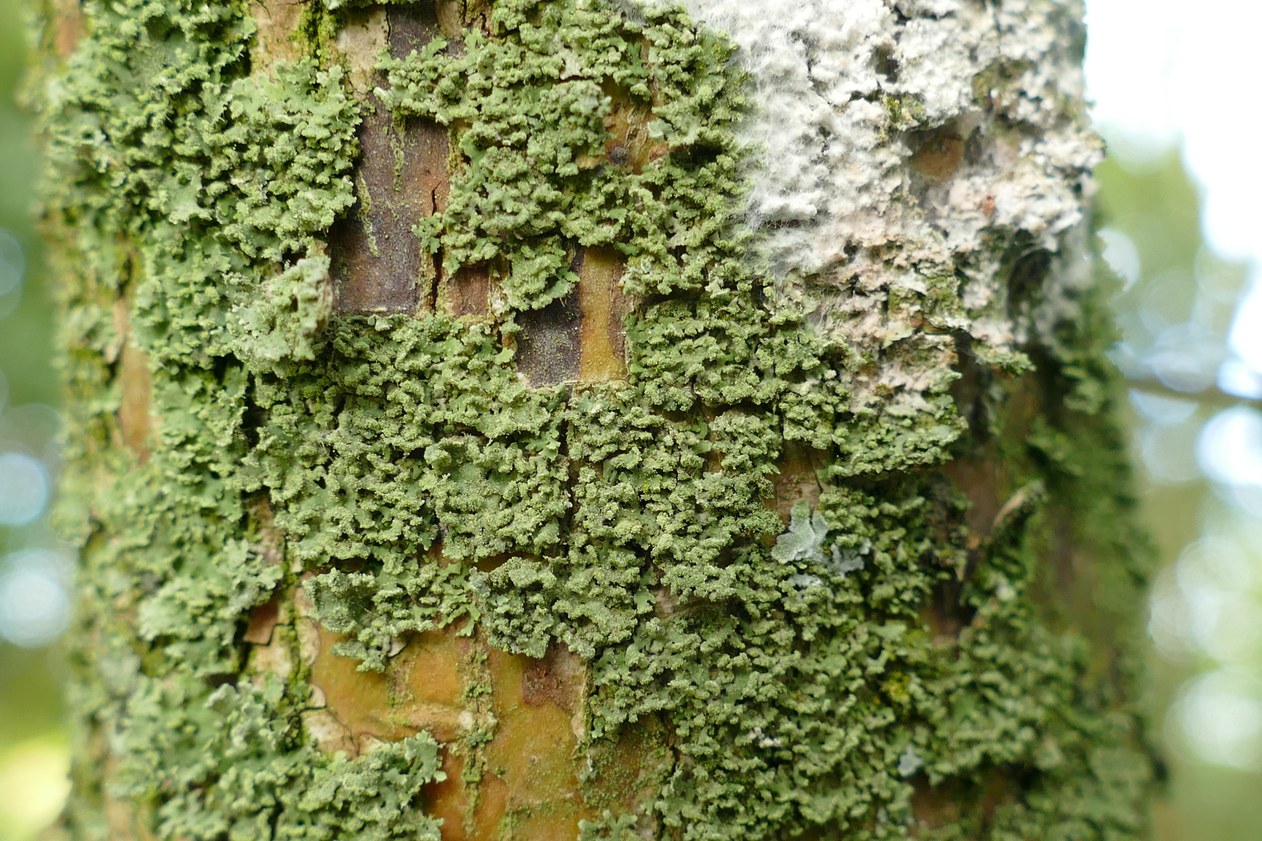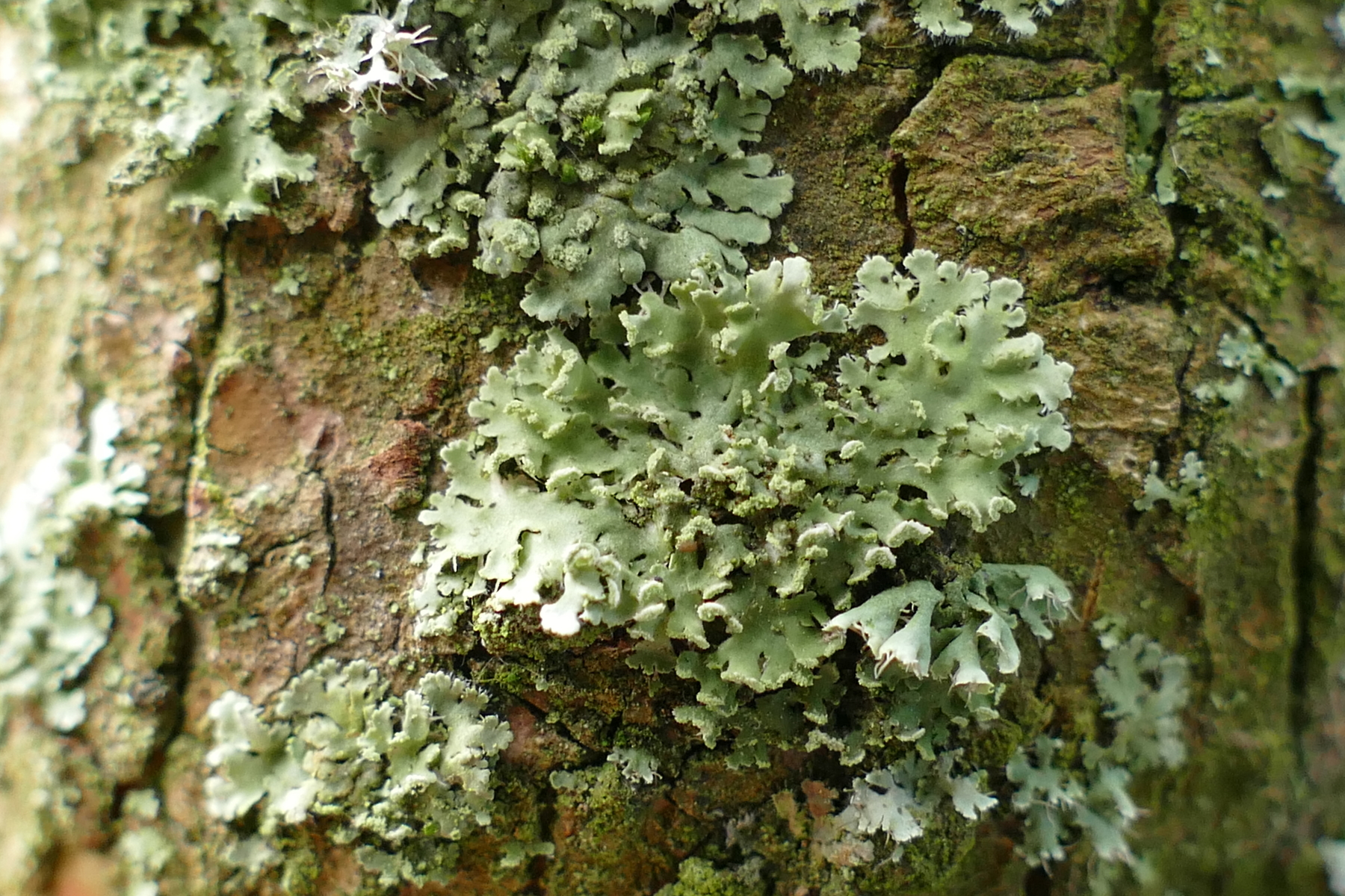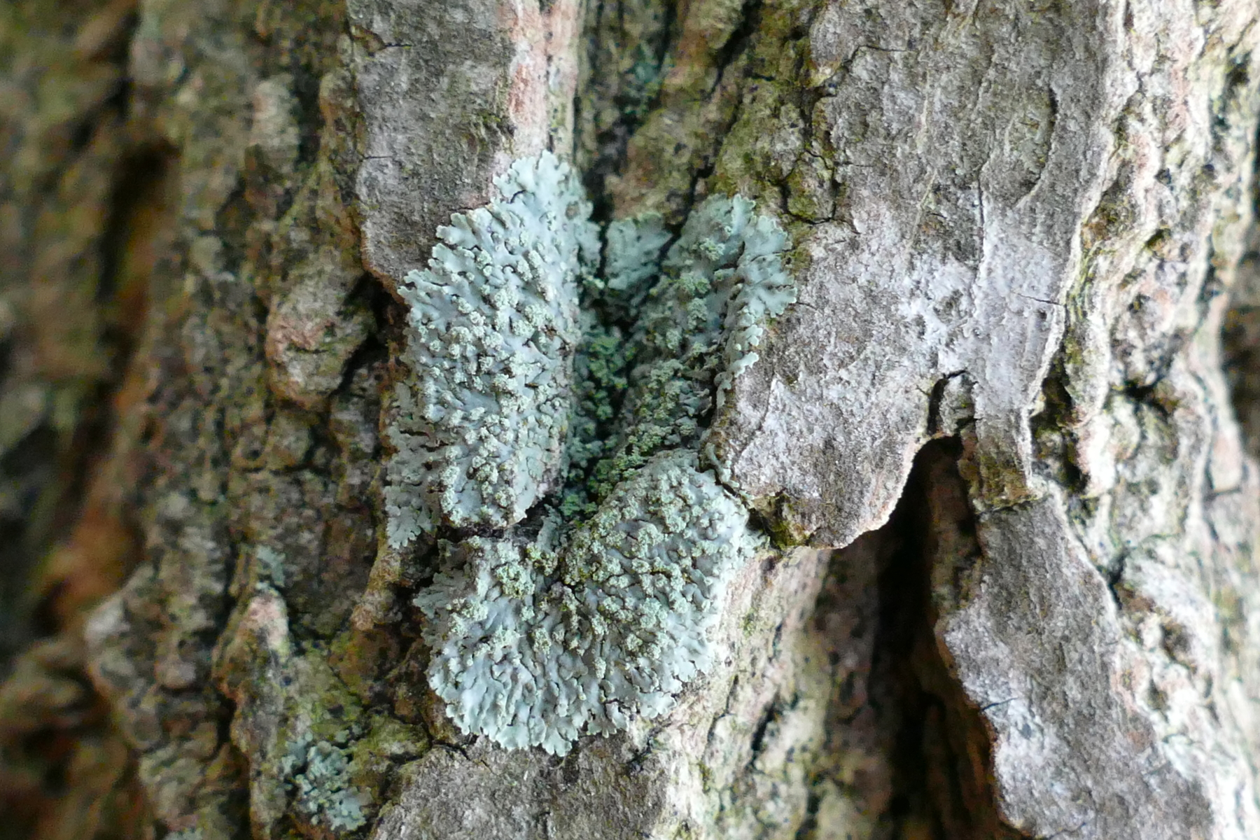 Für P.tenella zu dicht anliegend und zu breitlappig, P.caesia kommt zwar gelegentlich auf Borke vor, aber die halbkugeligen Sorale fehlen.