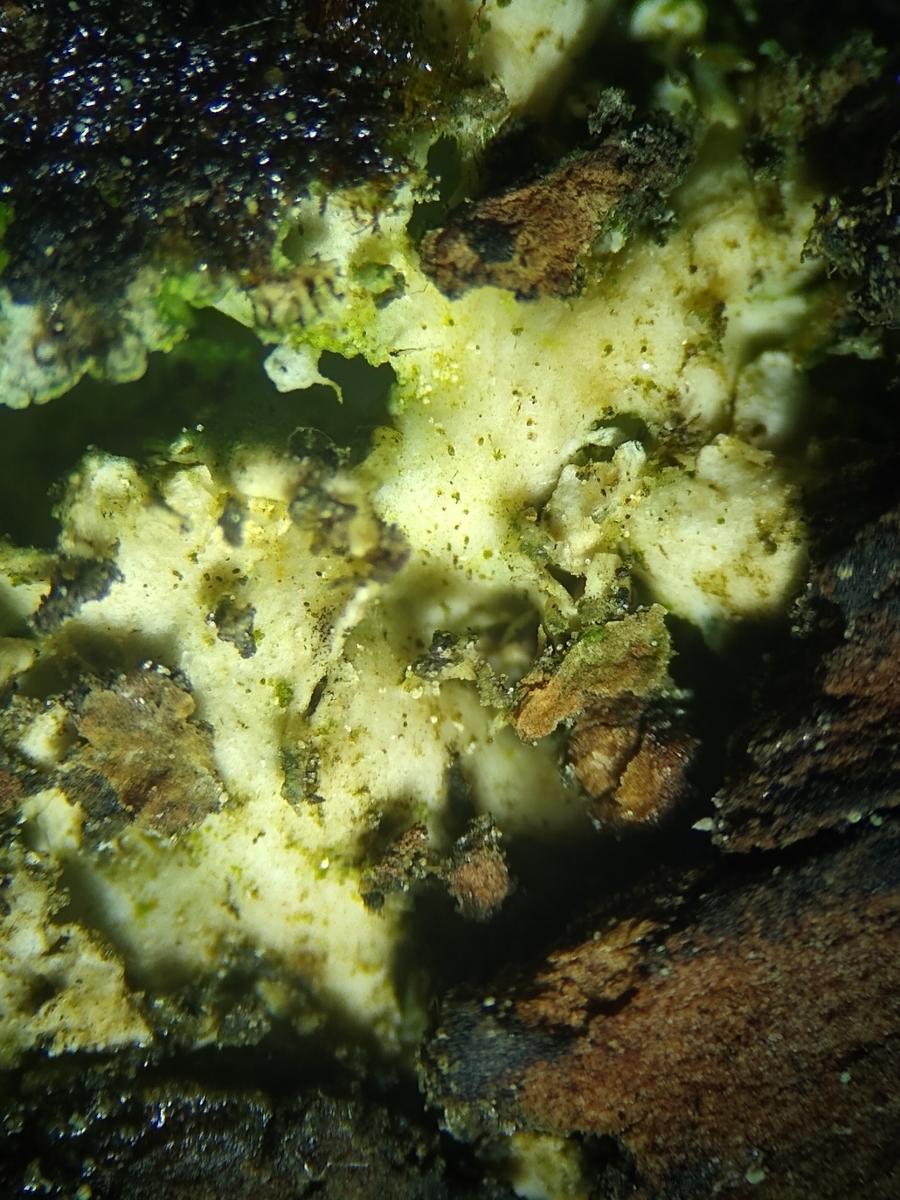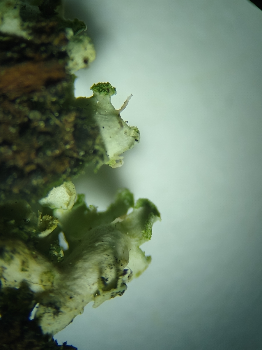 Bei den Flechten in Bild 2 (zumindest die Flechte am Bildrand oben), 3 und 4 und den Stereolupenaufnahmen der Unterseite Bild 6 & 7 könnte es sich tatsächlich also um Physciella chloantha handeln. Die Flechte auf im Zentrum von Bild 2 und auf Bild 5 sehen tatsächlich etwas anders aus, hmmm.