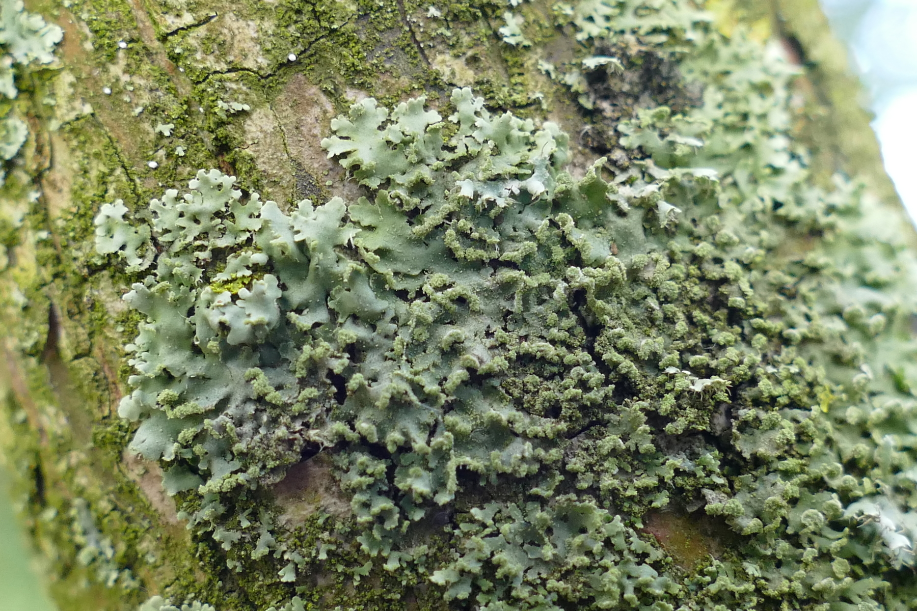 Für P.tenella zu dicht anliegend und zu breitlappig, P.caesia kommt zwar gelegentlich auf Borke vor, aber die halbkugeligen Sorale fehlen.
