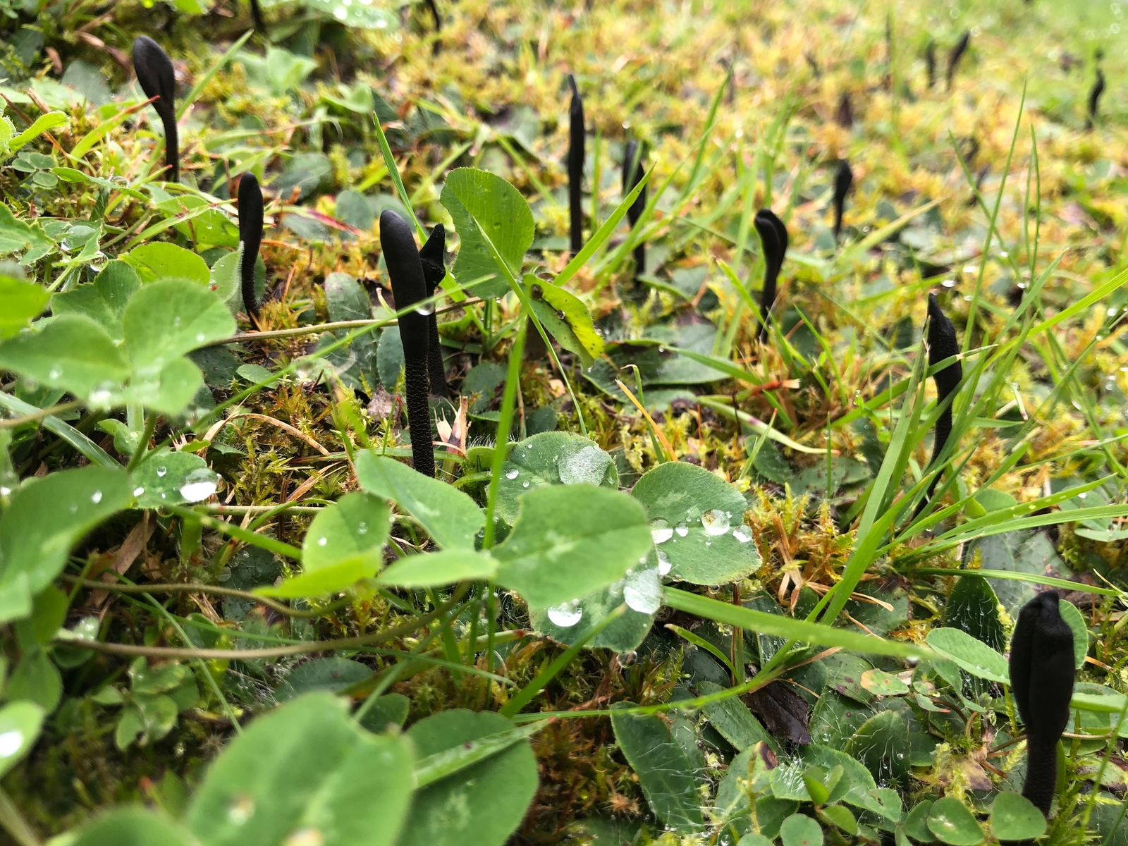 19 Intermezzo auf dem Weg zu Wiese 3. Vor einem Wohnhaus wachsen ebenfalls. regelmäßig Rötlinge, Saftlinge und Erdzungen. Aber gestern ließen sich nur die Schwarzen Erdzungen -Geoglossum umbratile blicken.