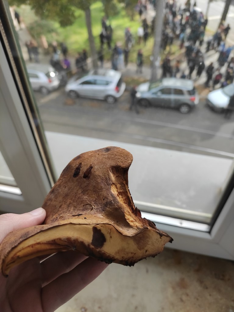 Er wuchs am Friedhofsrand unter Linde. Hutdurchmesser 19cm.