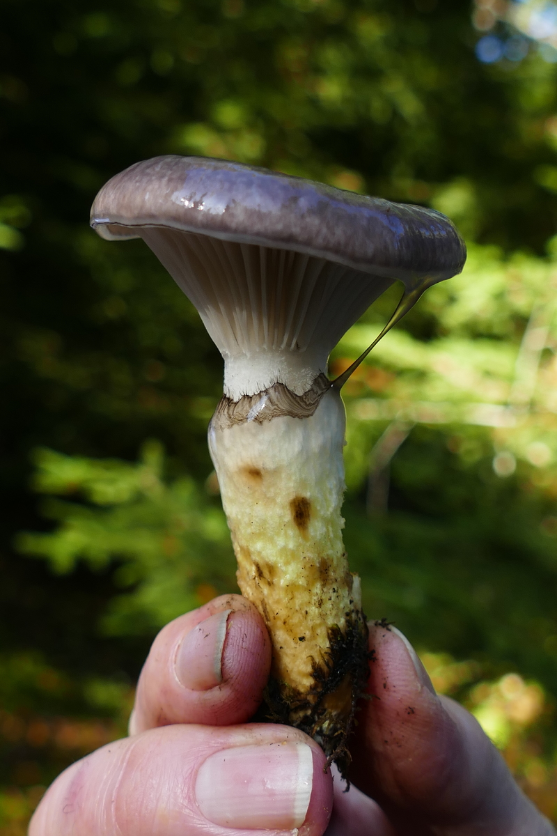 • Und noch ein Nachtrag ... neben Lactarius blennius fanden wir unter Buchen noch den folgenden Vertreter, der uns nicht recht nach blennius aussah, da er eher bräunlichere Töne hatte. Er gab reichlich Milch und die Huthaut zeigt kopfige Haare, die Sporen sind eher flügelsporig. Damit komme ich zu Lactarius fluens - dem blassrandigen Milchling