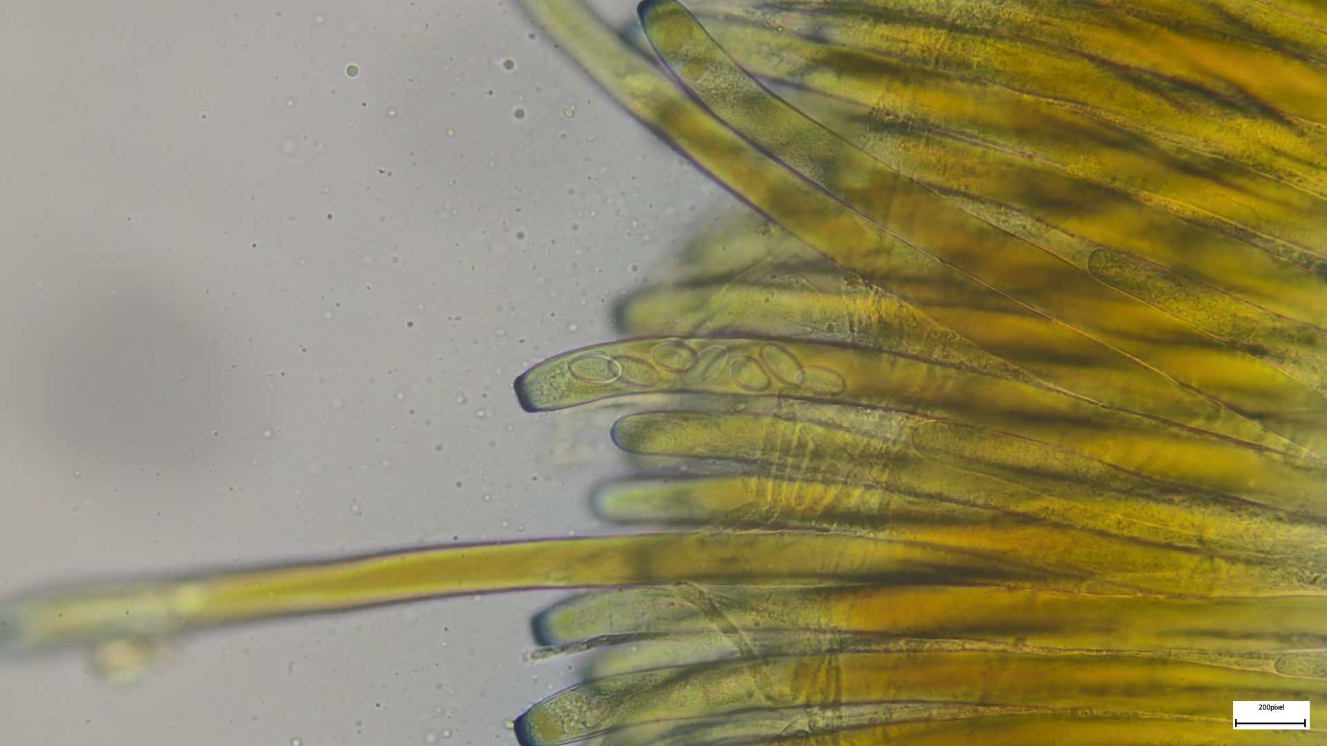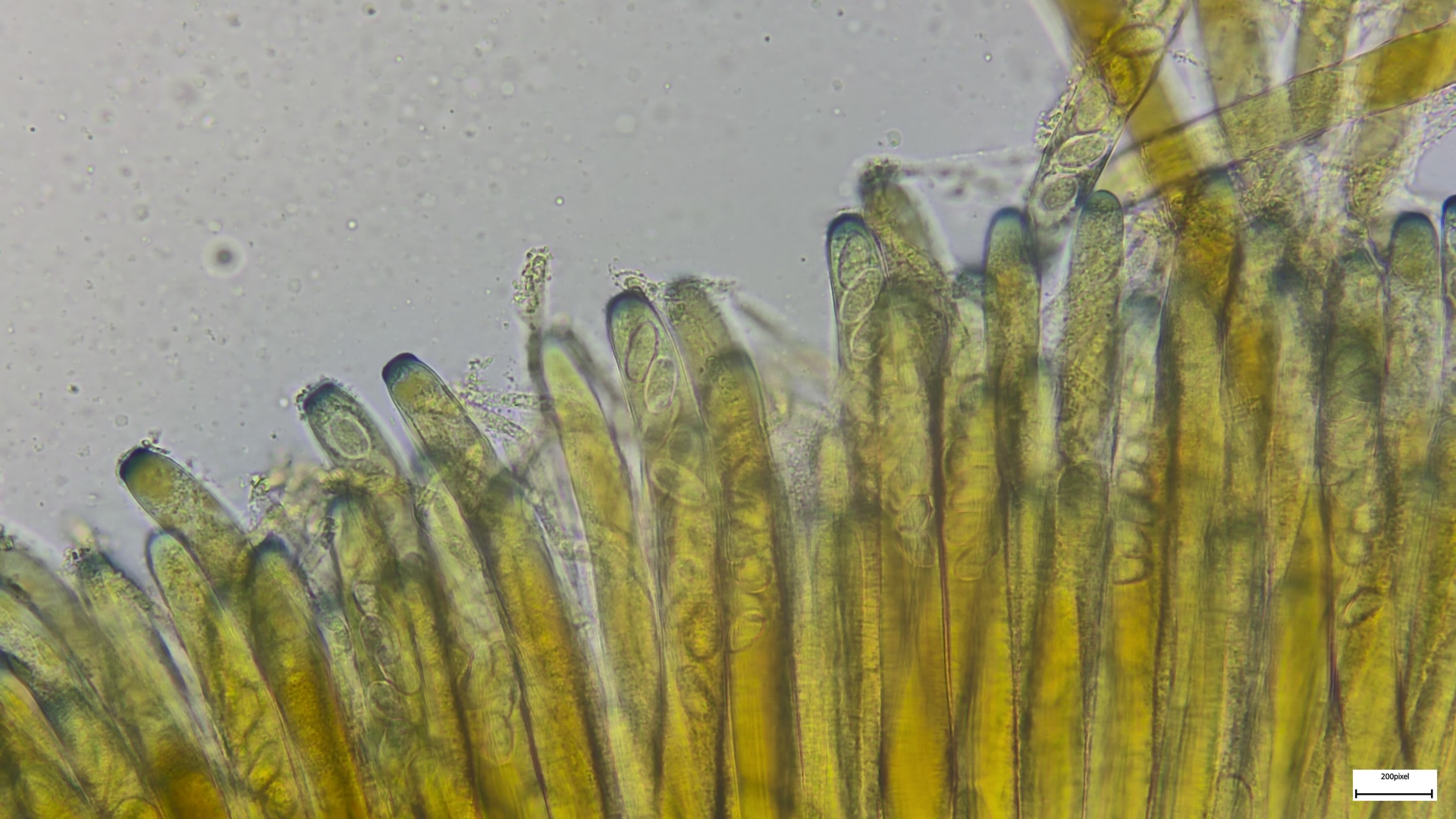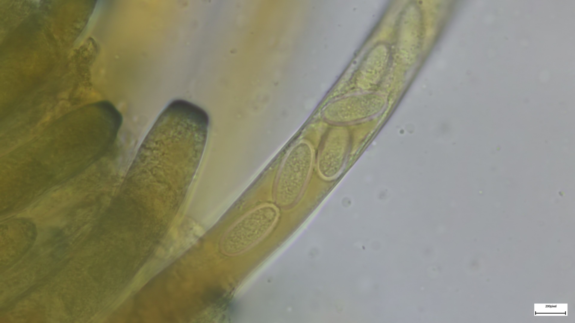 Einfache Paraphysen ... Sporen 15x7 (vermutlich bei sehr jungem Fruchtkörper noch nicht ganz reif), ziemlich glatt ohne Öltropfen. Ascus an Porus amyloid. Textur globulos, keine mittlere intricata: