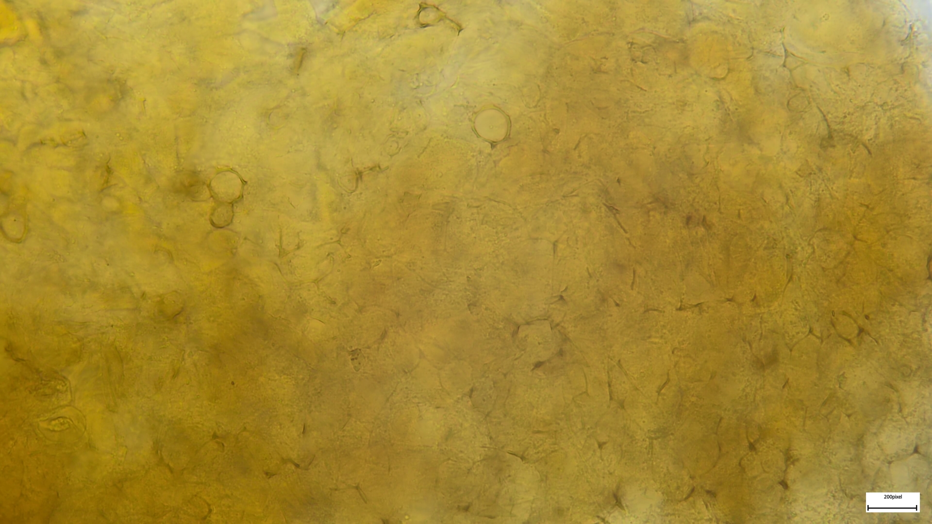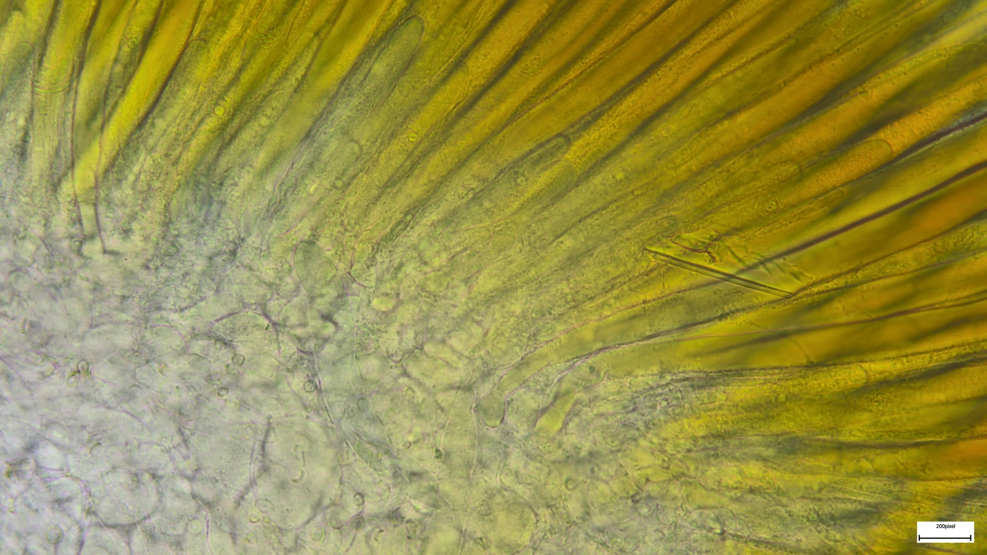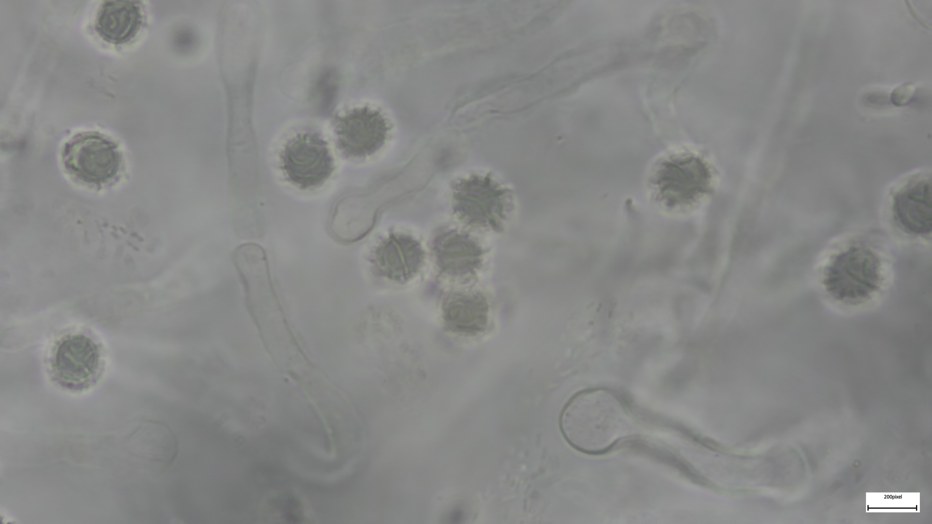 Einfache Paraphysen ... Sporen 15x7 (vermutlich bei sehr jungem Fruchtkörper noch nicht ganz reif), ziemlich glatt ohne Öltropfen. Ascus an Porus amyloid. Textur globulos, keine mittlere intricata:
