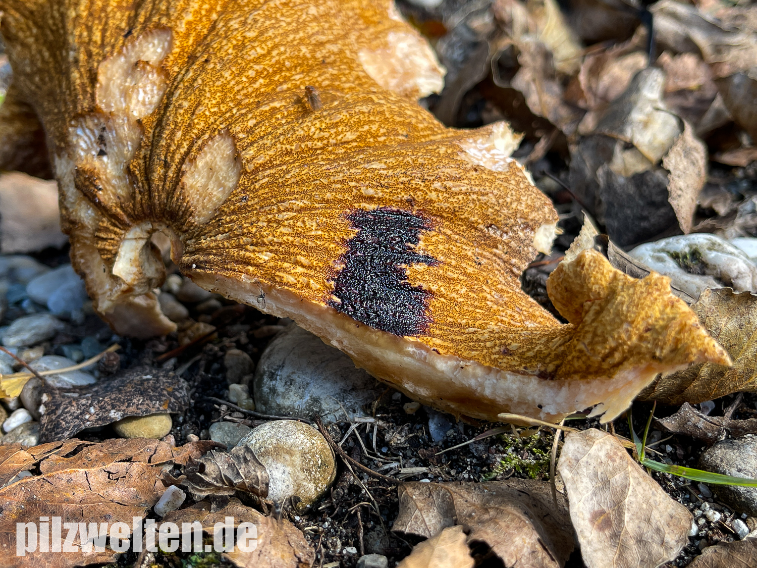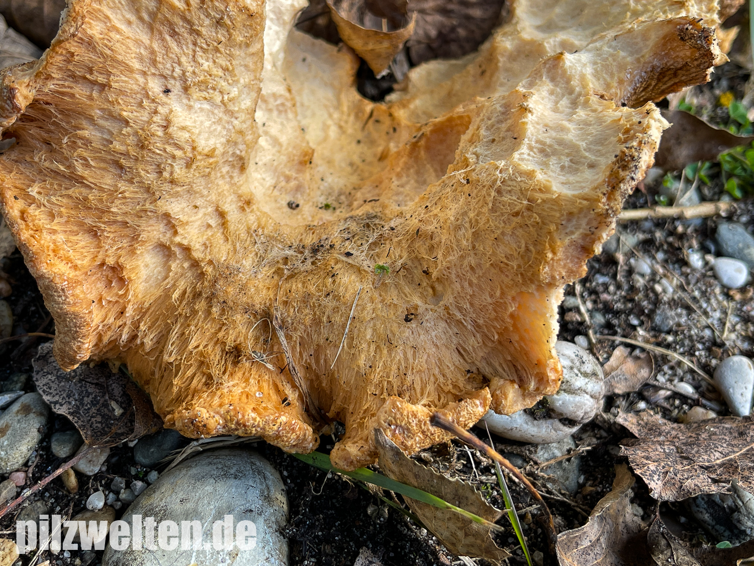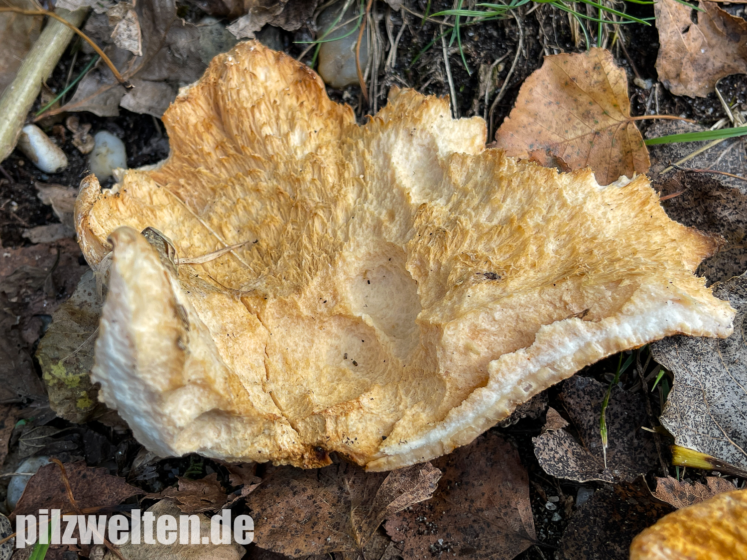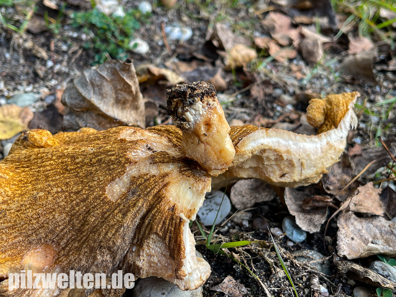 den folgenden (leider schon etwas älteren) Fund konnten wir heute auf einer Runde um den Badesee machen. Vom ersten Eindruck her dachten wir an einen Stielporling, aber obwohl die Hutunterseite sehr einzigartig ausschaut und sich mit Kalilauge eine starke Farbreaktion erzeugen ließ, kommen wir mit dem Fund überhaupt nicht weiter.