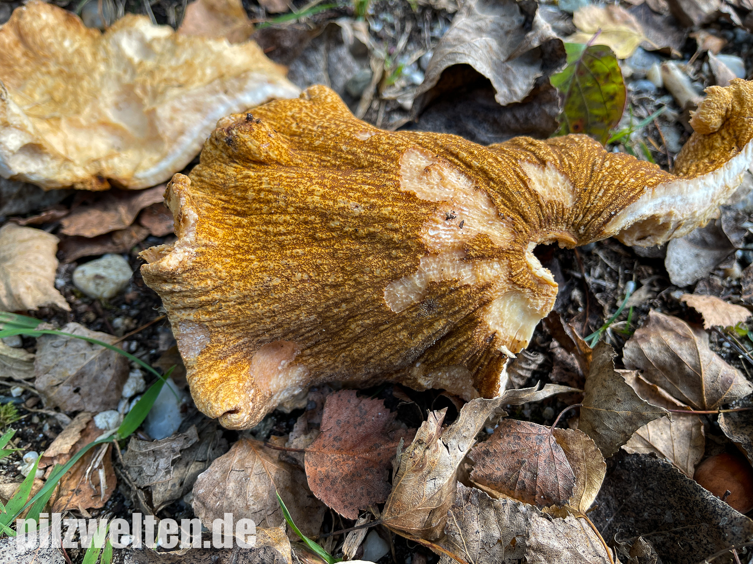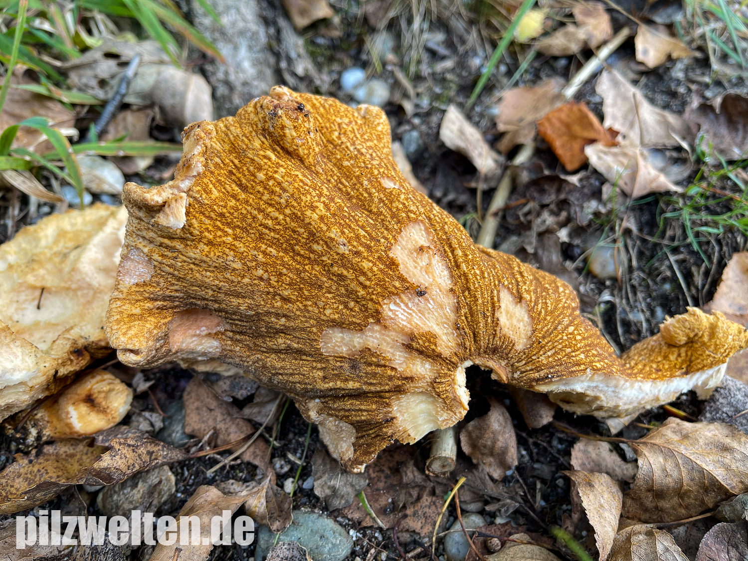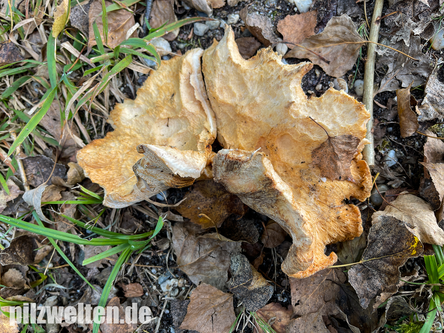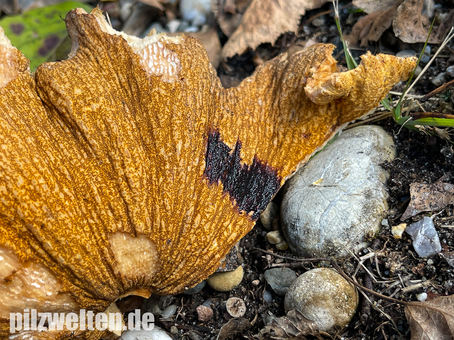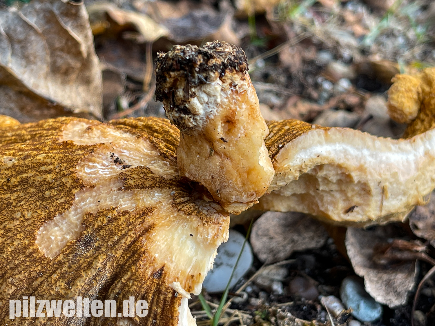 den folgenden (leider schon etwas älteren) Fund konnten wir heute auf einer Runde um den Badesee machen. Vom ersten Eindruck her dachten wir an einen Stielporling, aber obwohl die Hutunterseite sehr einzigartig ausschaut und sich mit Kalilauge eine starke Farbreaktion erzeugen ließ, kommen wir mit dem Fund überhaupt nicht weiter.