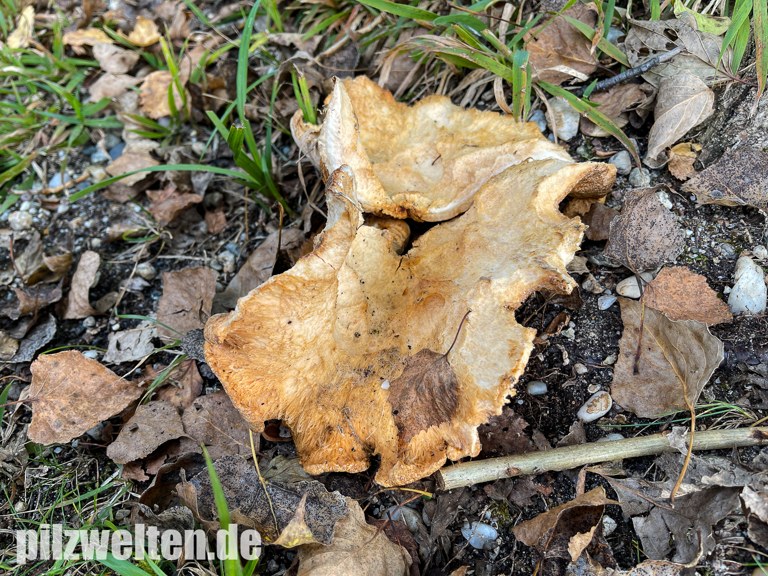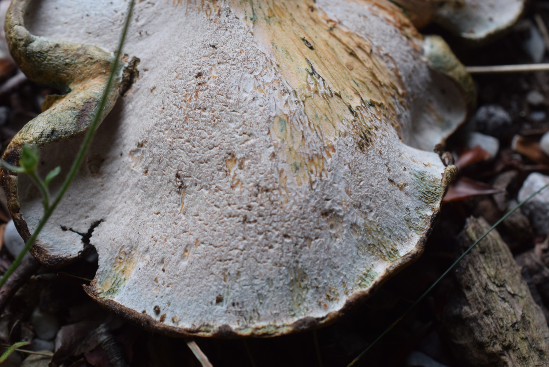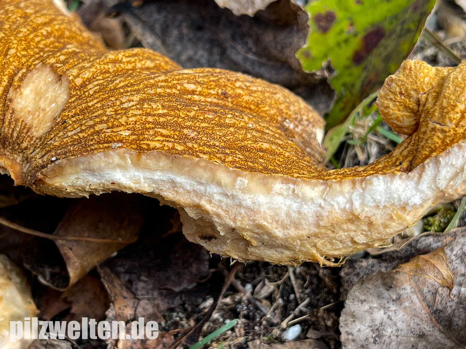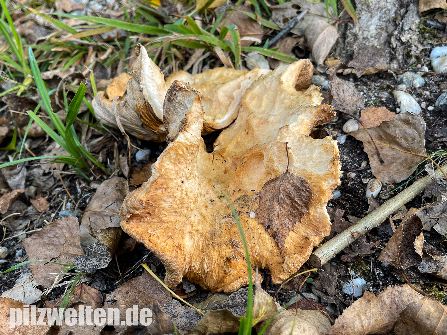den folgenden (leider schon etwas älteren) Fund konnten wir heute auf einer Runde um den Badesee machen. Vom ersten Eindruck her dachten wir an einen Stielporling, aber obwohl die Hutunterseite sehr einzigartig ausschaut und sich mit Kalilauge eine starke Farbreaktion erzeugen ließ, kommen wir mit dem Fund überhaupt nicht weiter.