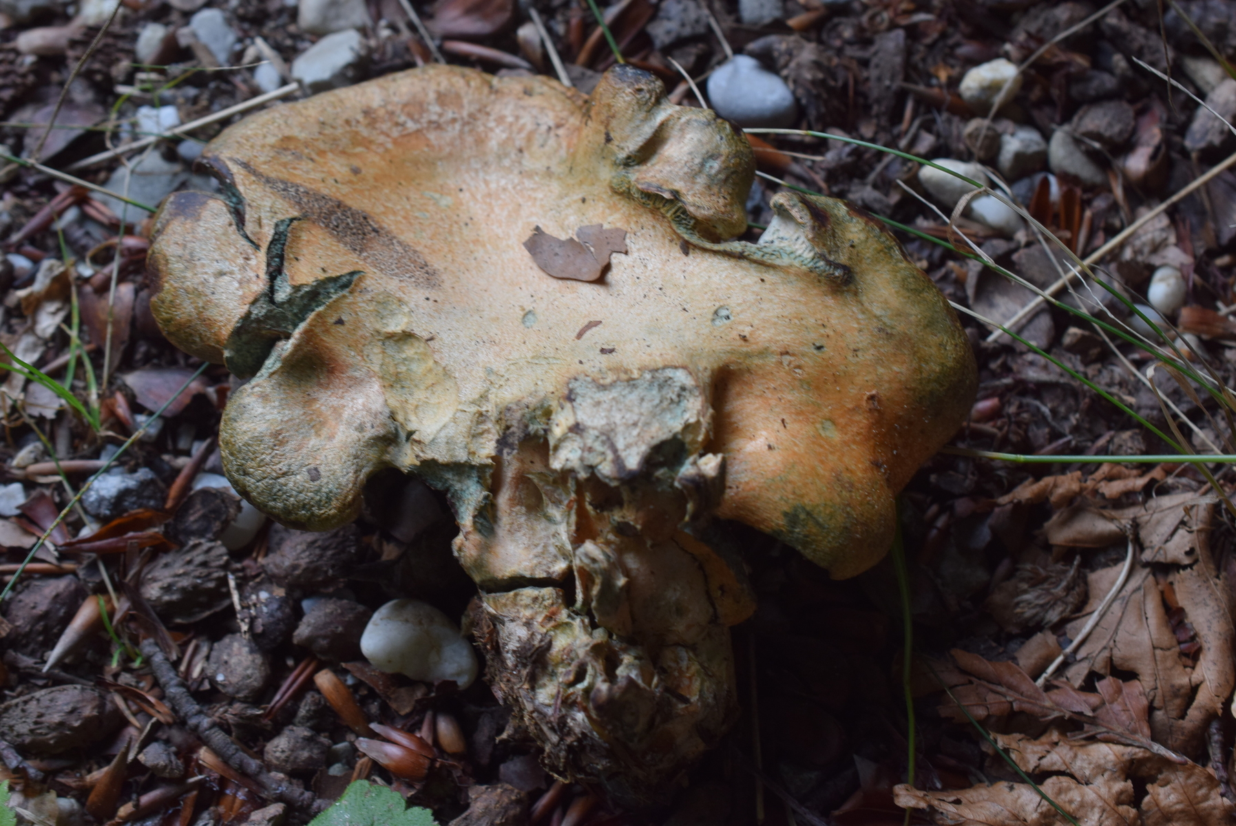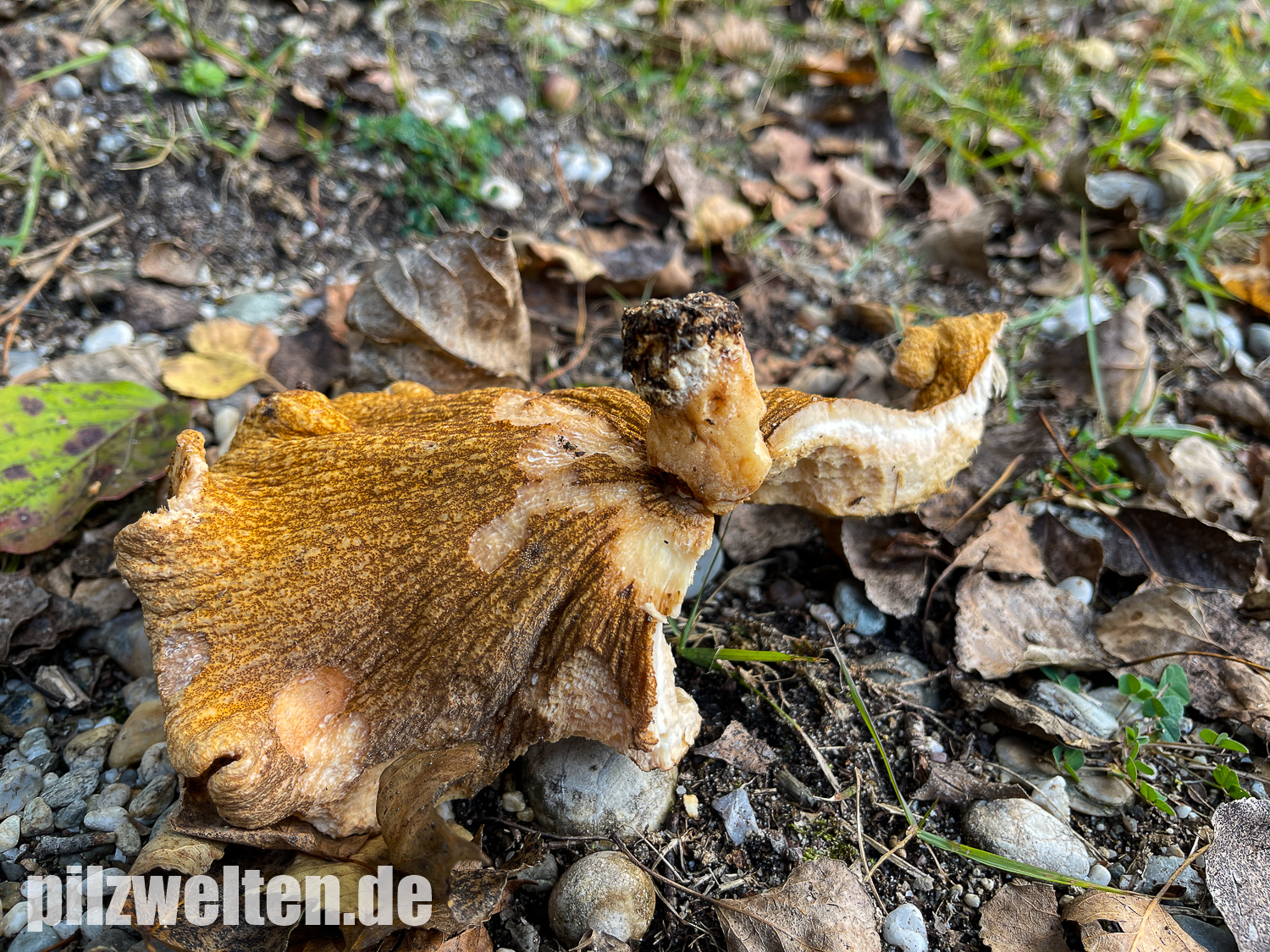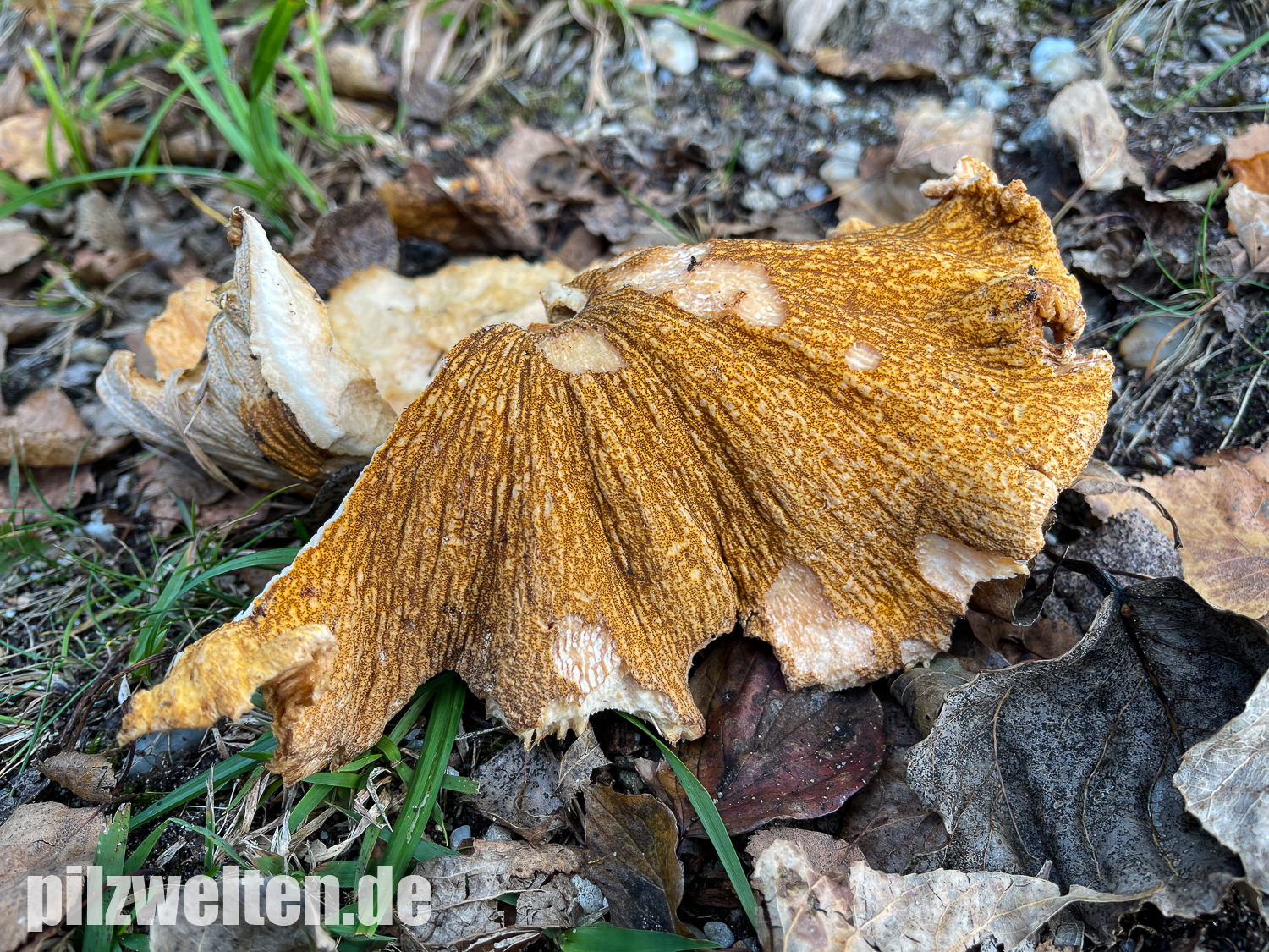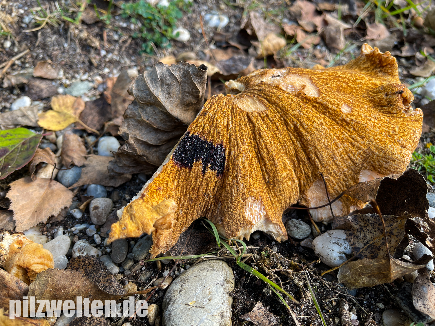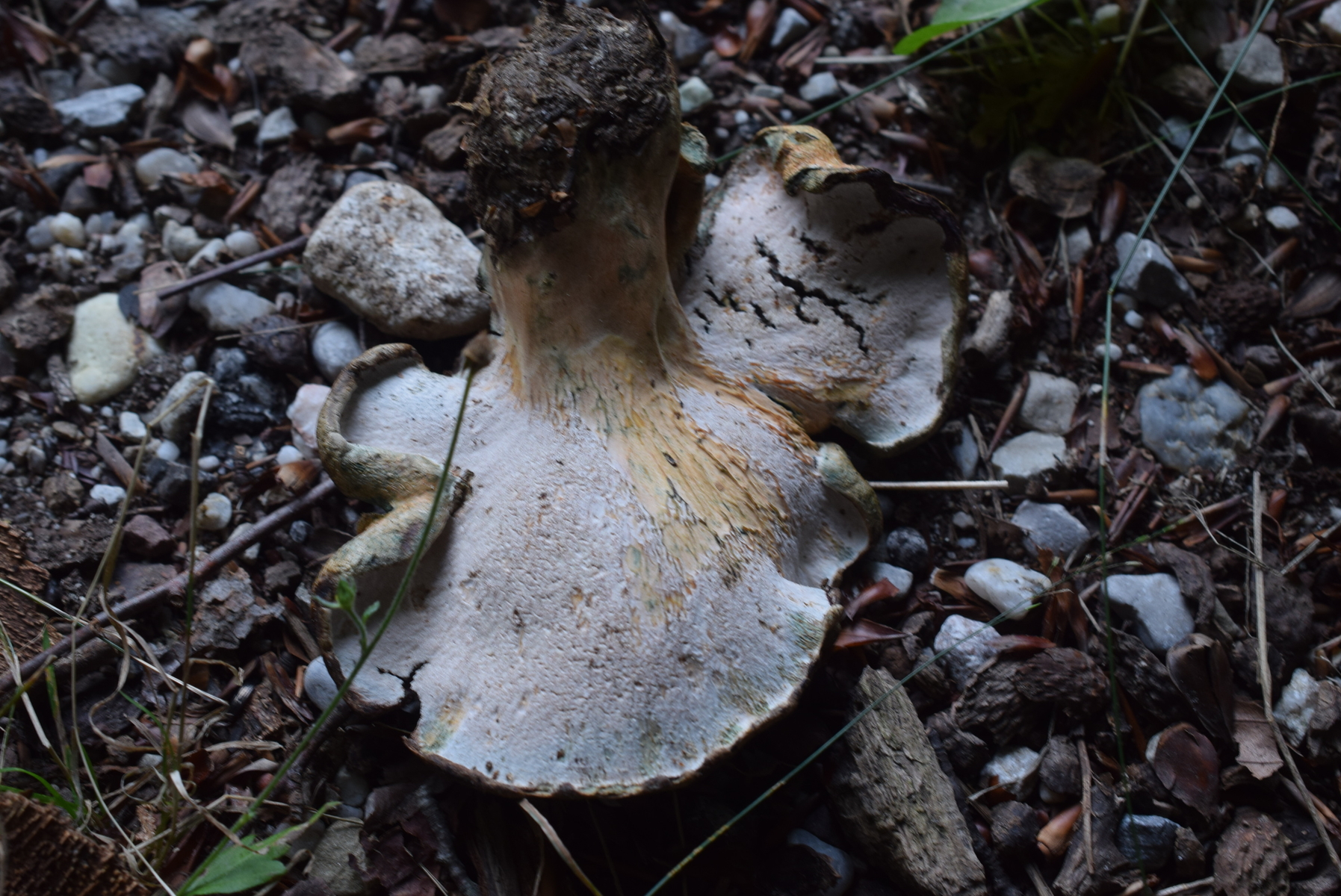 den folgenden (leider schon etwas älteren) Fund konnten wir heute auf einer Runde um den Badesee machen. Vom ersten Eindruck her dachten wir an einen Stielporling, aber obwohl die Hutunterseite sehr einzigartig ausschaut und sich mit Kalilauge eine starke Farbreaktion erzeugen ließ, kommen wir mit dem Fund überhaupt nicht weiter.