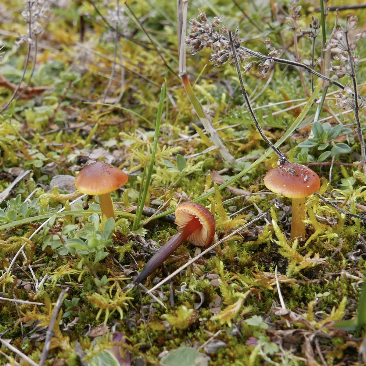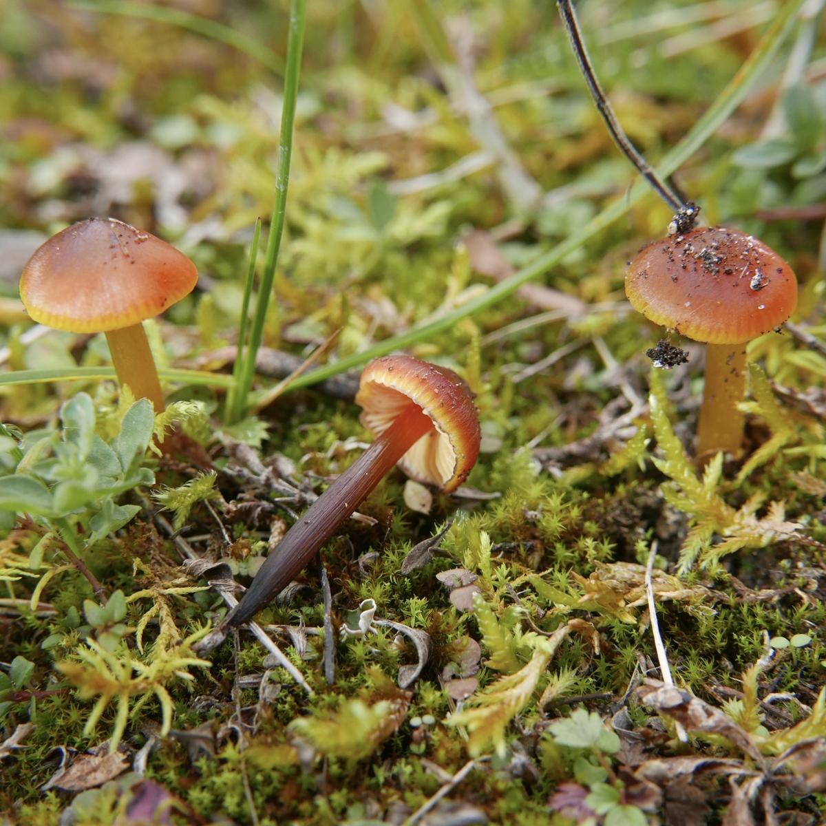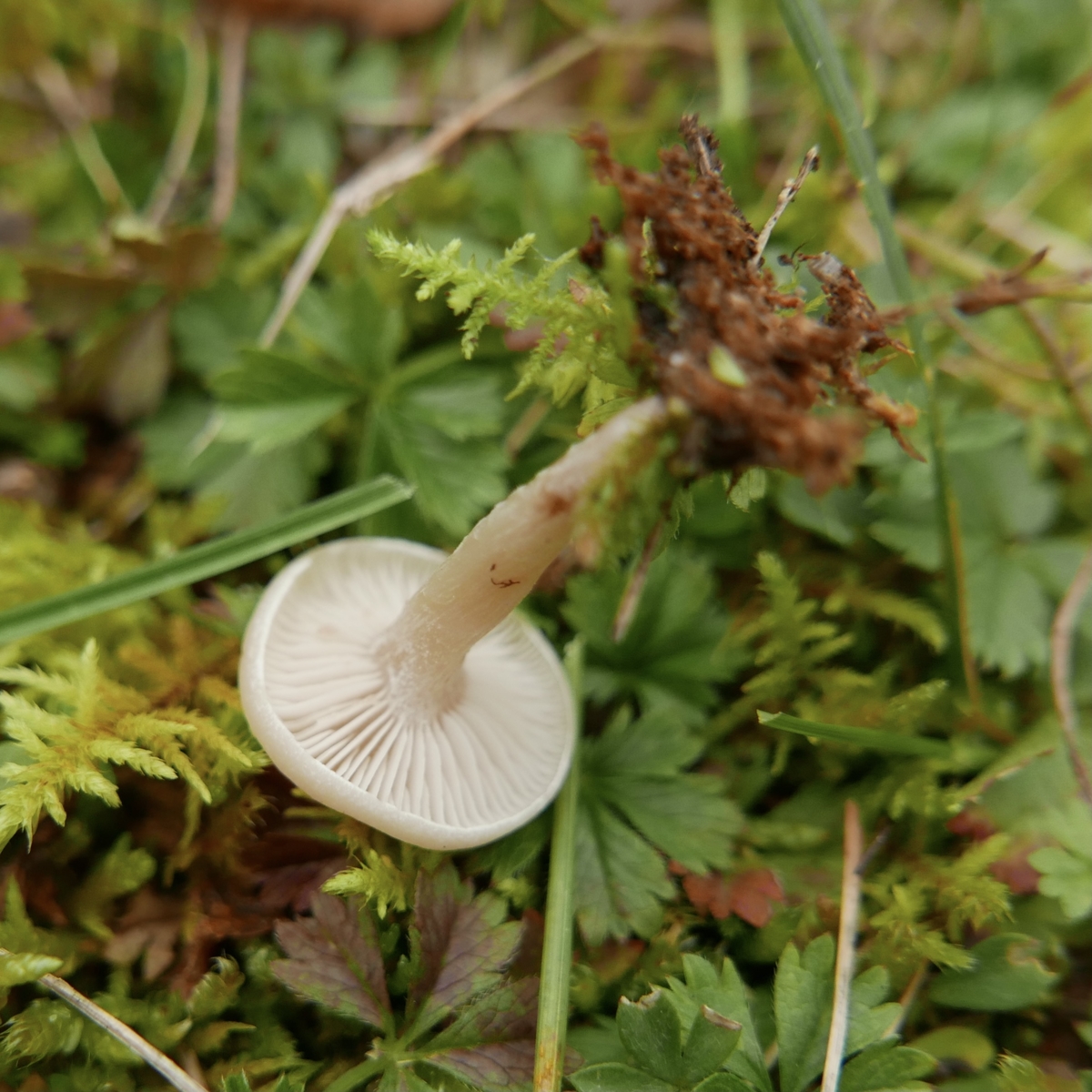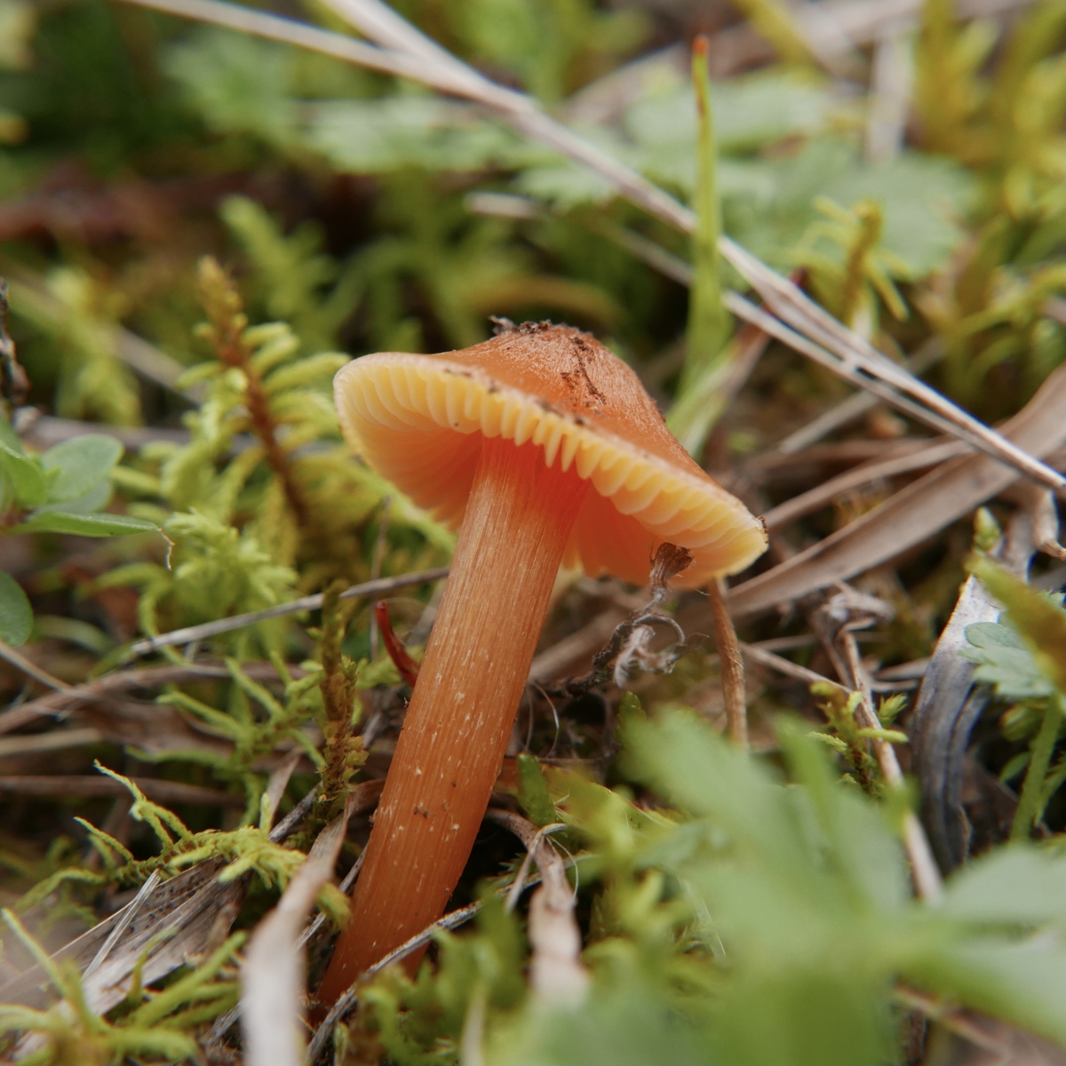 Pilz 6 Saftling, winzig klein mit einem Hutdurchmesser von etwa 6-7 mm, er war der einzige seiner Art, schwärzte nicht und durfte stehen bleiben
