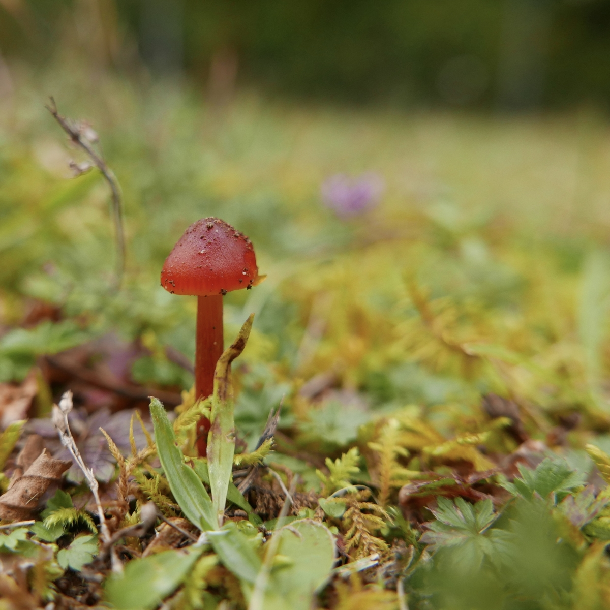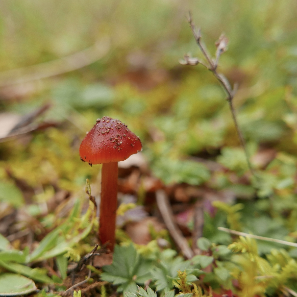 Dafür habe ich noch Fotos gemacht von Pilz 6, dem kleinen roten Saftling. Da kamen nämlich jetzt noch welche nach. Diesmal hatte ich das Stativ bemüht, aber viel besser sind die Bilder auch nicht geworden…