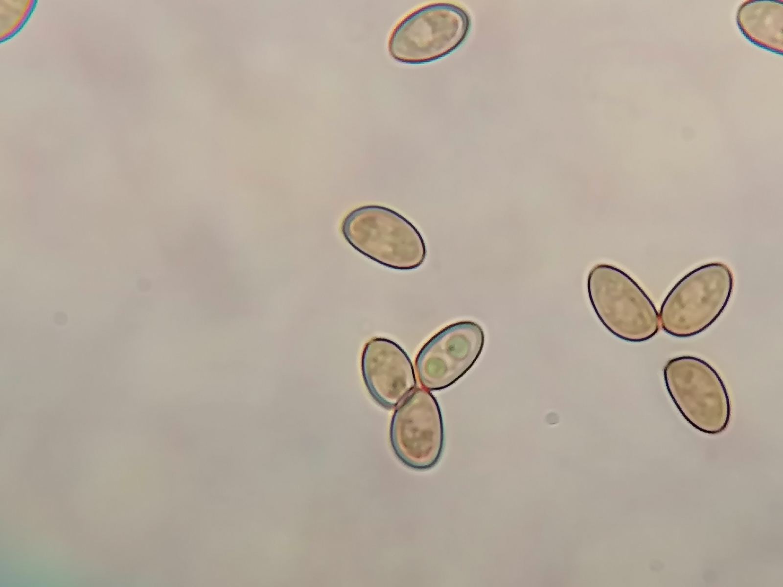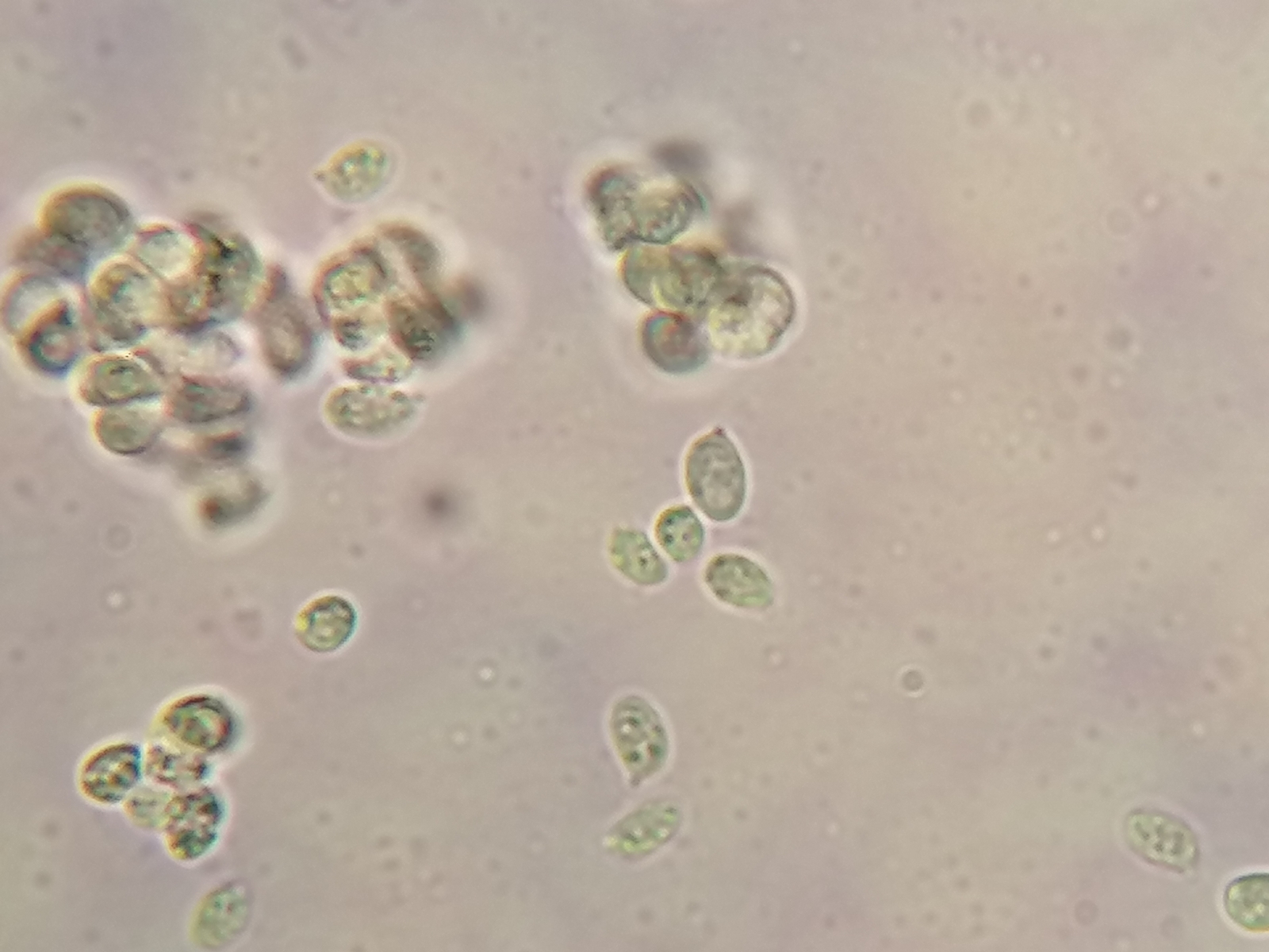 Die Fotos draußen sind recht schwummerig geworden, da es schon duster war. Sporenmessung findet mangels Maßeinheiten immer noch nicht statt. Außerdem hoffe ich, dass ich nicht wieder mit den Sporen und Zellen unterm Mikro durcheinandergekommen bin.