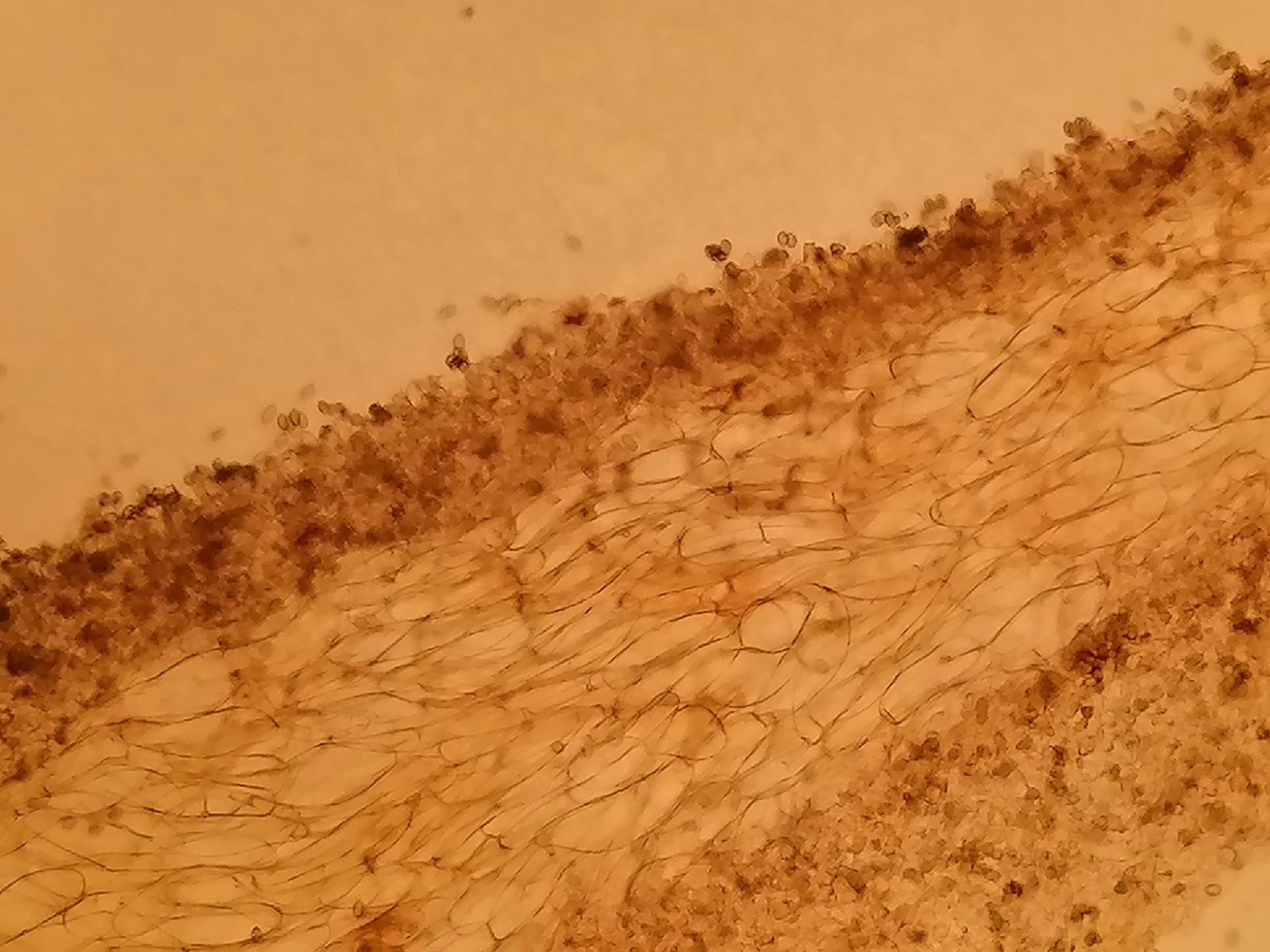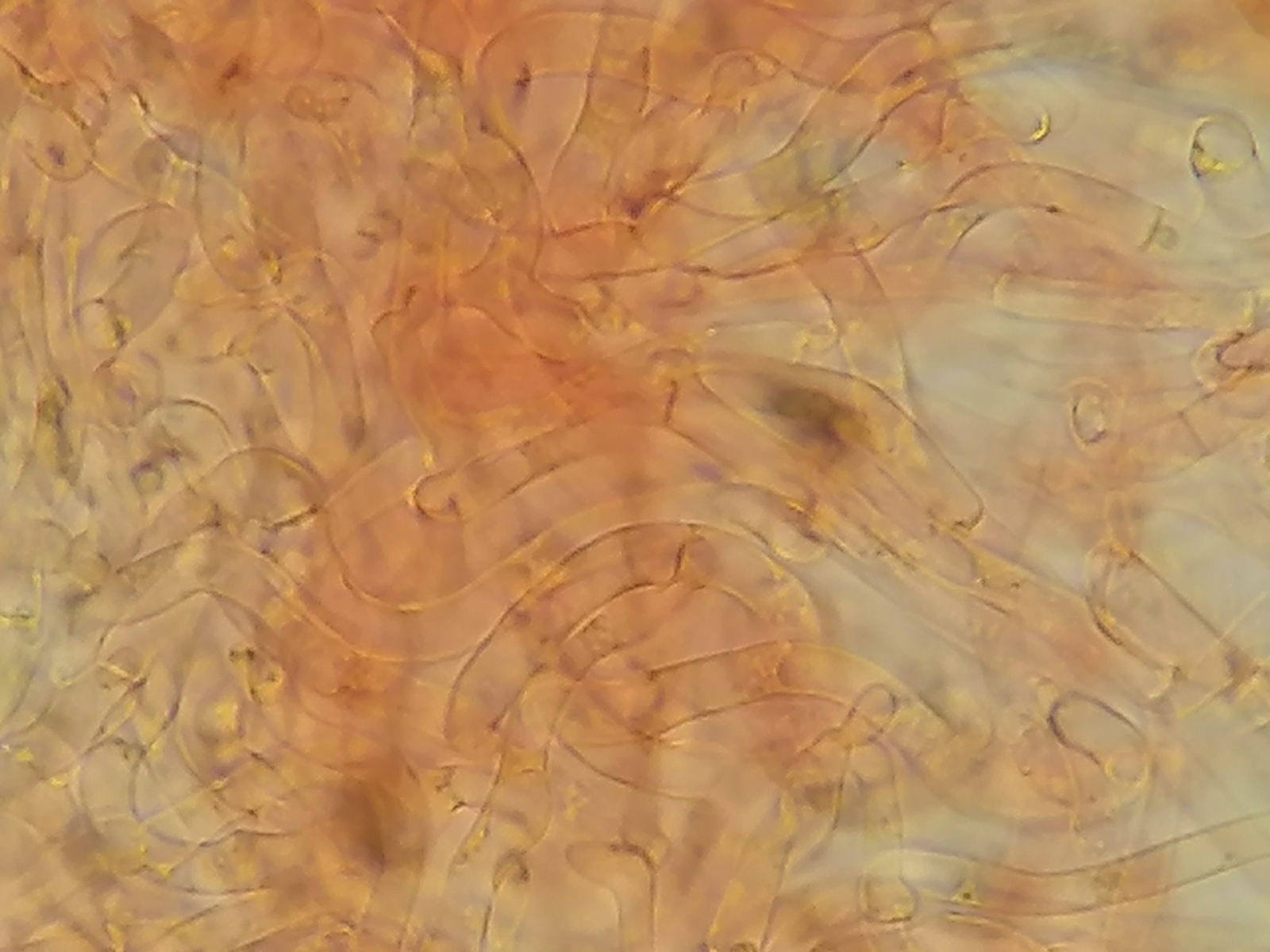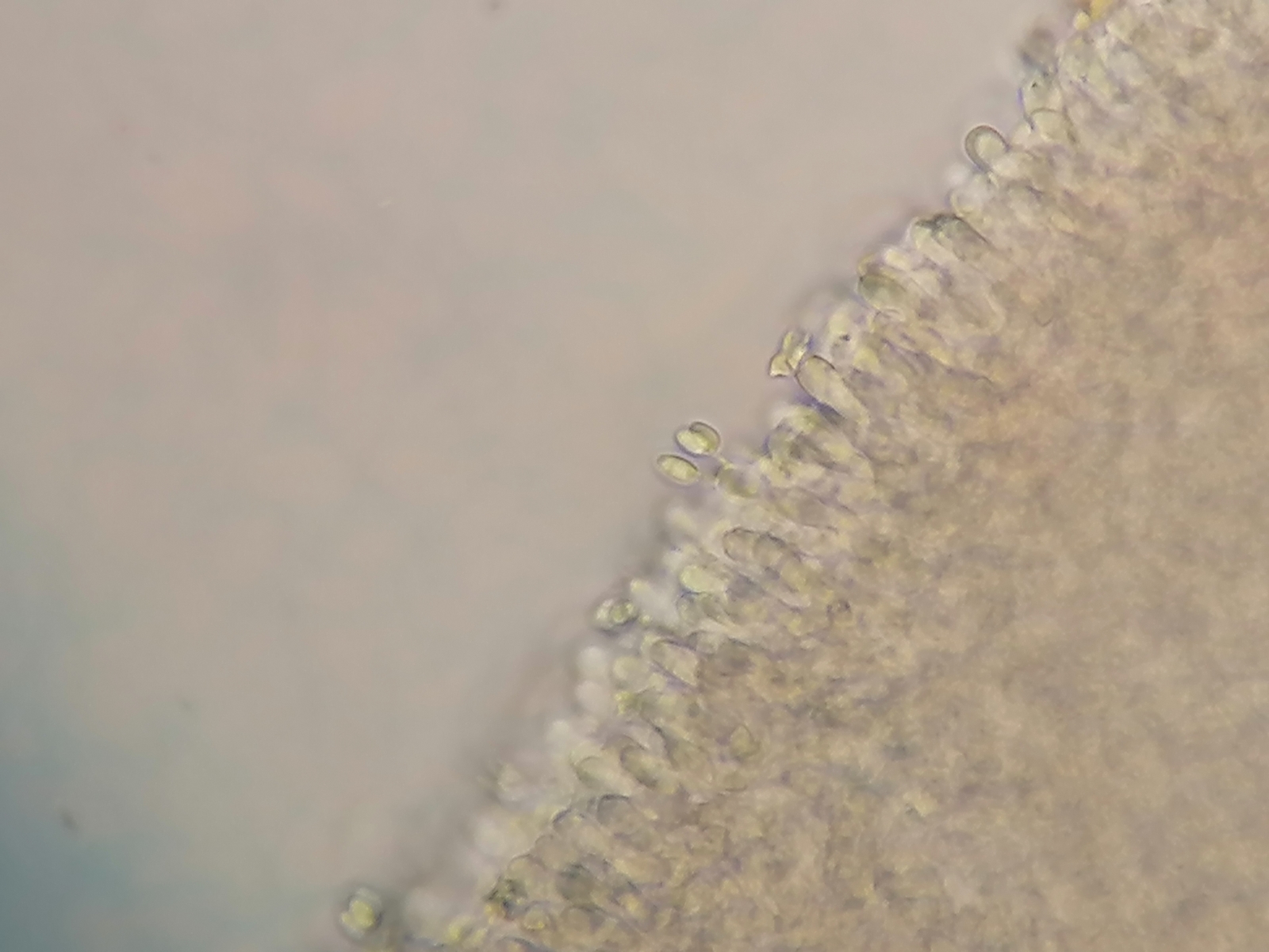 Lamellenseite mit der einzigen Pleurozystide, die ich beim kompletten Lamellenquerschnitt gefunden habe