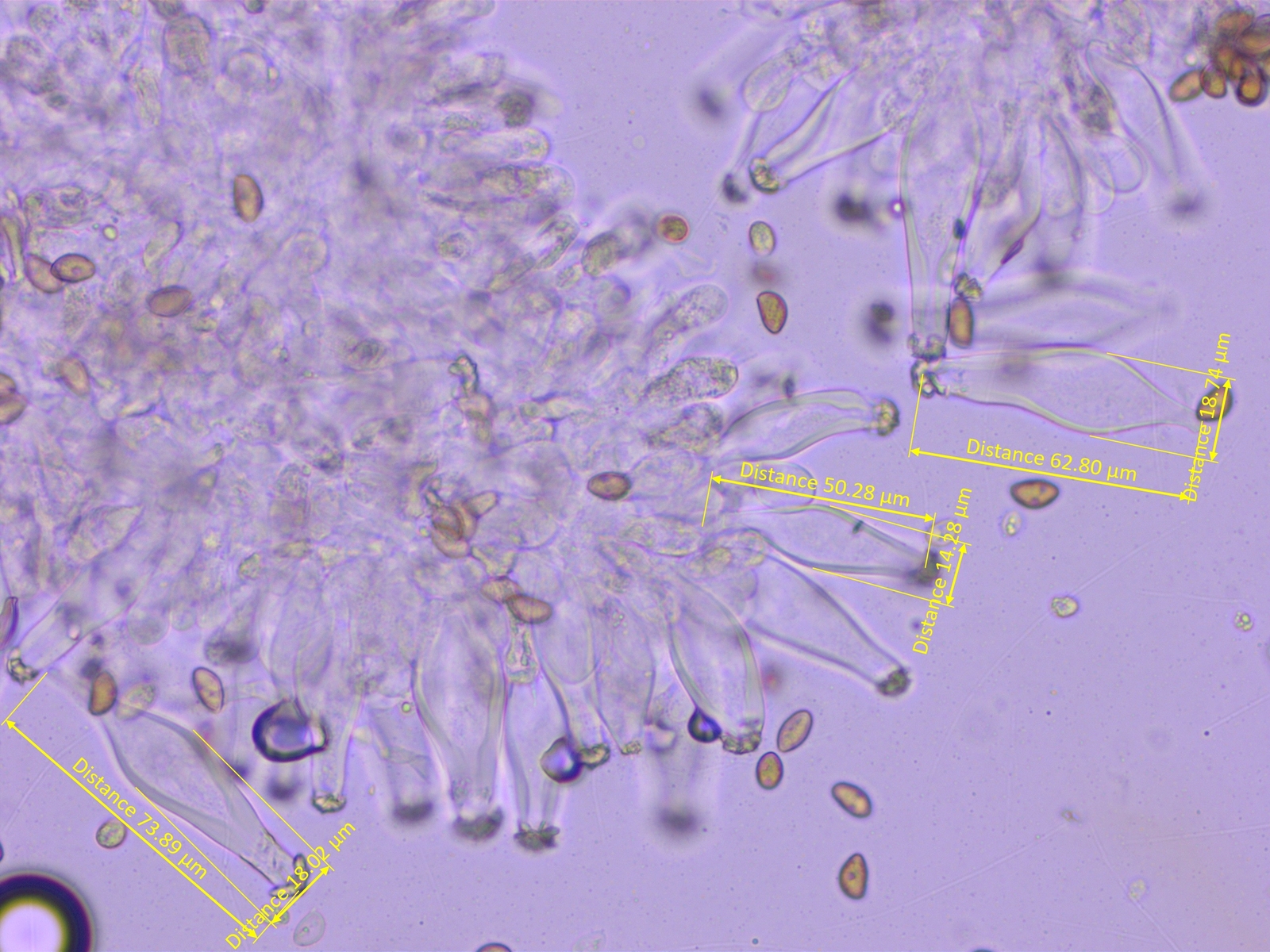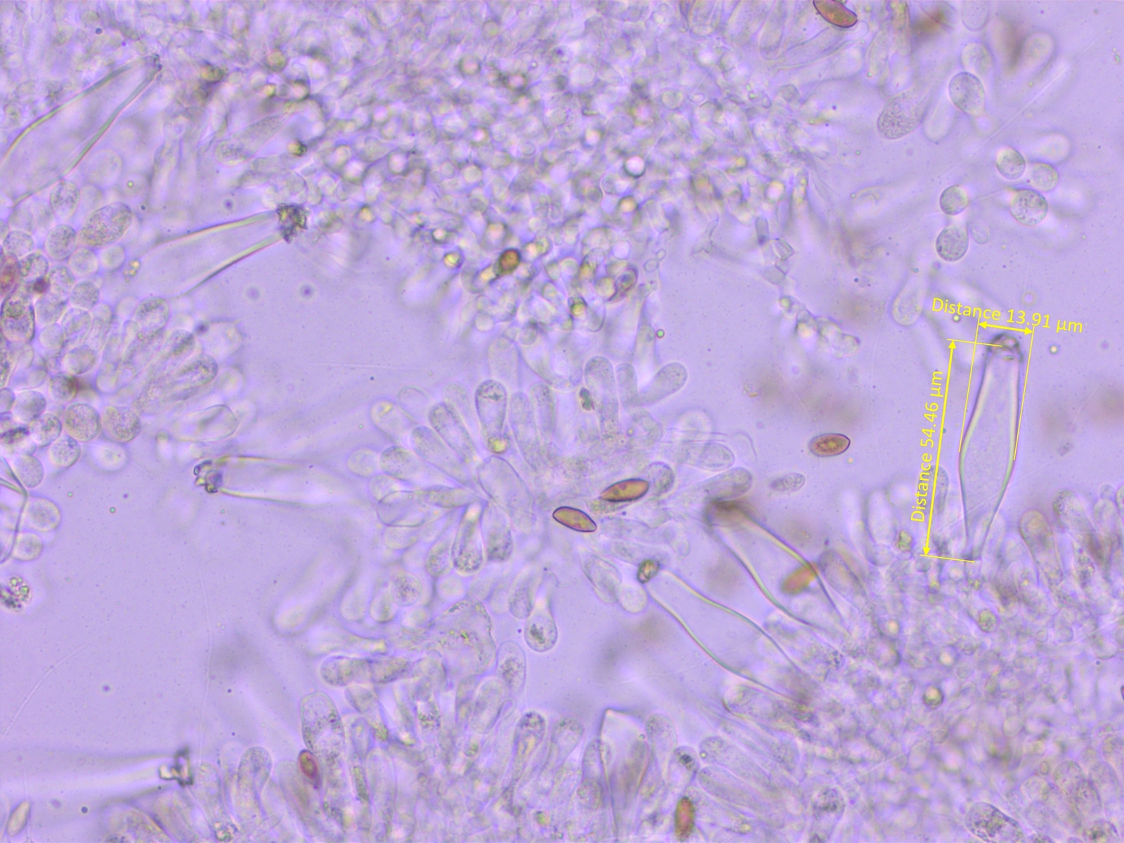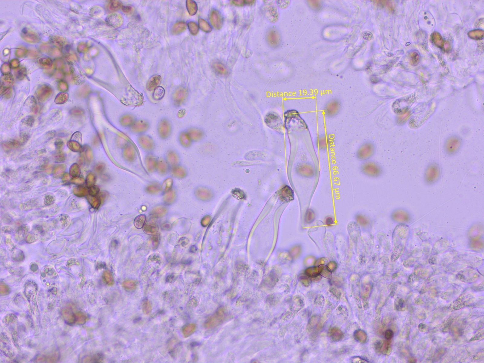 Ganz sicher bin ich mir aber nicht, weil die Sporen etwas kürzer sind als in den Beschreibungen und weil die Zystiden nicht rein keulig sind.
