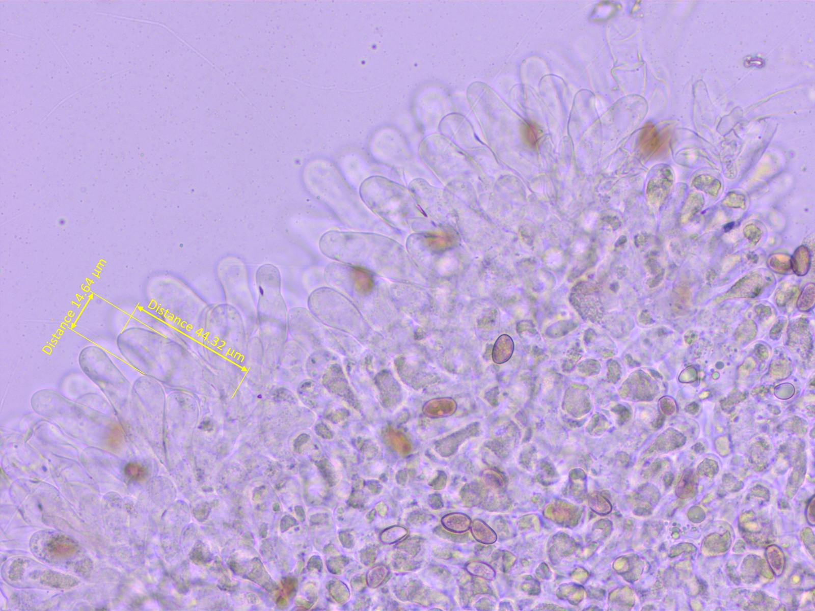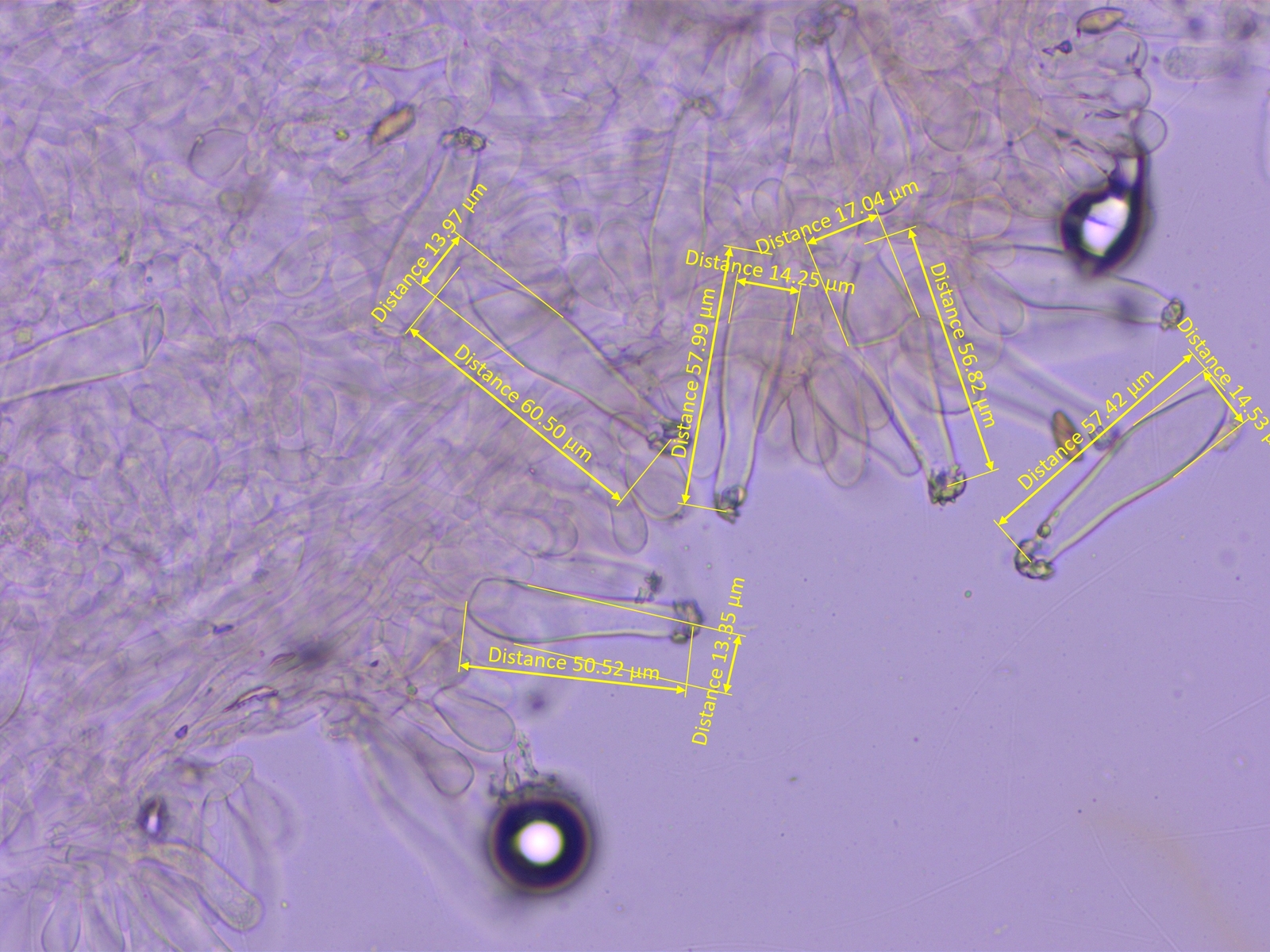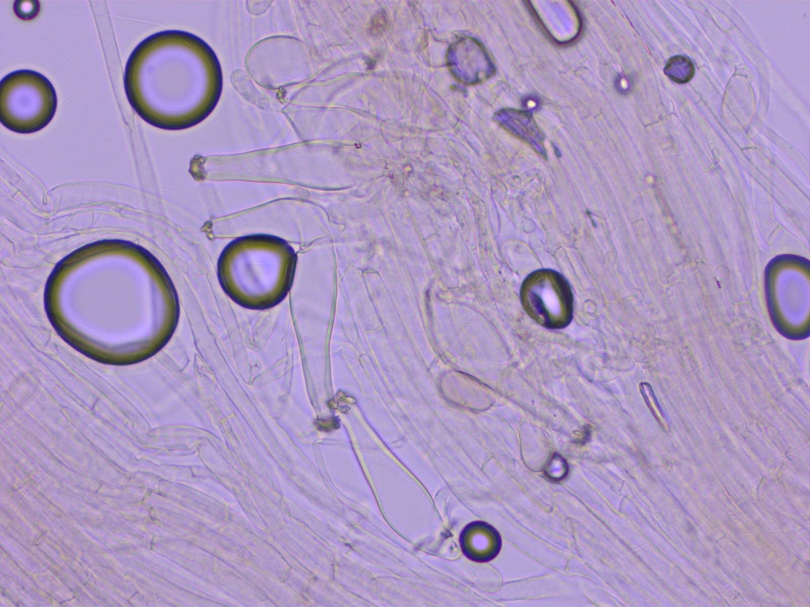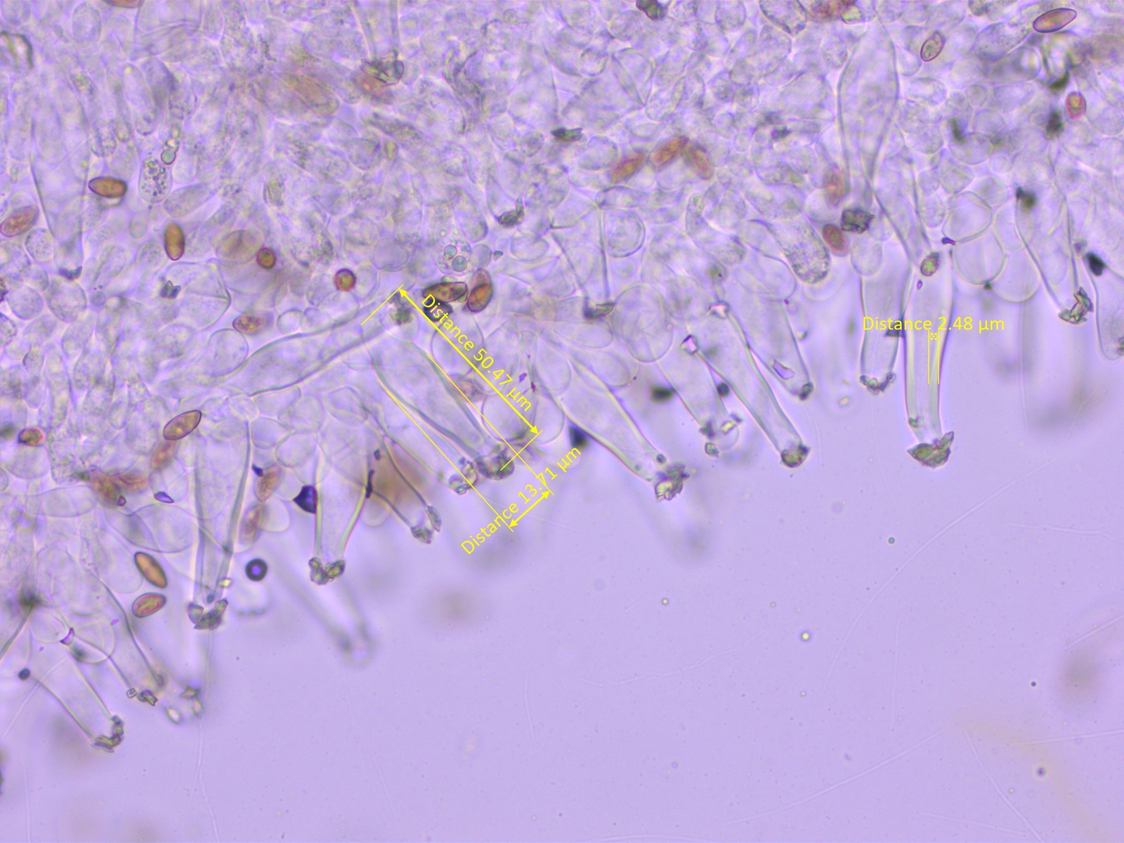 Ganz sicher bin ich mir aber nicht, weil die Sporen etwas kürzer sind als in den Beschreibungen und weil die Zystiden nicht rein keulig sind.
