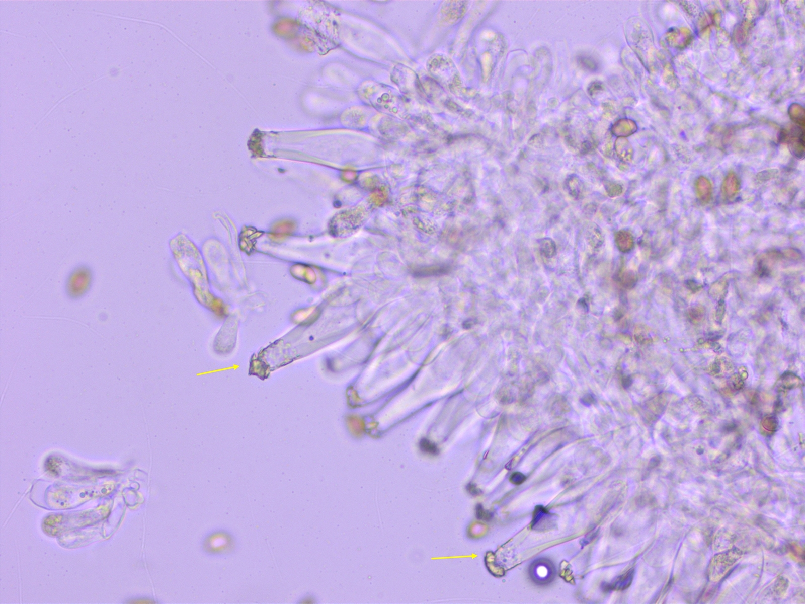 Cheilozystiden mit teils recht langem Fuss, recht dickwandig, in KOH blassgelb, oft irgendwie verbogen. Parazystiden vorhanden.