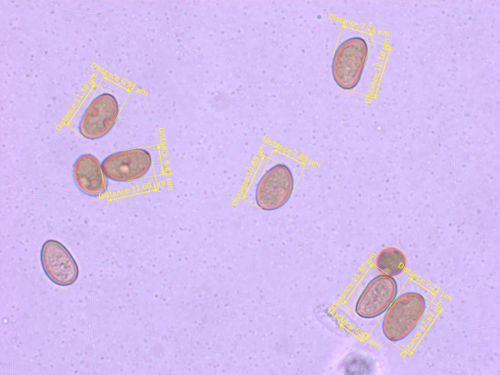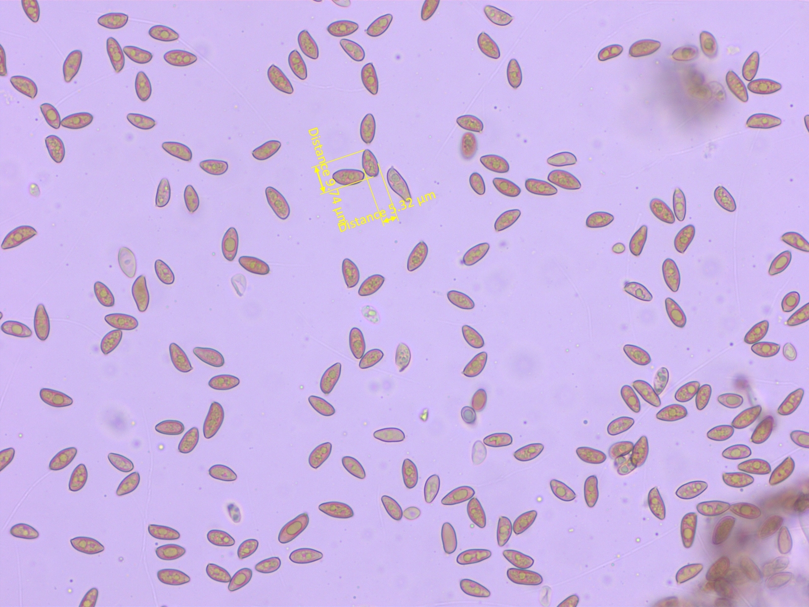 Sporen meistens recht schlank: 10.2-11.3-12.3 x 4.6-5.2-5.9 µm, Q = 1.95-2.18-2.43 (n=20)
