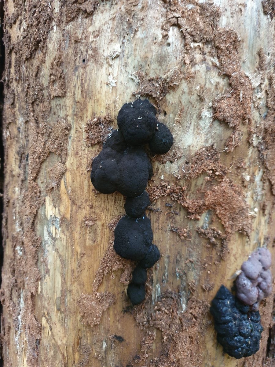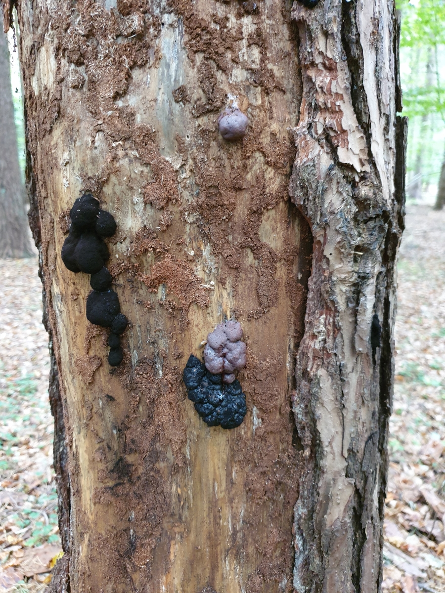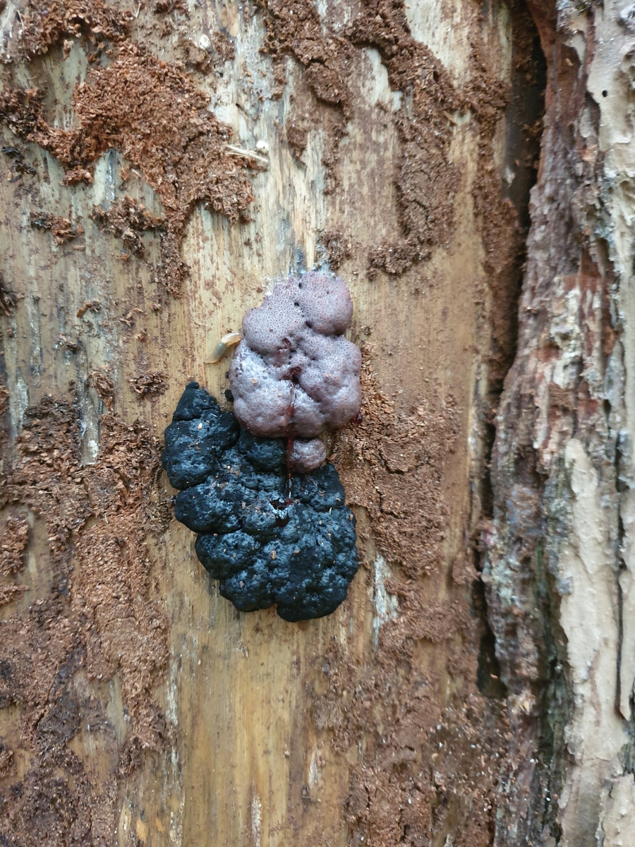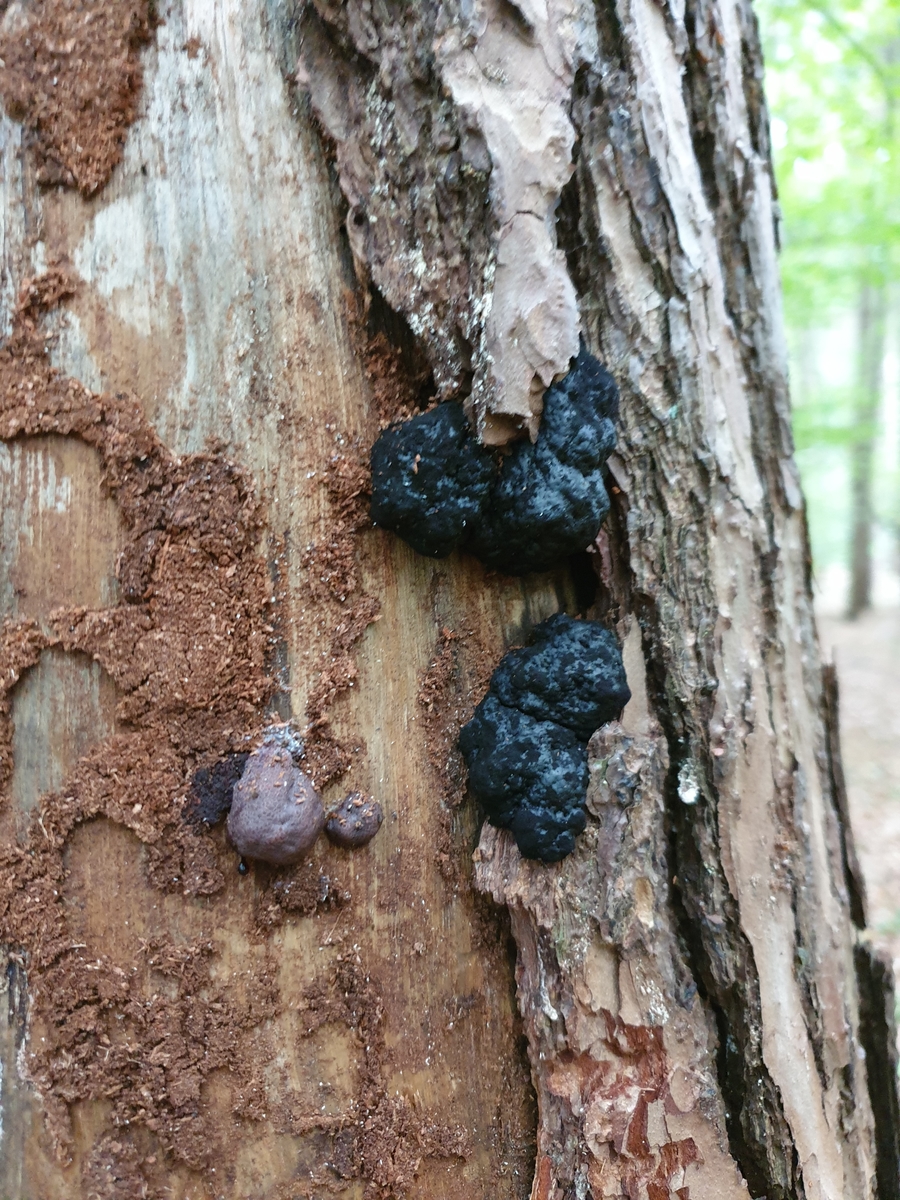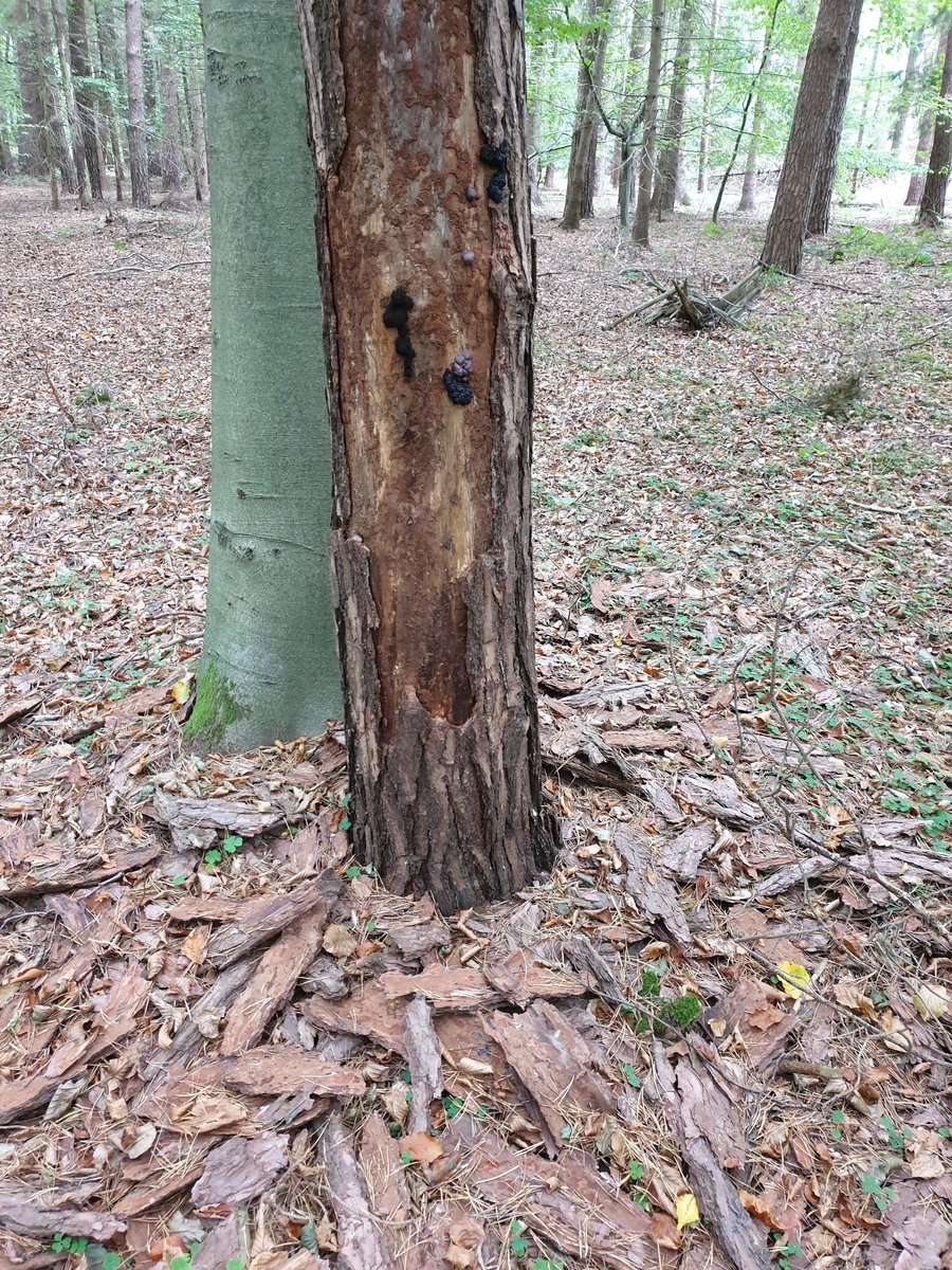 Wie auf dem letzten Bild zu sehen, wurde ein Großteil des Baumes entrindet, ob vom Förster oder nicht, kann ich nicht sagen. Eventuell handelt es sich um eine parasitische Art, die lebende Kiefern befällt?