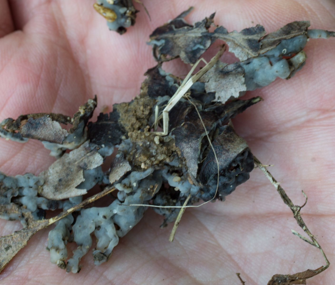 Im Laubwald auf dem Boden habe ich heute dieses komische Teil gefunden. Es scheint irgendwelche kleinen Blätter und Ästchen zu umwachsen. Ich habe keine Ahnung was das ist.