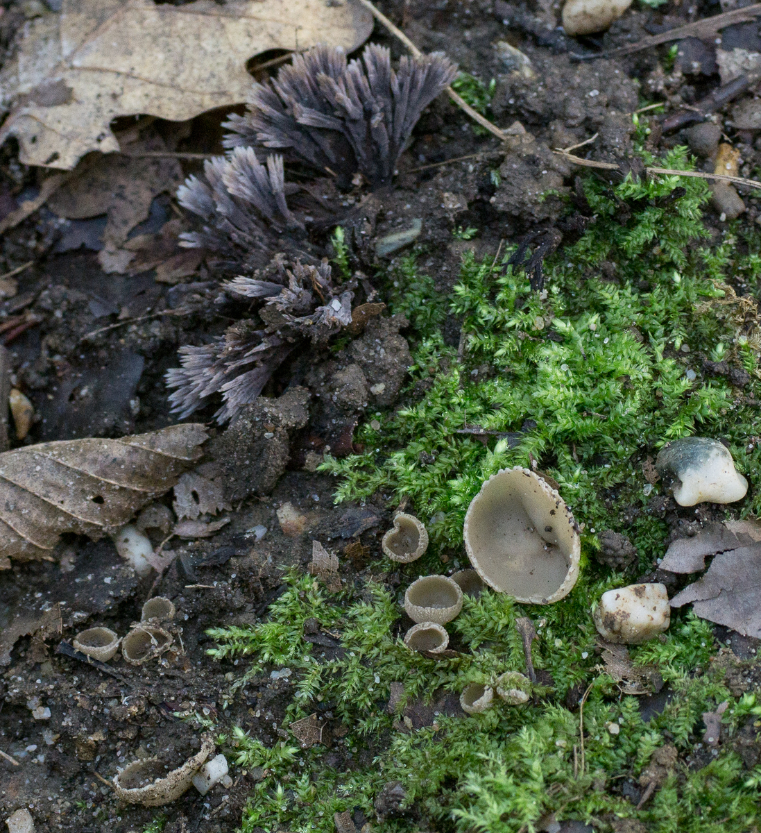 Die zwei ist ziemlich sicher einer der Napfbecherlinge (Tarzetta), vielleicht catinus oder cupularis?