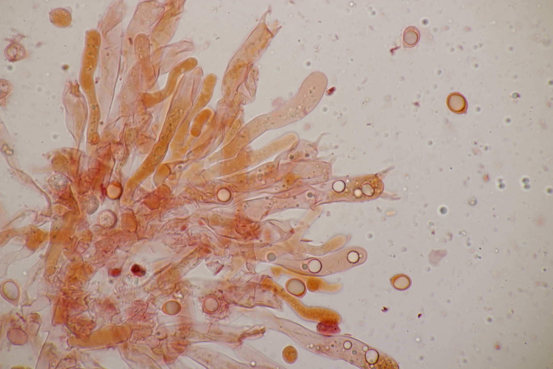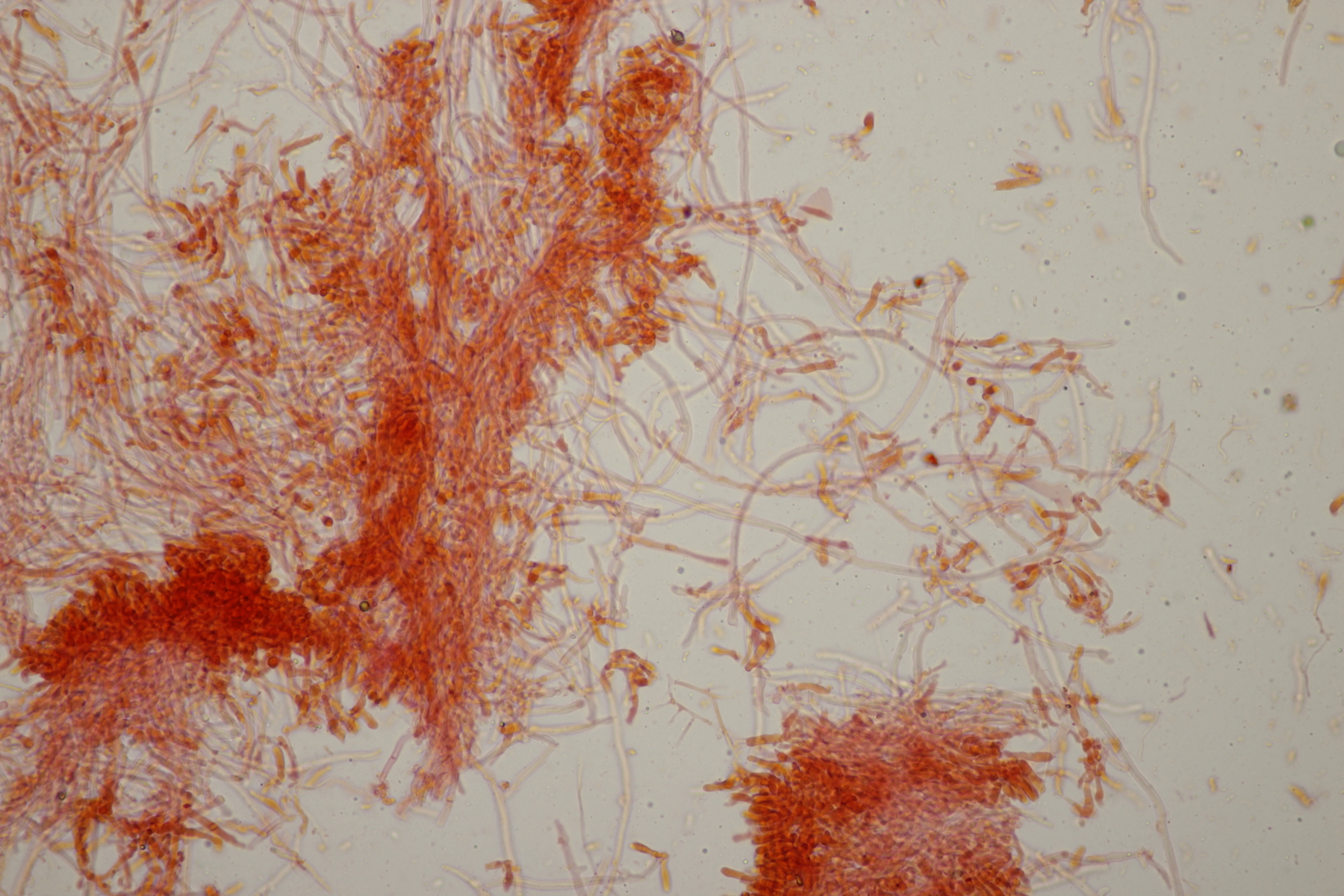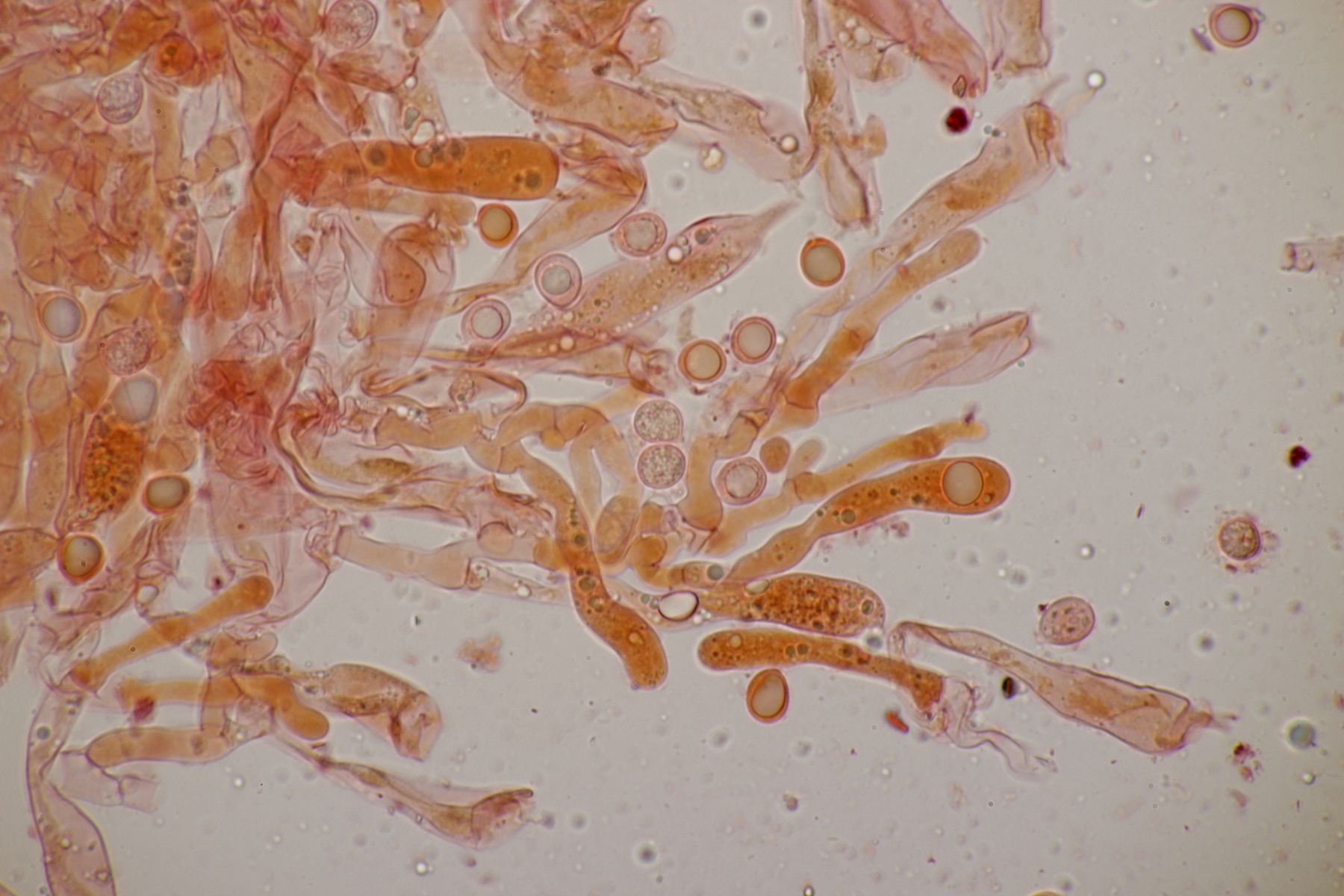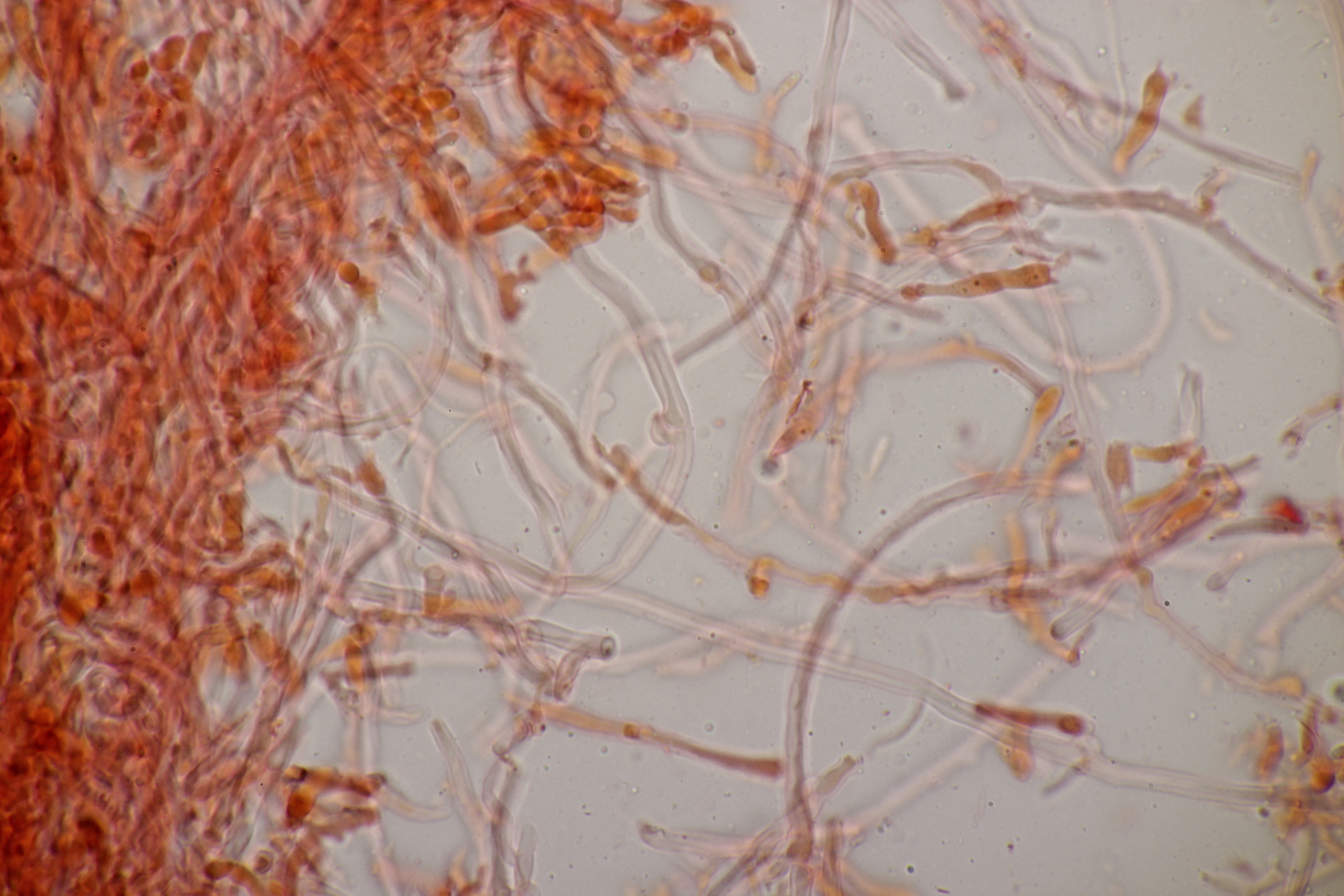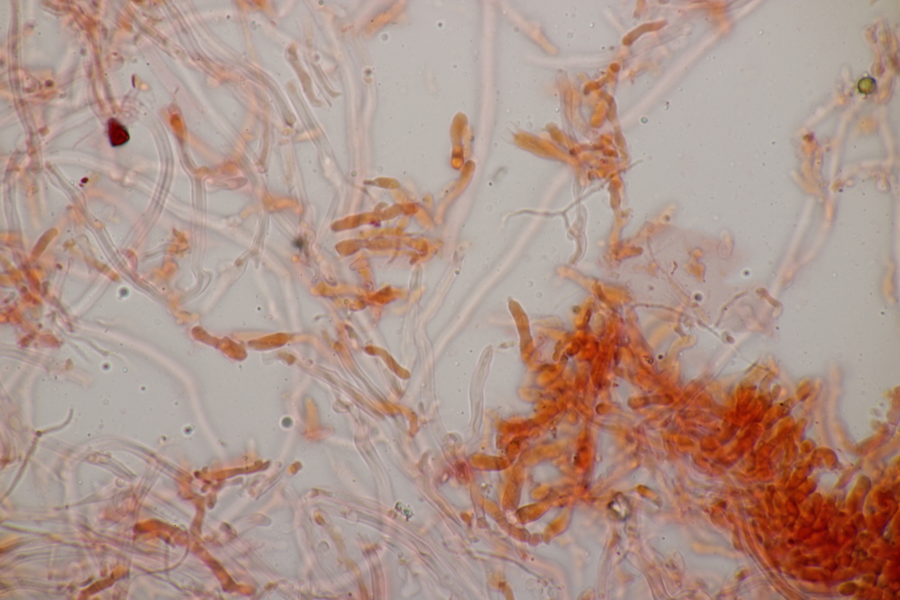 1. Im Feld hatten wir wegen der gestielten Fruchtkörper an Sistotrema gedacht, das paßt aber mikroskopisch gar nicht. Leider komme ich mit den leicht gestielten Fruchtkörper leider nicht so wirklich auf irgendeinen grünen Zweig.... Ideen sind also willkommen. Sporen messen 5.4+-0.4 µm x 1.5+-0.1 µm, Q=3.7+-0.5, bzw 4.7-6.0 µm x 1.2-1.7 µm, Q=2.9-4.8, sind allantoid und haben an jedem Ende einen Tropfen. Substrat wahr wohl Laubholz. Auffallend die sehr dickwandigen Hyphen mit schmalem Lumen und sehr ausgeprägten Schnallen...