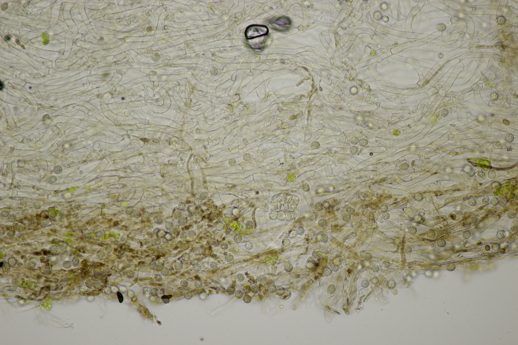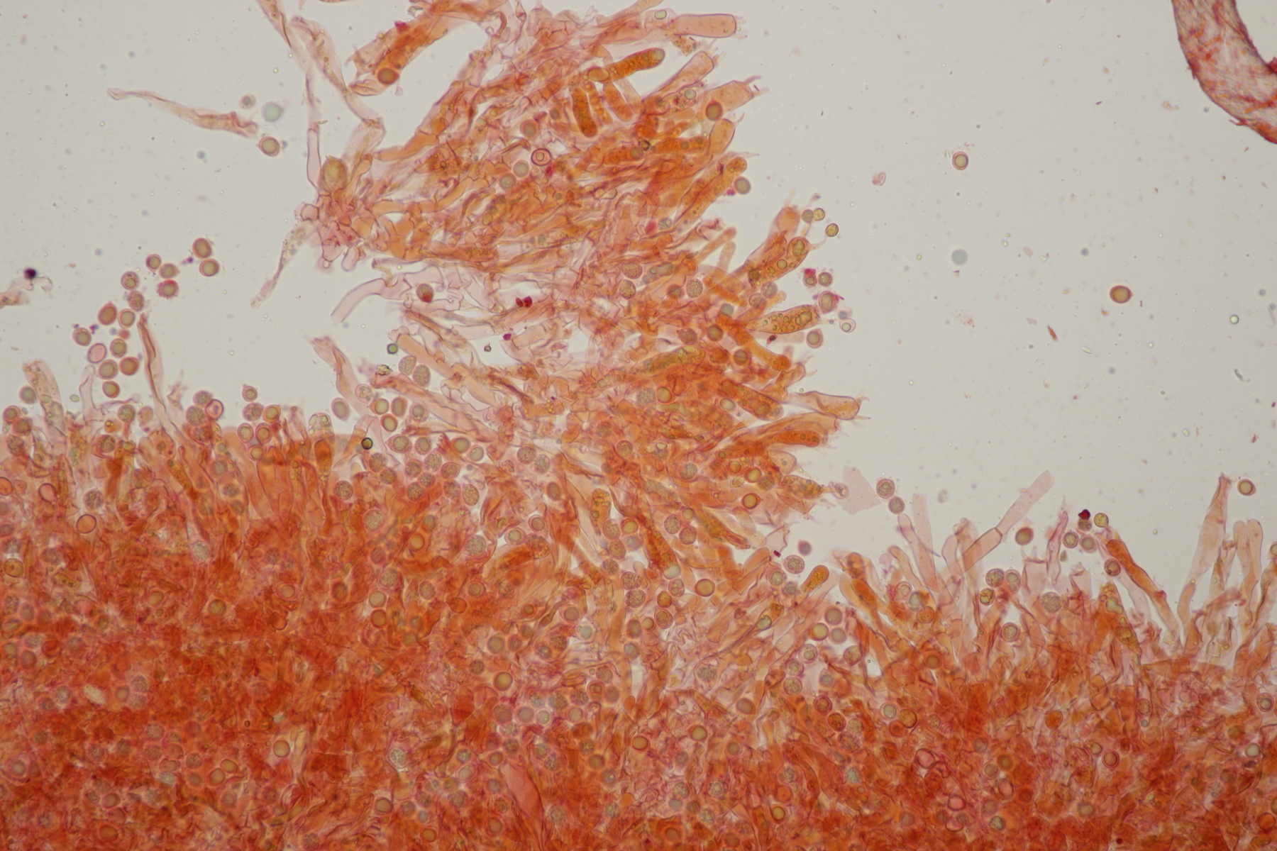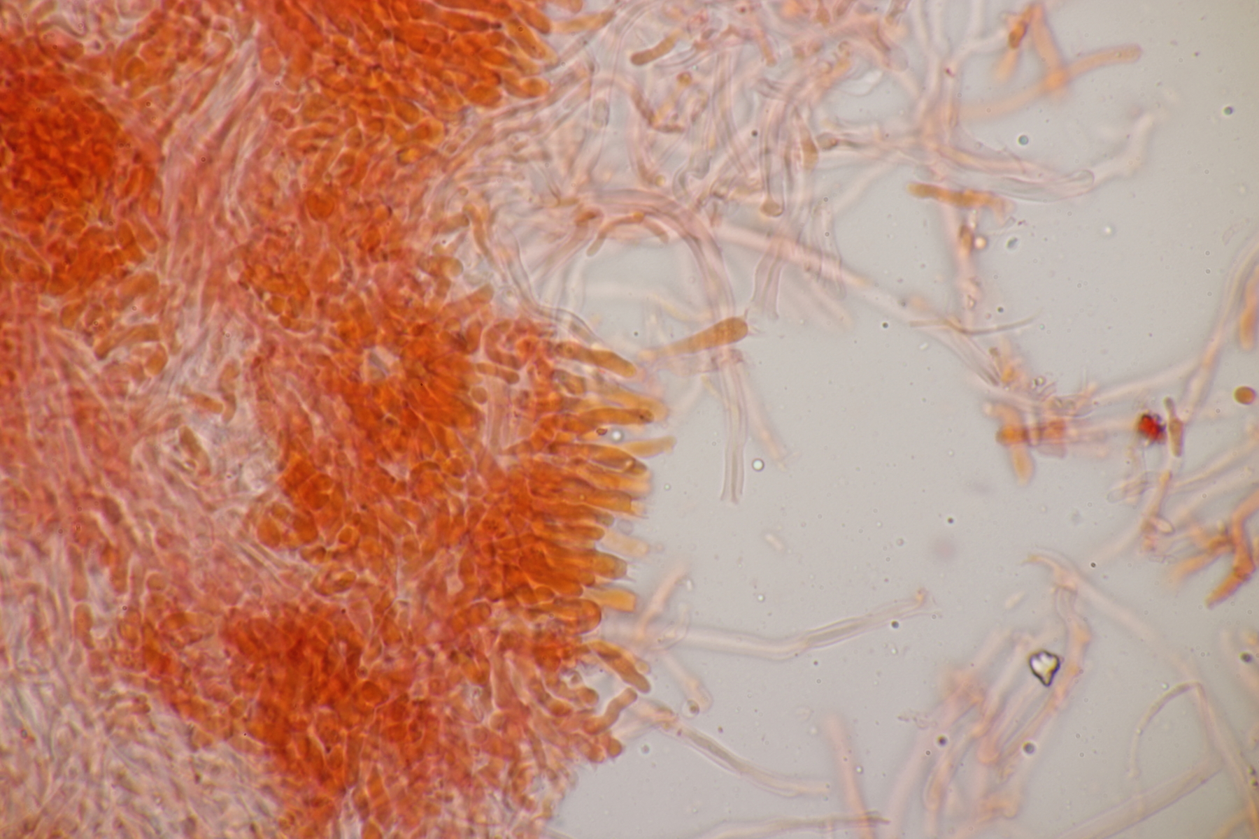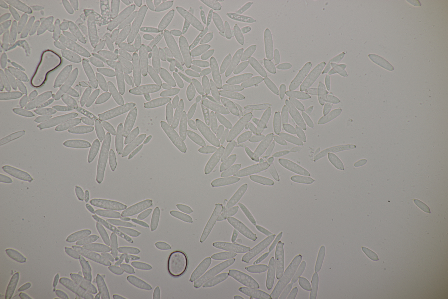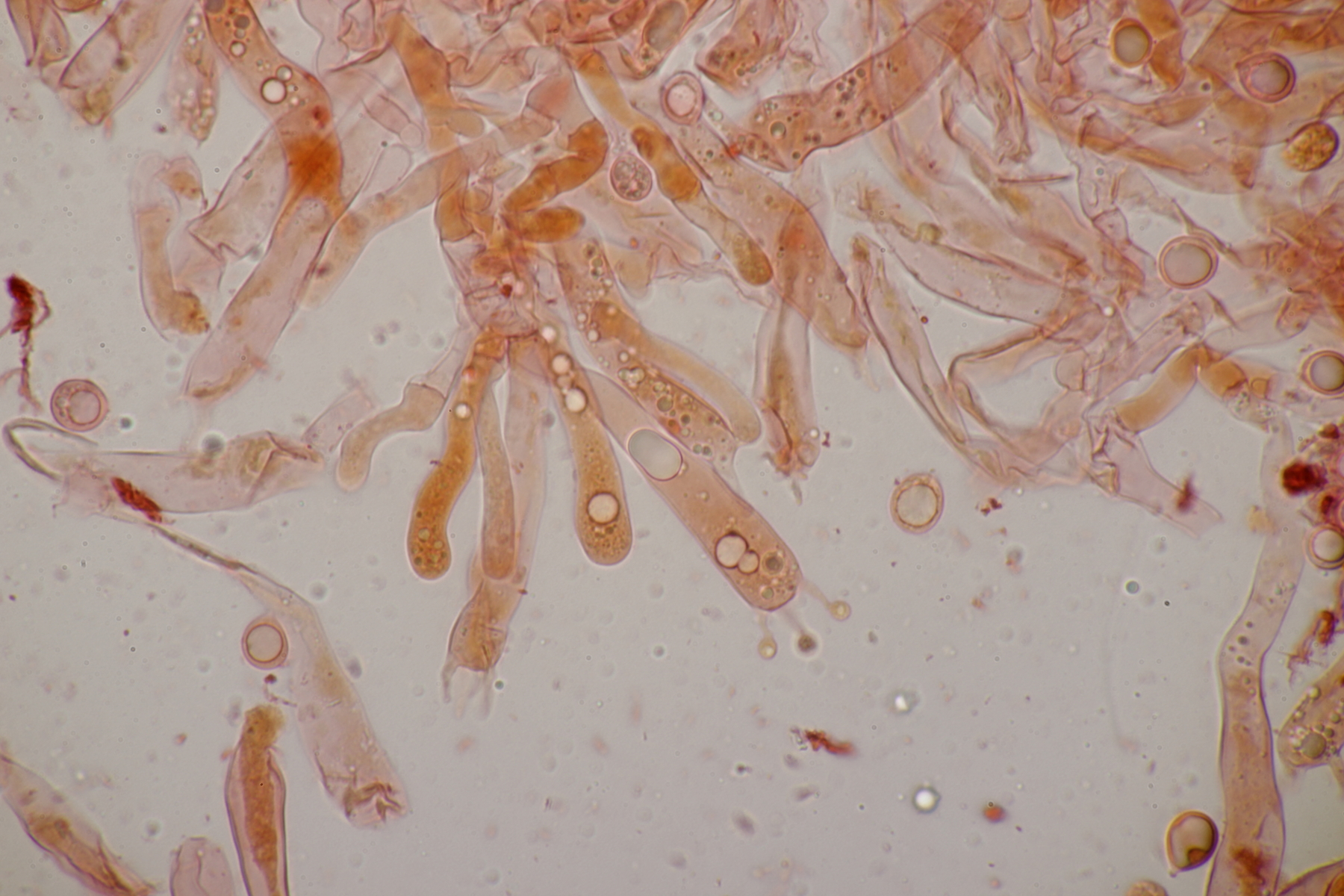 1. Im Feld hatten wir wegen der gestielten Fruchtkörper an Sistotrema gedacht, das paßt aber mikroskopisch gar nicht. Leider komme ich mit den leicht gestielten Fruchtkörper leider nicht so wirklich auf irgendeinen grünen Zweig.... Ideen sind also willkommen. Sporen messen 5.4+-0.4 µm x 1.5+-0.1 µm, Q=3.7+-0.5, bzw 4.7-6.0 µm x 1.2-1.7 µm, Q=2.9-4.8, sind allantoid und haben an jedem Ende einen Tropfen. Substrat wahr wohl Laubholz. Auffallend die sehr dickwandigen Hyphen mit schmalem Lumen und sehr ausgeprägten Schnallen...