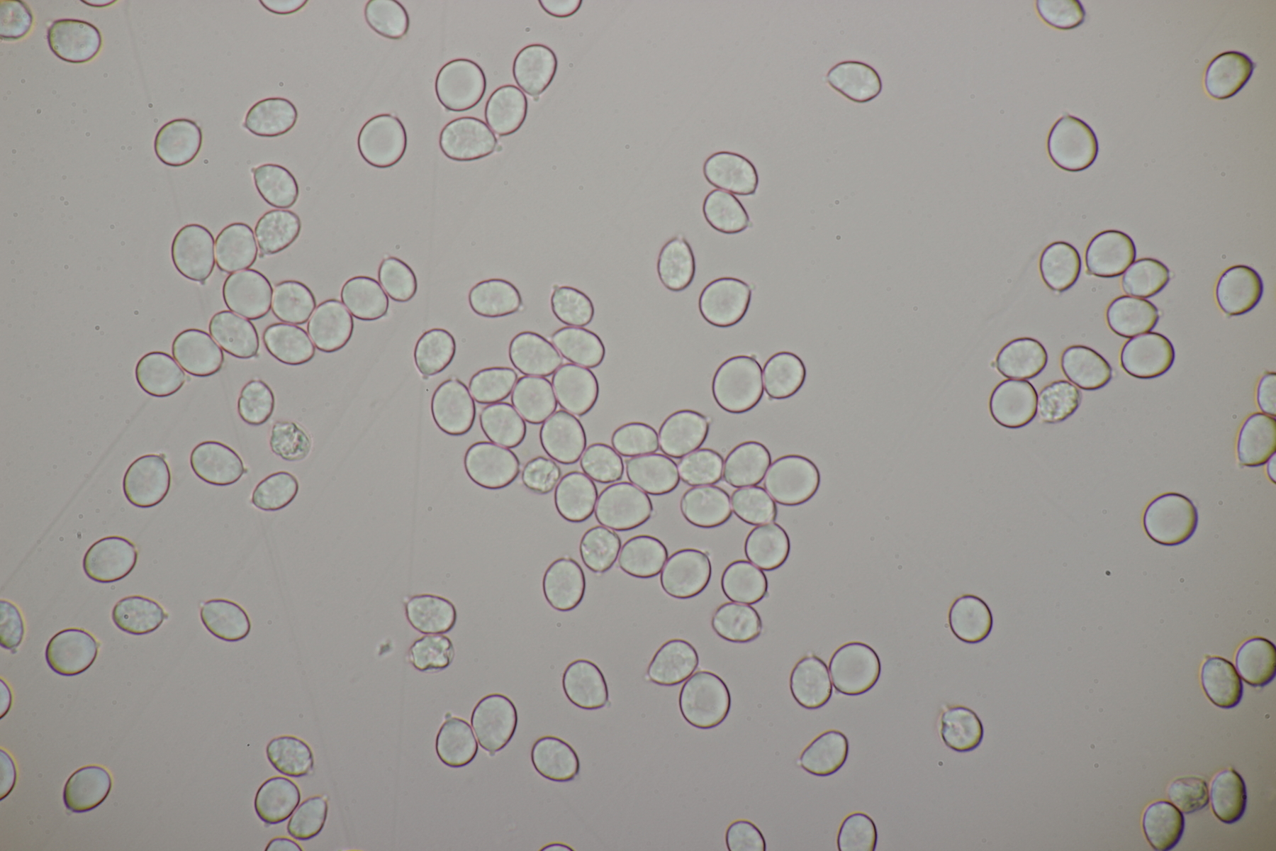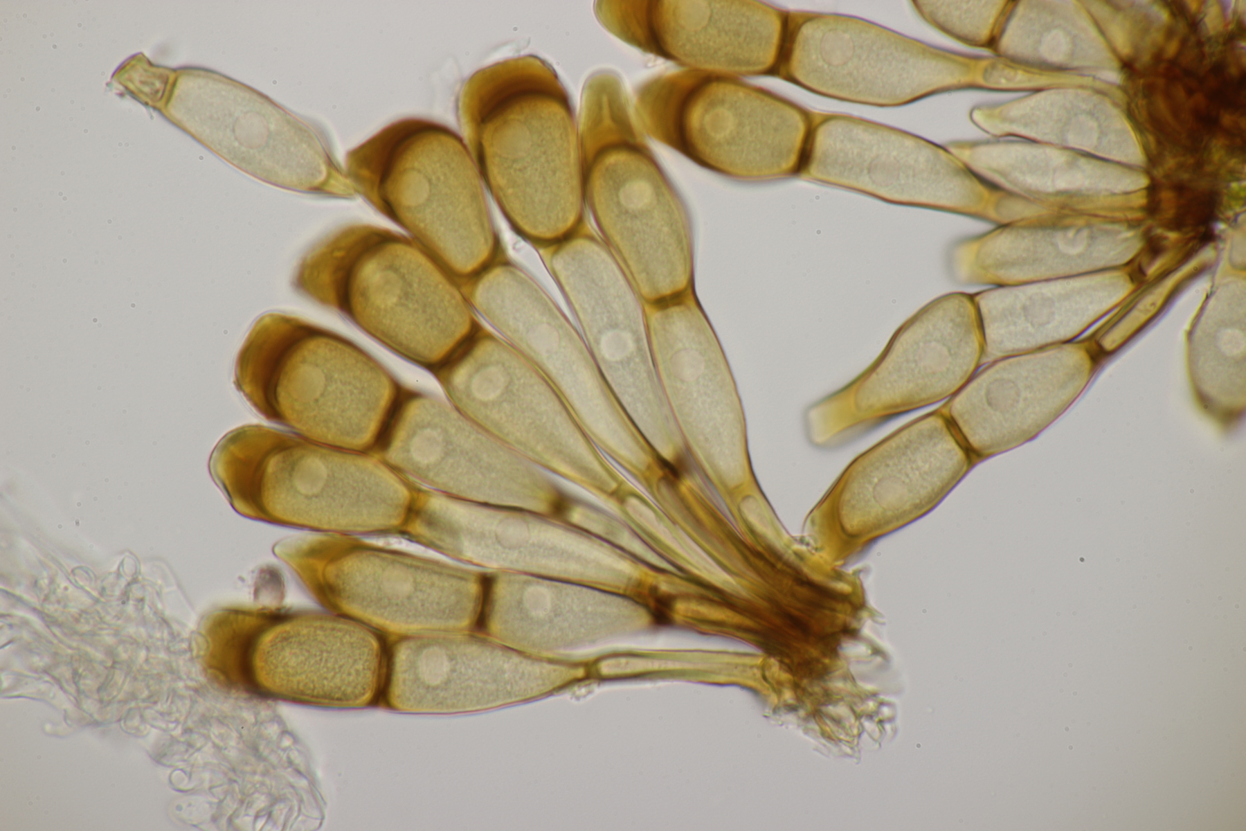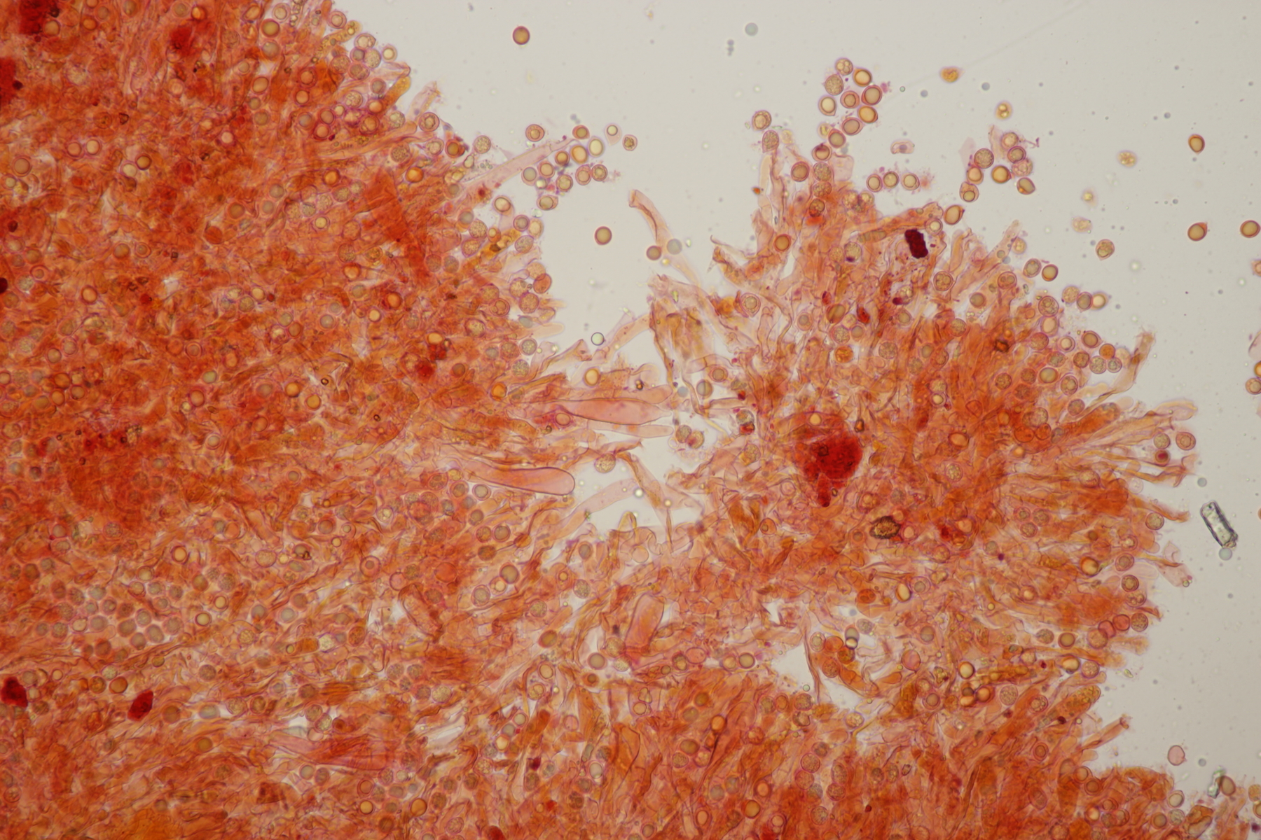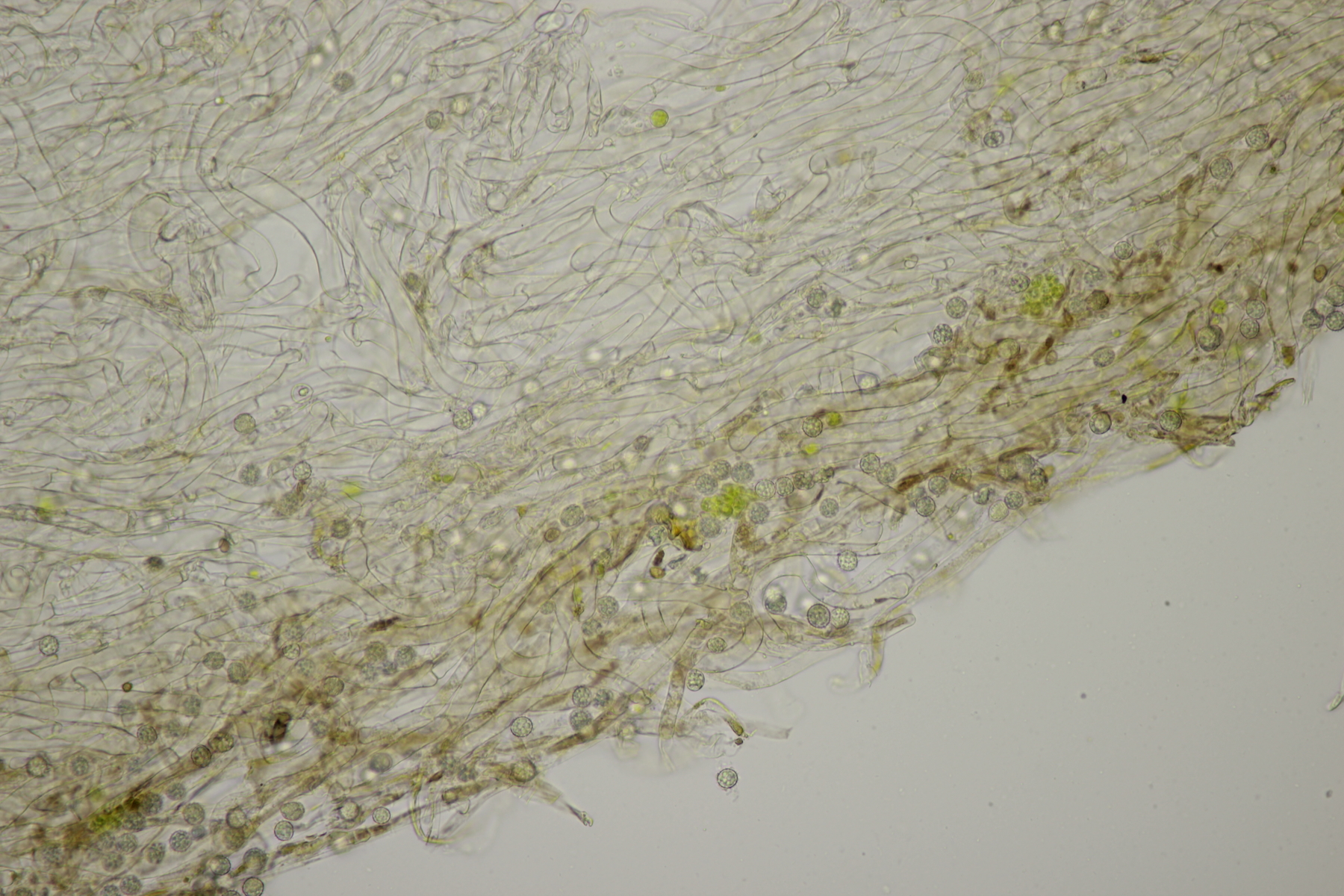 1. Im Feld hatten wir wegen der gestielten Fruchtkörper an Sistotrema gedacht, das paßt aber mikroskopisch gar nicht. Leider komme ich mit den leicht gestielten Fruchtkörper leider nicht so wirklich auf irgendeinen grünen Zweig.... Ideen sind also willkommen. Sporen messen 5.4+-0.4 µm x 1.5+-0.1 µm, Q=3.7+-0.5, bzw 4.7-6.0 µm x 1.2-1.7 µm, Q=2.9-4.8, sind allantoid und haben an jedem Ende einen Tropfen. Substrat wahr wohl Laubholz. Auffallend die sehr dickwandigen Hyphen mit schmalem Lumen und sehr ausgeprägten Schnallen...