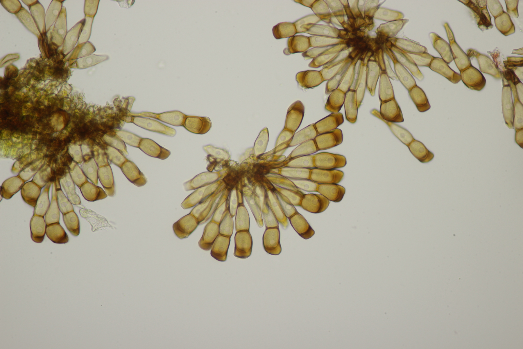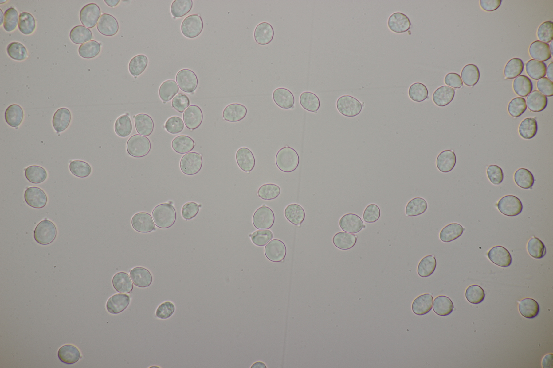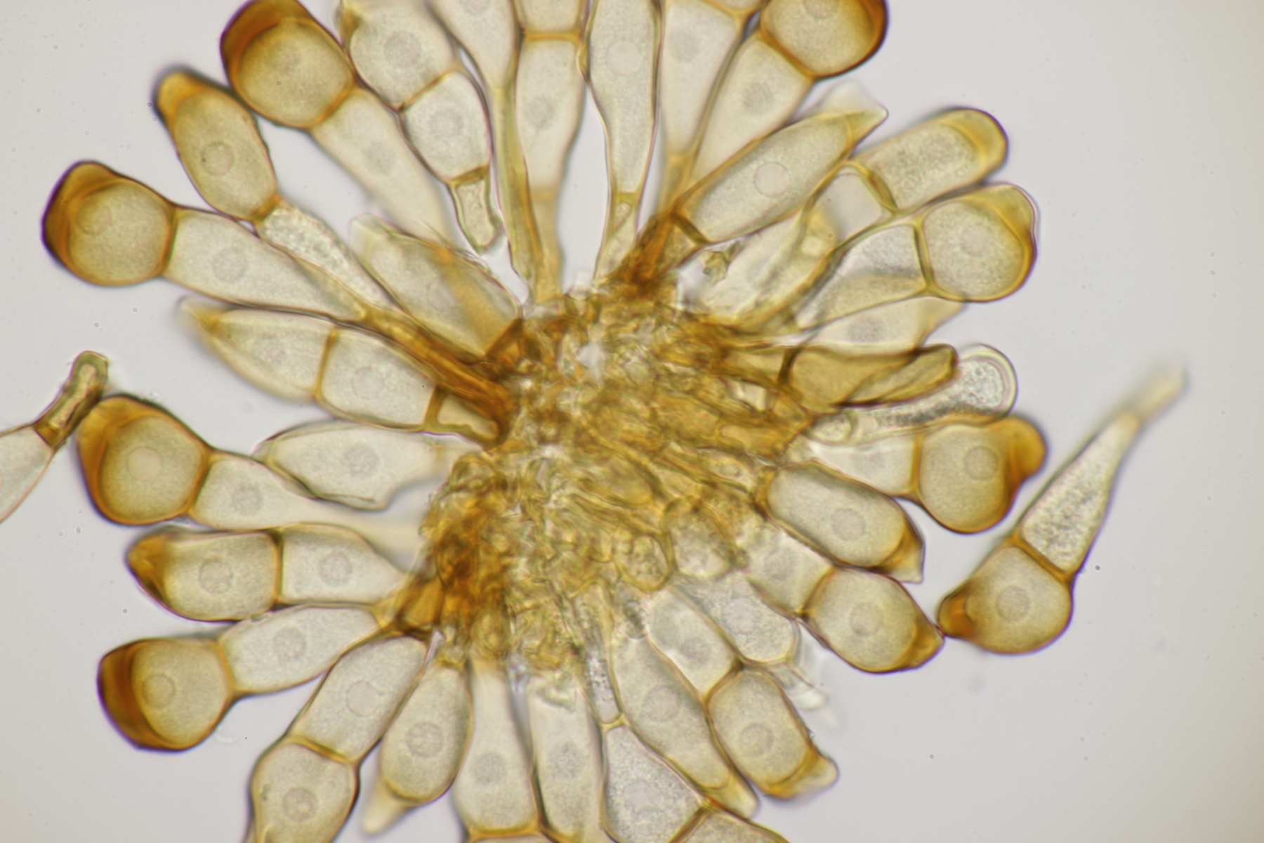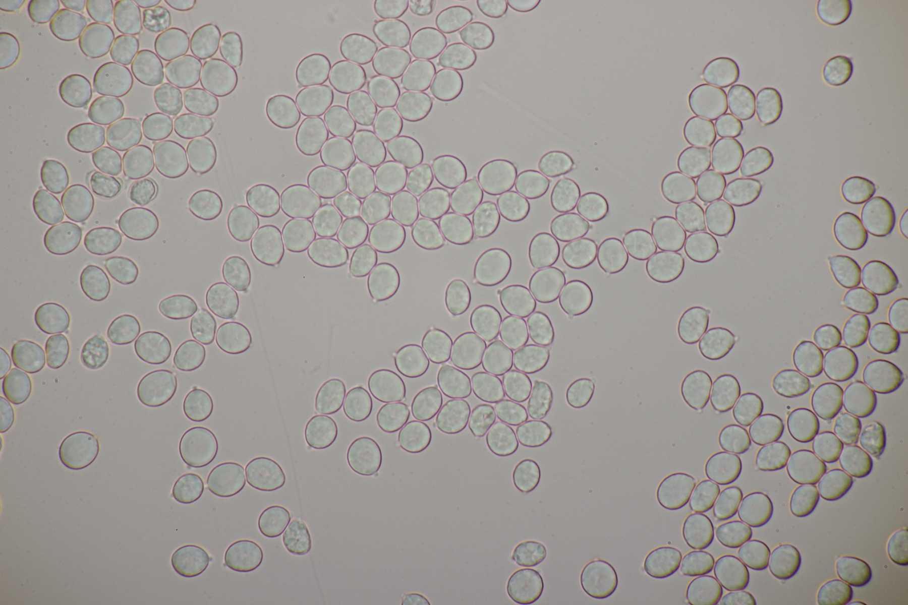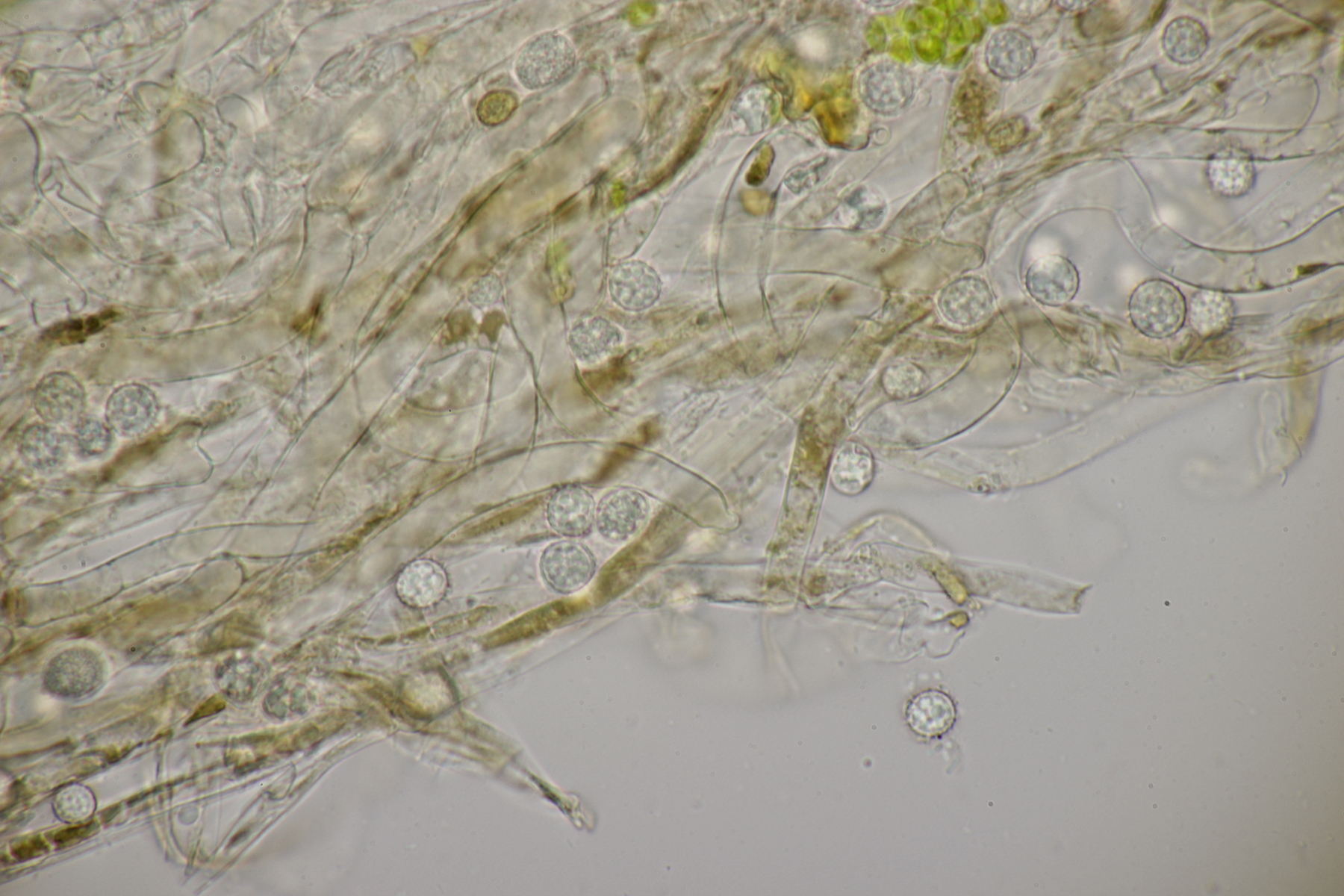 1. Im Feld hatten wir wegen der gestielten Fruchtkörper an Sistotrema gedacht, das paßt aber mikroskopisch gar nicht. Leider komme ich mit den leicht gestielten Fruchtkörper leider nicht so wirklich auf irgendeinen grünen Zweig.... Ideen sind also willkommen. Sporen messen 5.4+-0.4 µm x 1.5+-0.1 µm, Q=3.7+-0.5, bzw 4.7-6.0 µm x 1.2-1.7 µm, Q=2.9-4.8, sind allantoid und haben an jedem Ende einen Tropfen. Substrat wahr wohl Laubholz. Auffallend die sehr dickwandigen Hyphen mit schmalem Lumen und sehr ausgeprägten Schnallen...