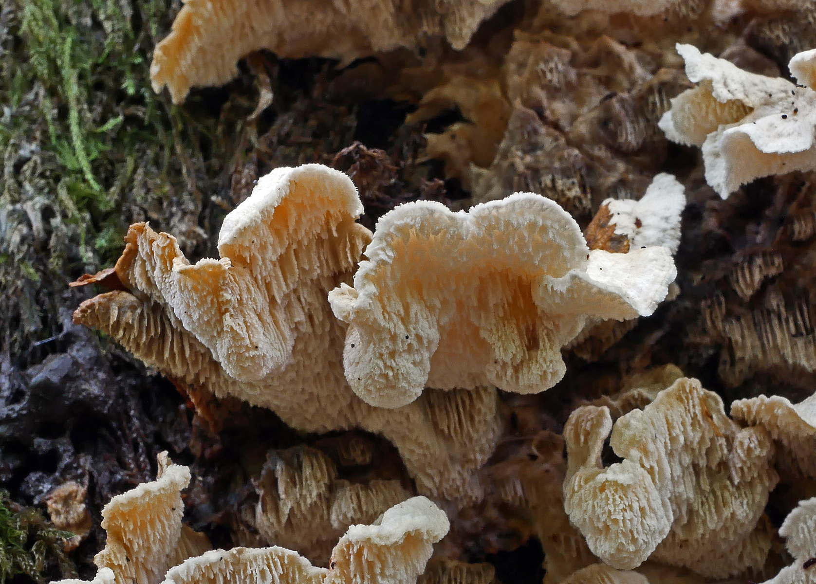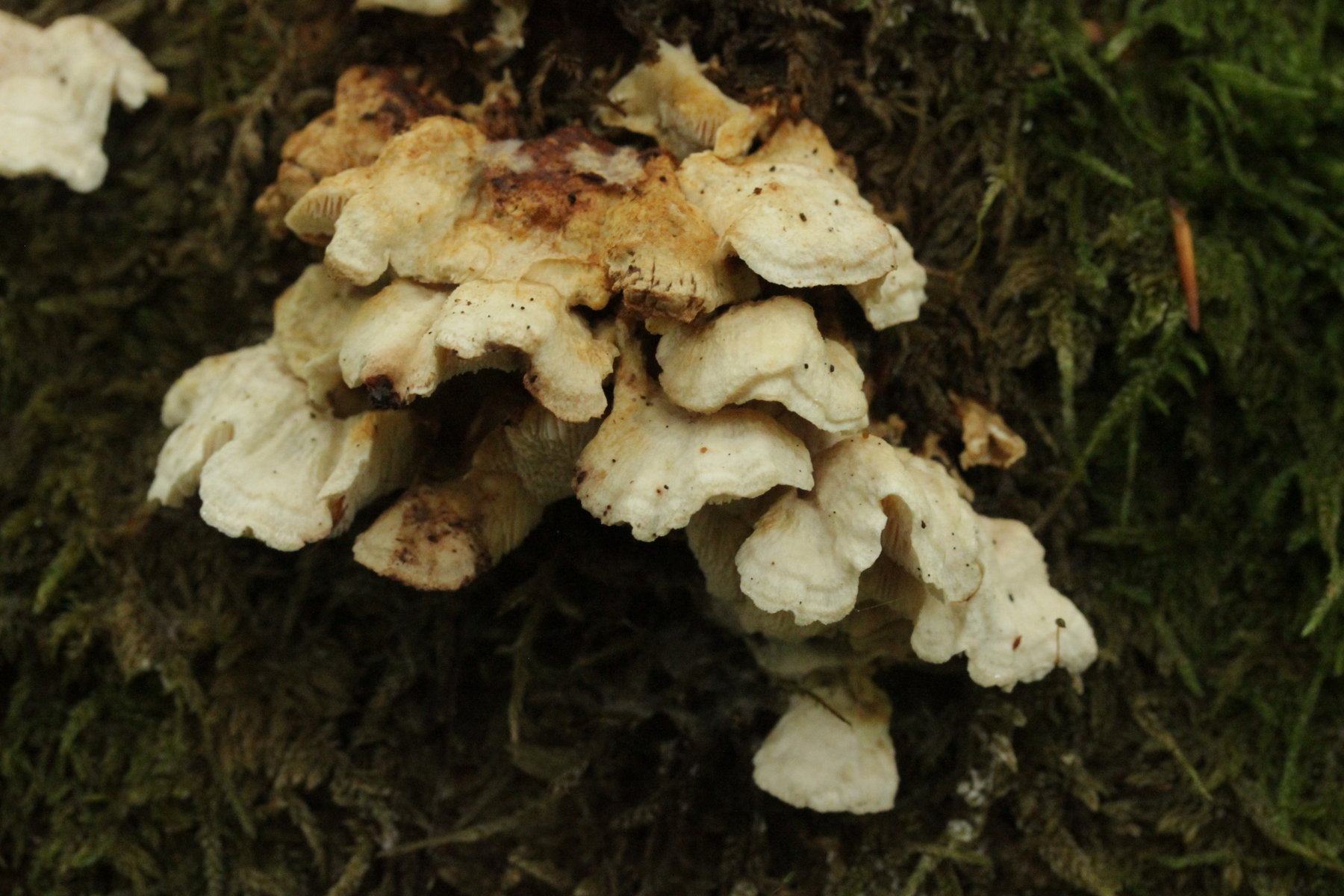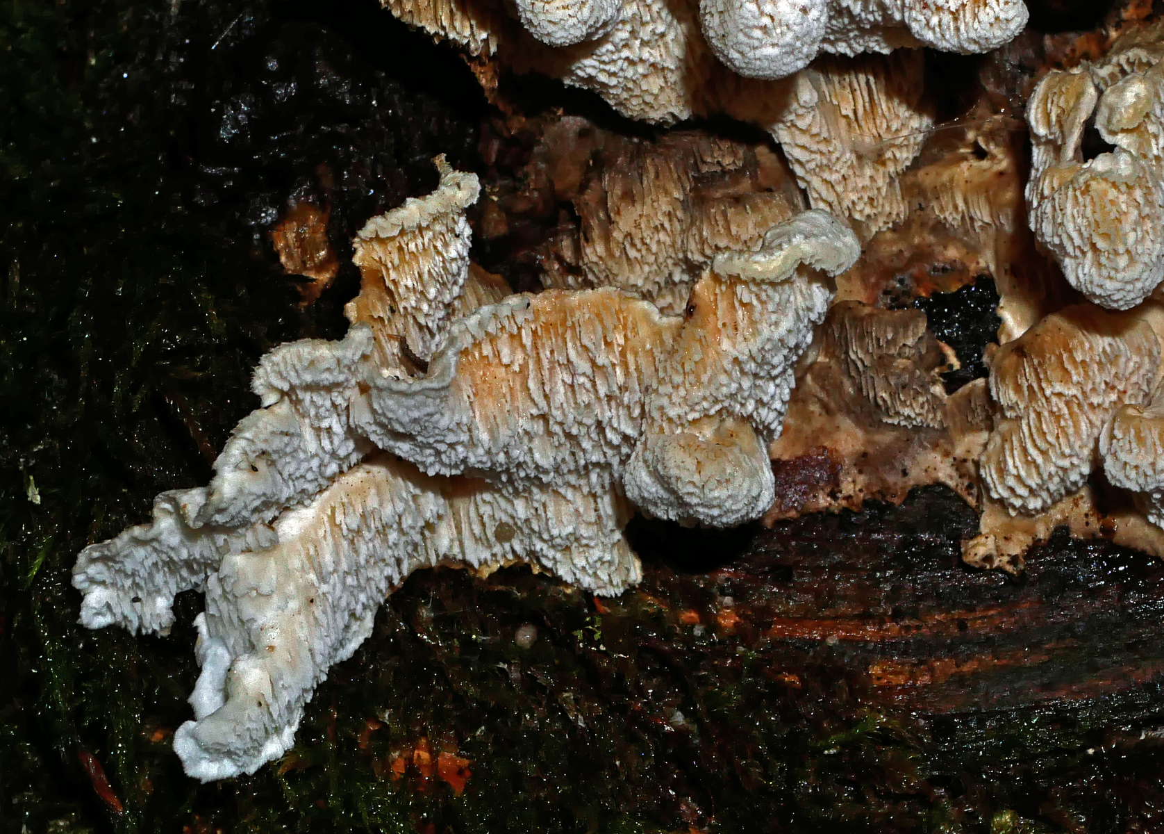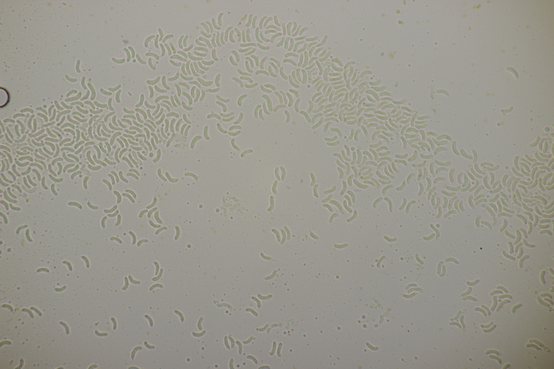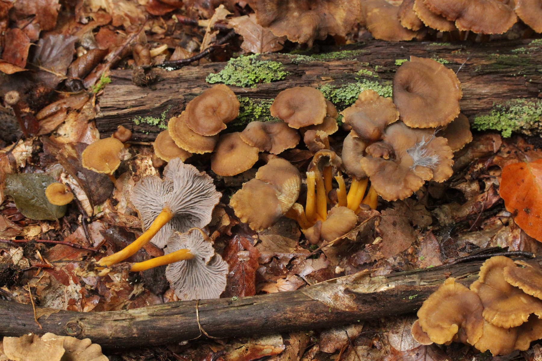 1. Im Feld hatten wir wegen der gestielten Fruchtkörper an Sistotrema gedacht, das paßt aber mikroskopisch gar nicht. Leider komme ich mit den leicht gestielten Fruchtkörper leider nicht so wirklich auf irgendeinen grünen Zweig.... Ideen sind also willkommen. Sporen messen 5.4+-0.4 µm x 1.5+-0.1 µm, Q=3.7+-0.5, bzw 4.7-6.0 µm x 1.2-1.7 µm, Q=2.9-4.8, sind allantoid und haben an jedem Ende einen Tropfen. Substrat wahr wohl Laubholz. Auffallend die sehr dickwandigen Hyphen mit schmalem Lumen und sehr ausgeprägten Schnallen...