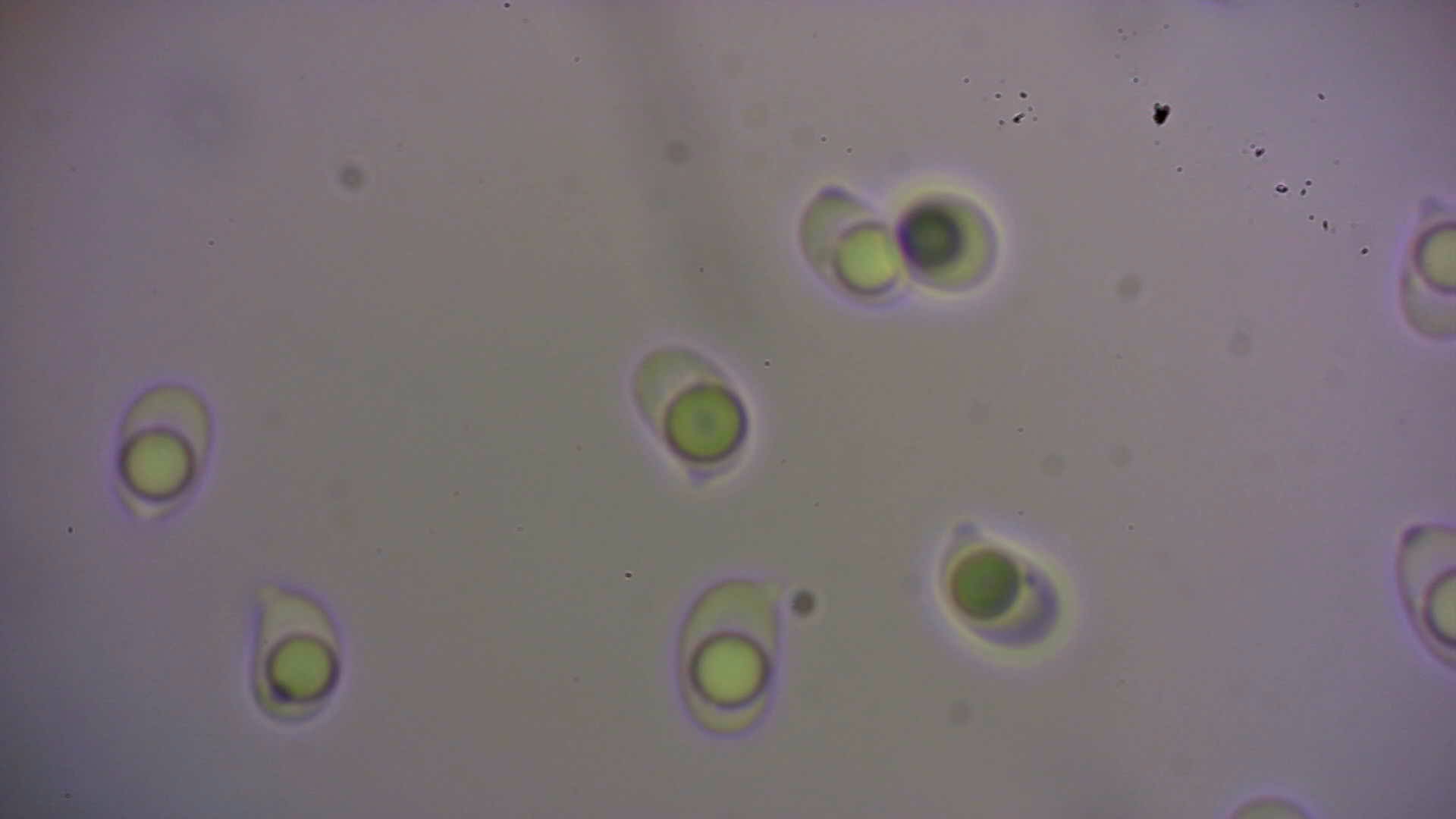 Also habe ich Sporen gemessen von dem FK oben rechts, der eher zu der hellen Sippe gehört. Der ist auch kaum noch schuppig mittlerweile, fast glatt.