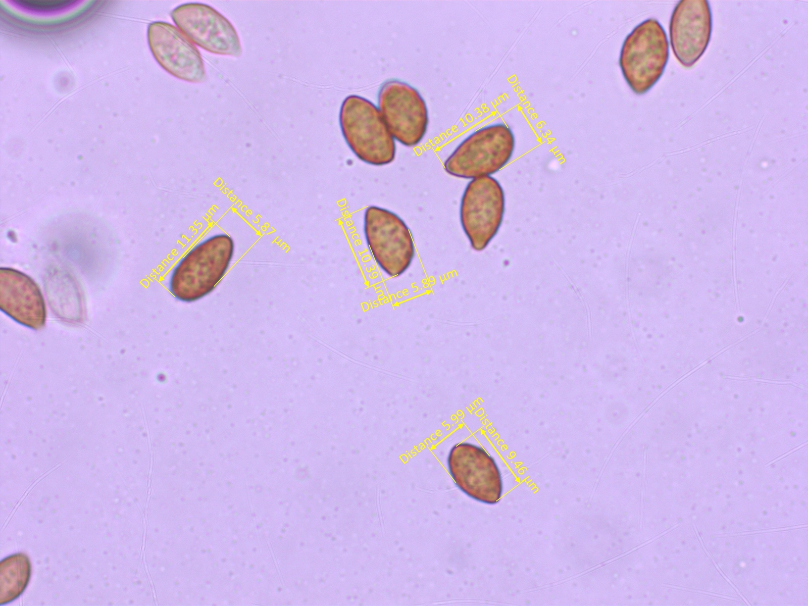 Sporen 9.5-10.7-12.6 x 5.9-6.3-7.2 µm, deutlich warzig