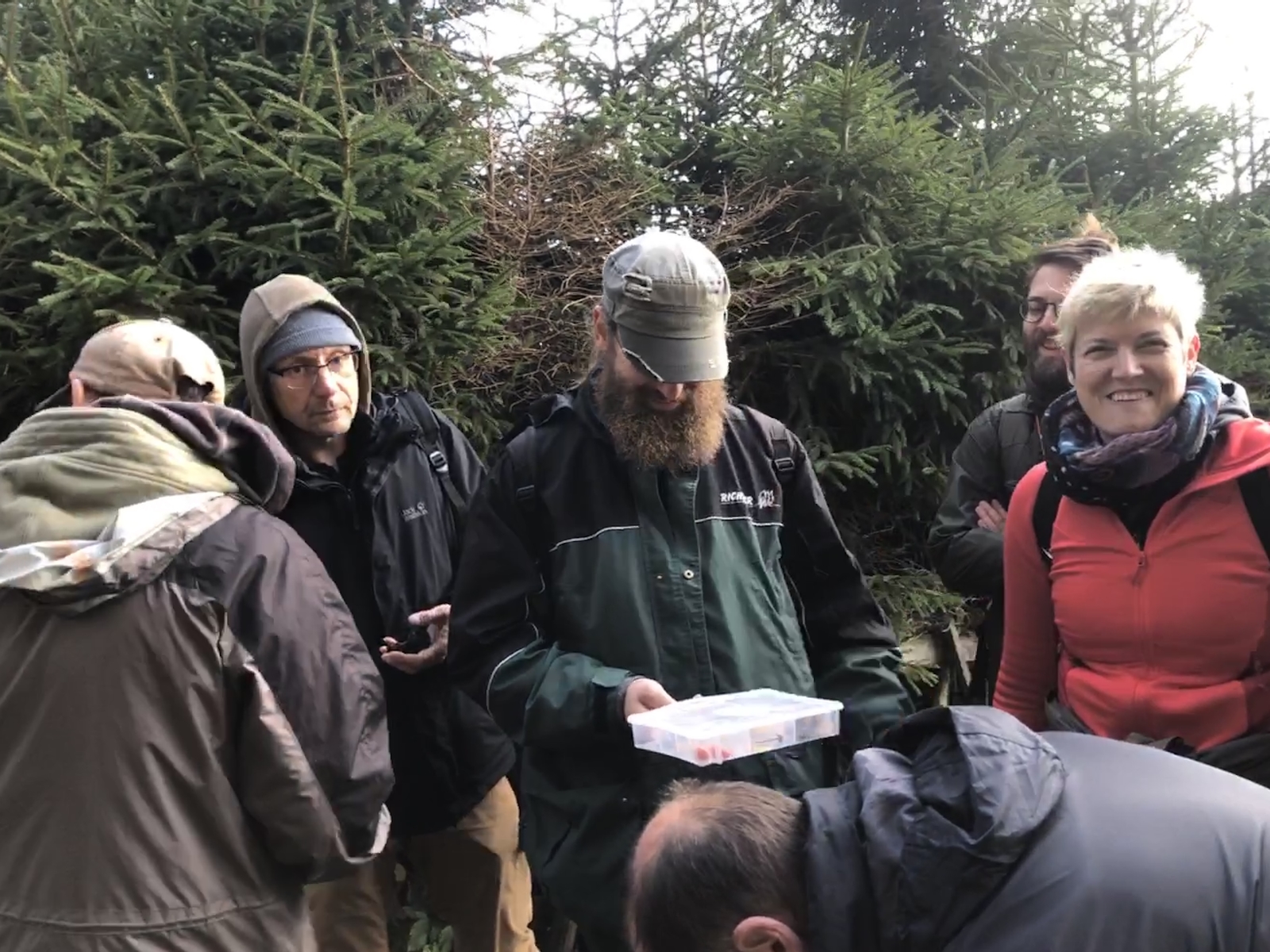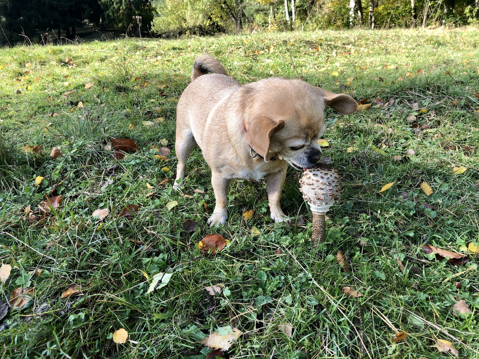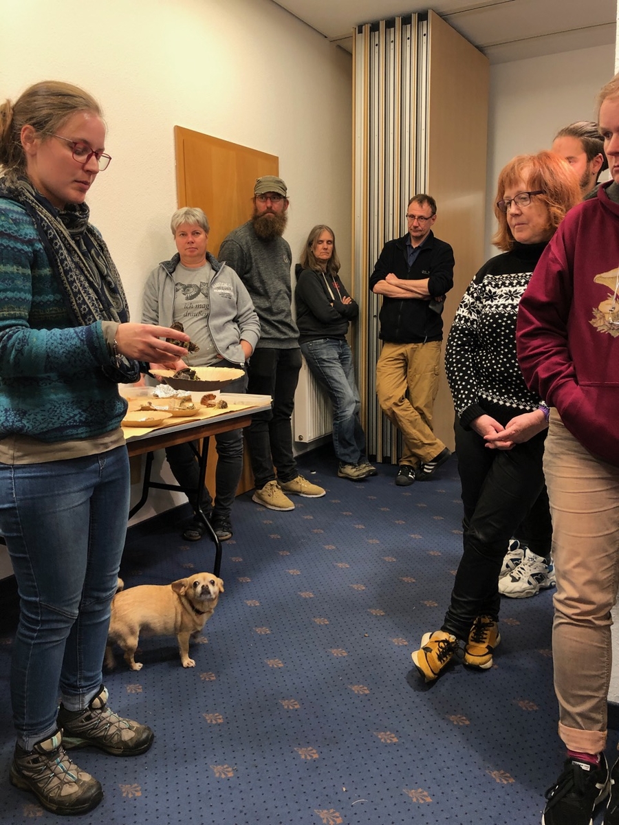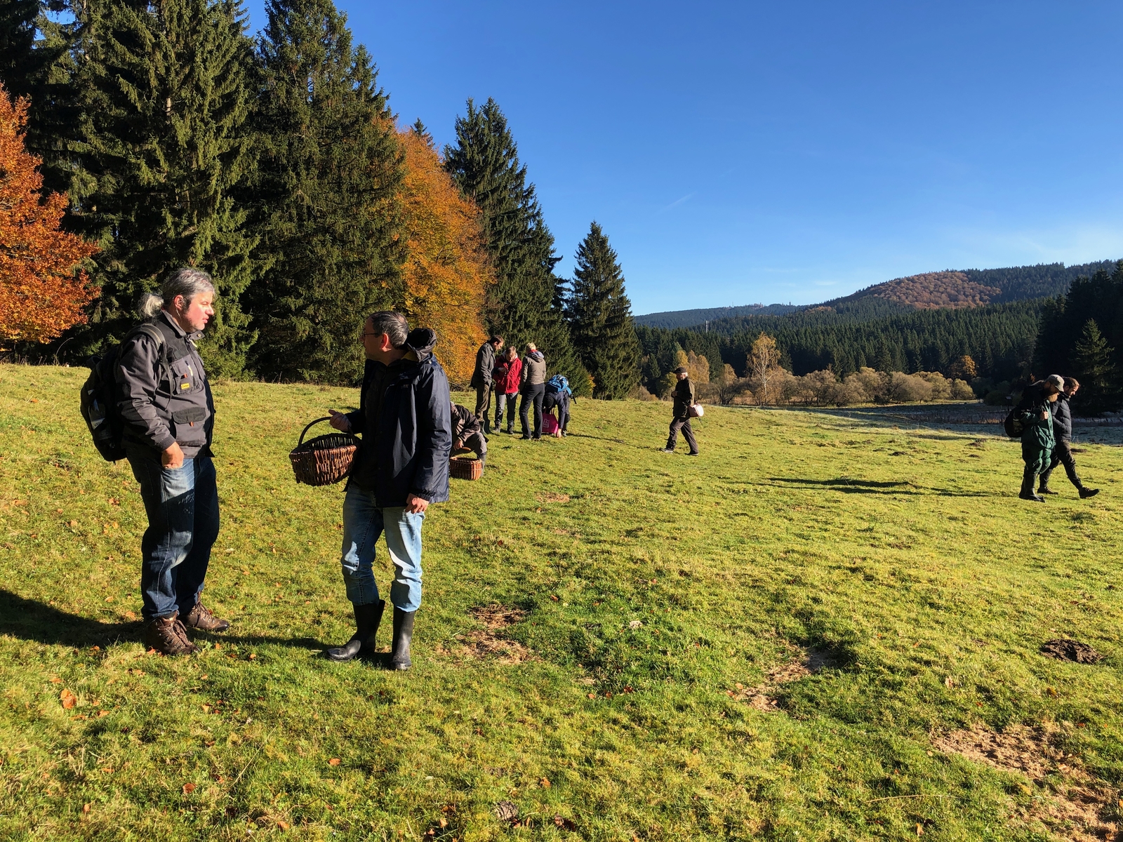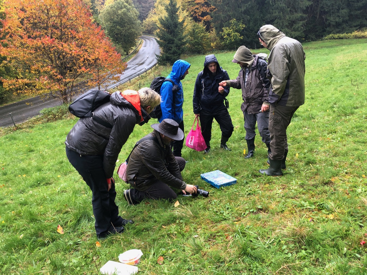 Das fing schon gut an. Wetterwarnung vor Orkan und richtig, ein Baum hätte mir fast der ersten Exkursionstag vermurkst. Der stand nämlich nicht wie er sollte an der Straße, sondern lag auf selbiger. Die Jungs von der Feuerwehr meinten, das würde jetzt dauern. Aber nach zwei Stunden hatten sie es geschafft, so dass ich nur etwas zu spät kam. Die Feuerwehrleute haben allerdings nur die Strumfolgen, nicht den Sturm beseitigen können und so waren die ersten Stunden auf den Wiesen nass und stürmisch aus allen Richtungen. Egal das Pilzteam Felix Hampe, dem ich mich angeschlossen hatte, entdeckte auf der Hünschbachwiese so viele bunte Pilze, dass die Nässe erst so richtig auffiel, als wir wieder ins Auto stiegen und die Scheiben blitzartig anliefen. Glück gehabt. Nur der PSH (Pilzspürhund) hat vorzeitig gekniffen und wollte in den Rucksack. Da hat er den größten Teil der Exkursion verbibbert. Das Team Jochen wurde bei Kleinbreitenbach von Sturm und Regen durch die Wiesenpilze weniger abgelenkt.