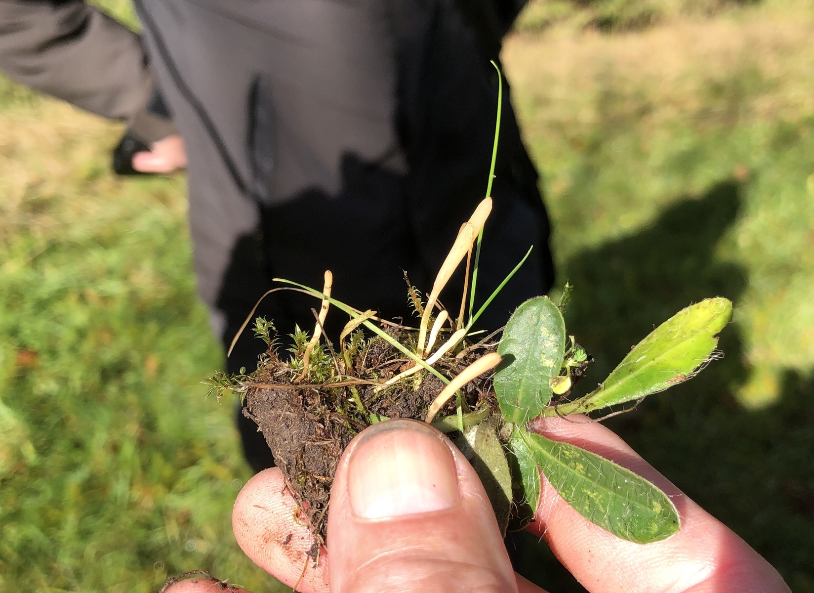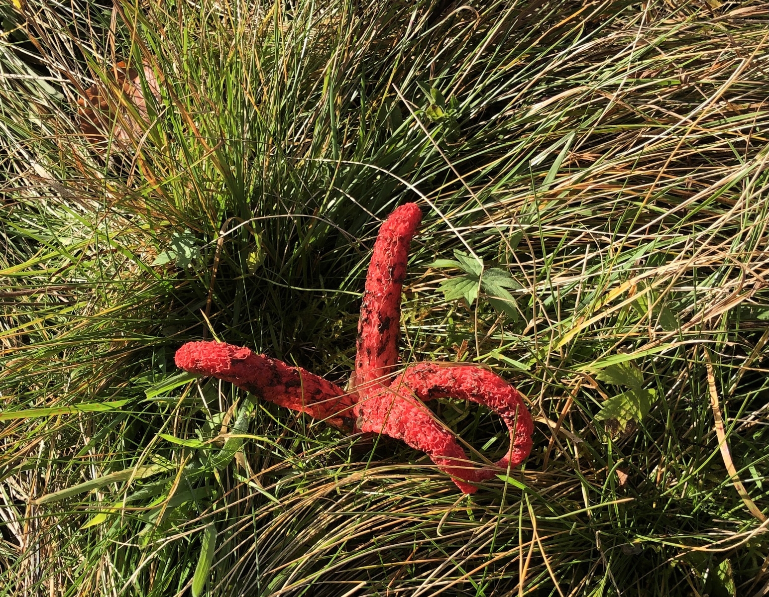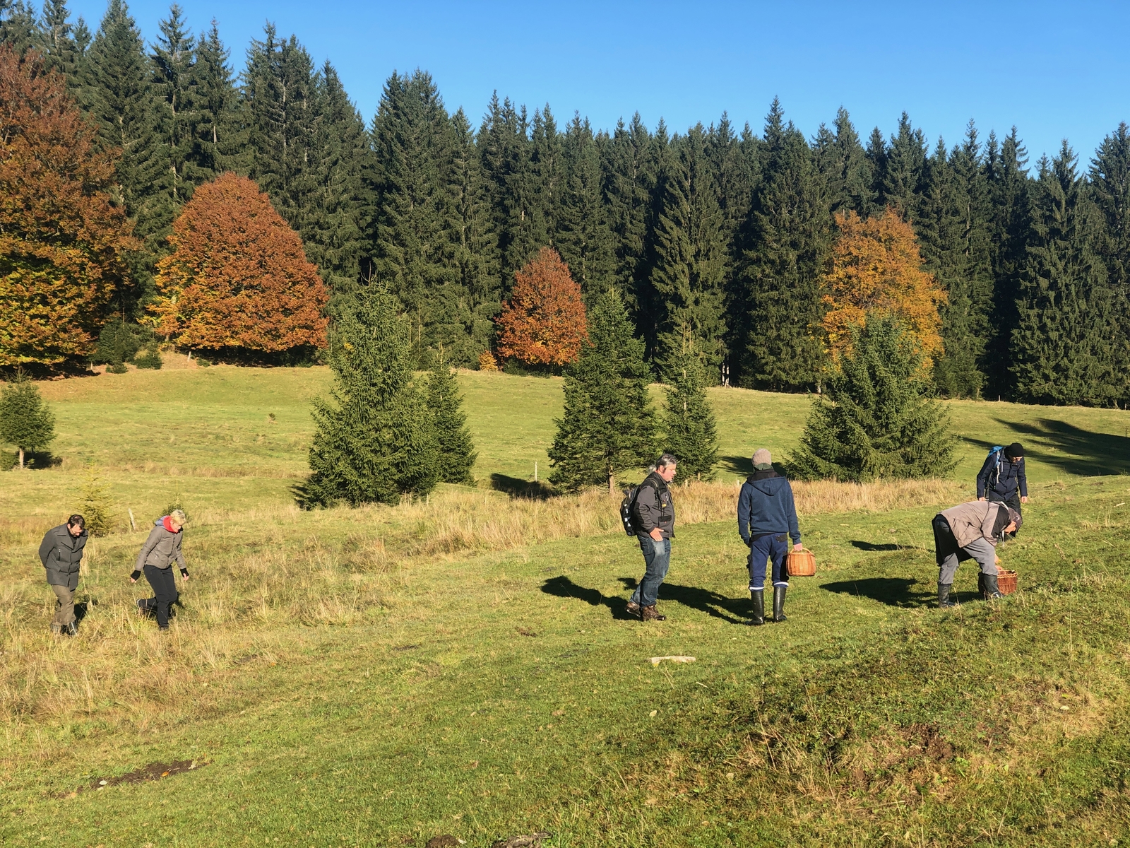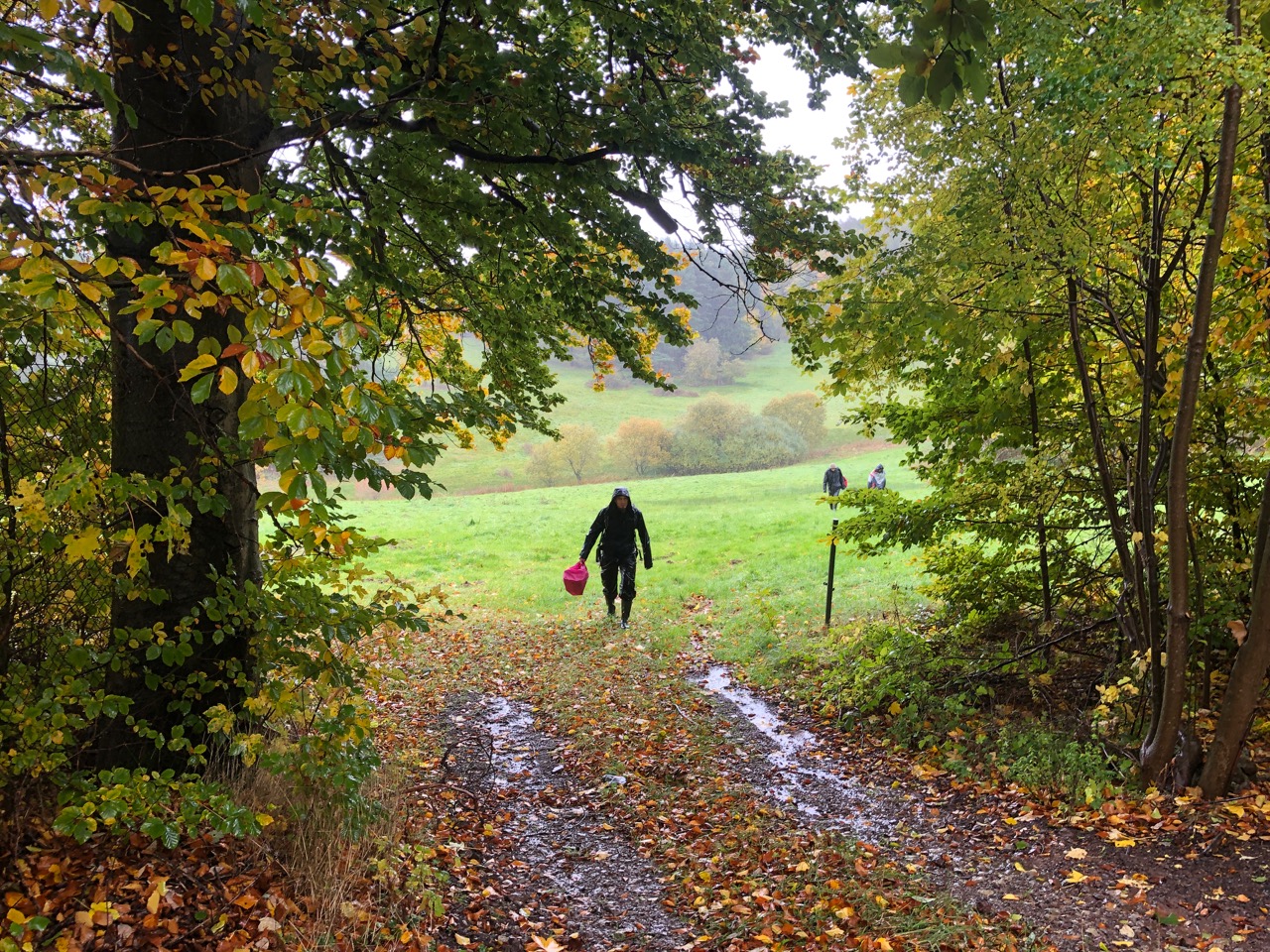 Das fing schon gut an. Wetterwarnung vor Orkan und richtig, ein Baum hätte mir fast der ersten Exkursionstag vermurkst. Der stand nämlich nicht wie er sollte an der Straße, sondern lag auf selbiger. Die Jungs von der Feuerwehr meinten, das würde jetzt dauern. Aber nach zwei Stunden hatten sie es geschafft, so dass ich nur etwas zu spät kam. Die Feuerwehrleute haben allerdings nur die Strumfolgen, nicht den Sturm beseitigen können und so waren die ersten Stunden auf den Wiesen nass und stürmisch aus allen Richtungen. Egal das Pilzteam Felix Hampe, dem ich mich angeschlossen hatte, entdeckte auf der Hünschbachwiese so viele bunte Pilze, dass die Nässe erst so richtig auffiel, als wir wieder ins Auto stiegen und die Scheiben blitzartig anliefen. Glück gehabt. Nur der PSH (Pilzspürhund) hat vorzeitig gekniffen und wollte in den Rucksack. Da hat er den größten Teil der Exkursion verbibbert. Das Team Jochen wurde bei Kleinbreitenbach von Sturm und Regen durch die Wiesenpilze weniger abgelenkt.