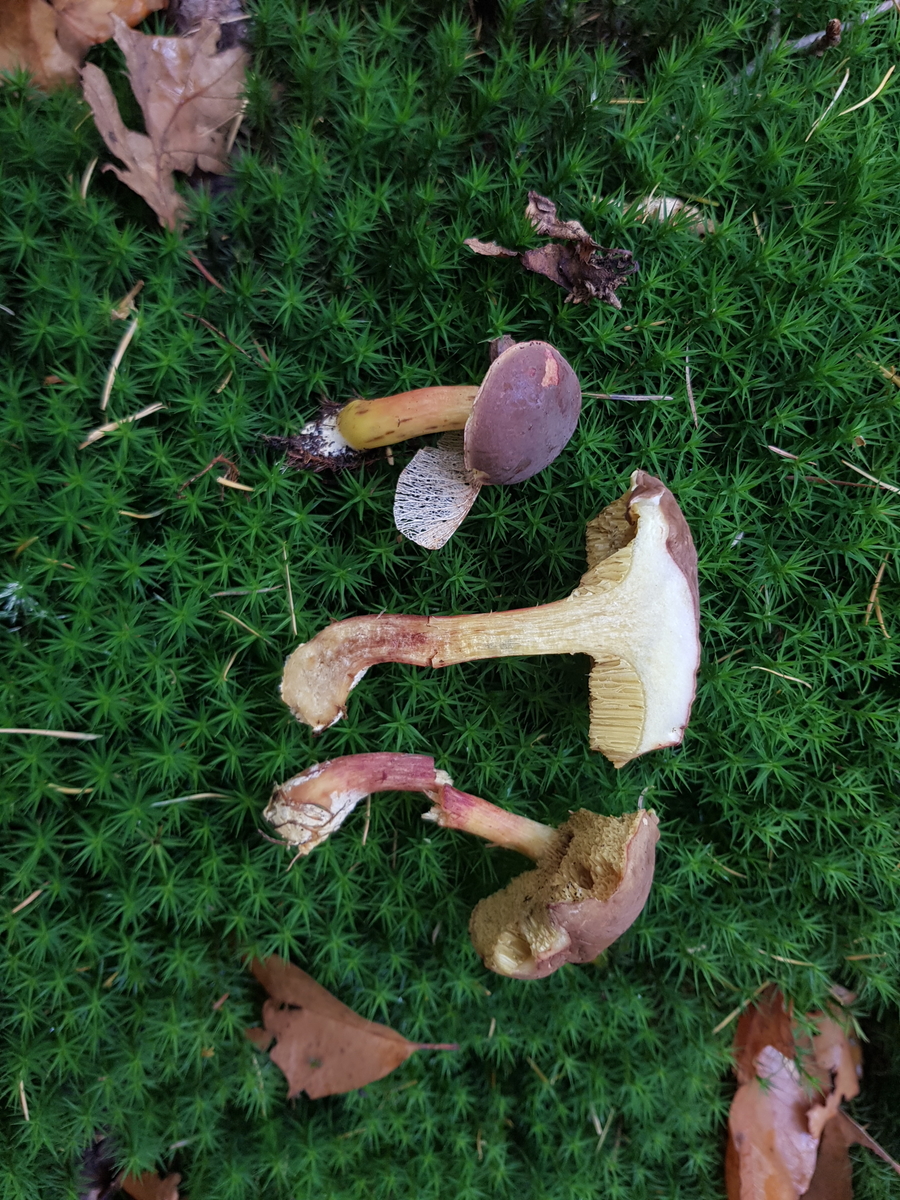 Ich würde hier Kollektion #7 tendenziell auch für Bereifte Rotfüße (Xerocomellus pruinatus) halten - wobei ich davon ausgehe, daß bei der Aufnahme die Lichtverhältnisse reichlich gelb aus dem Hutfleisch verschluckt haben. Solche vereinzelten rötlichen fasern im Stielfleisch können unter bestimmten Bedingungen auch mal bei pruinatus auftreten.